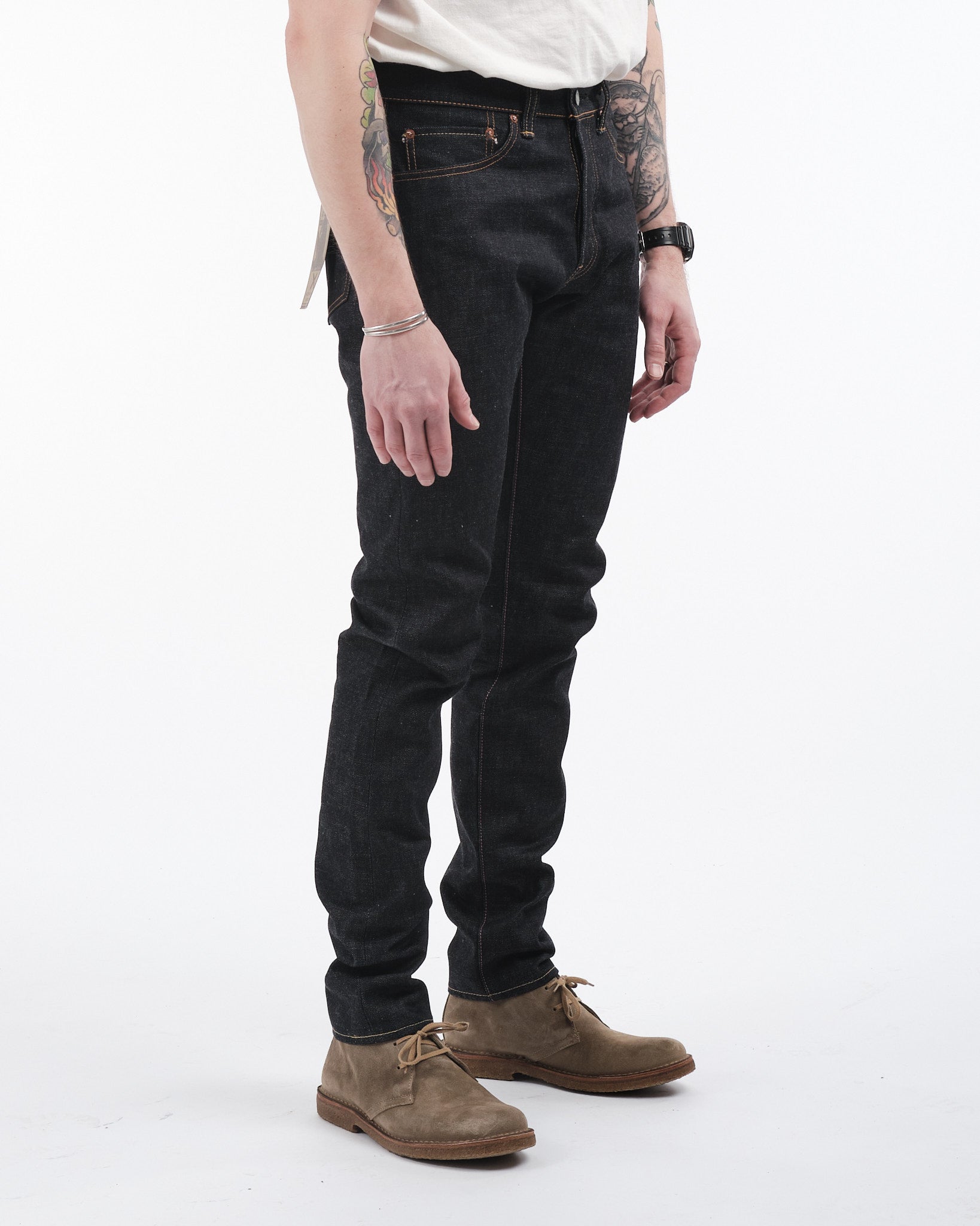0405 "High Tapered" pasformen er en søskende til den naturlige taper, der tilbyder en slankere profil på tværs af dens funktioner. Med en mindre høj stigning og mere stram lår, snævrer jeansene aggressivt ned til en tilpasset benåbning, hvilket appellerer til dem, der foretrækker "skinny jean" styling. Stoffets lavspændingsvævning og noppede tekstur udvikler sig med brug, og lover et individuelt look, som det indigofarvede falmer.