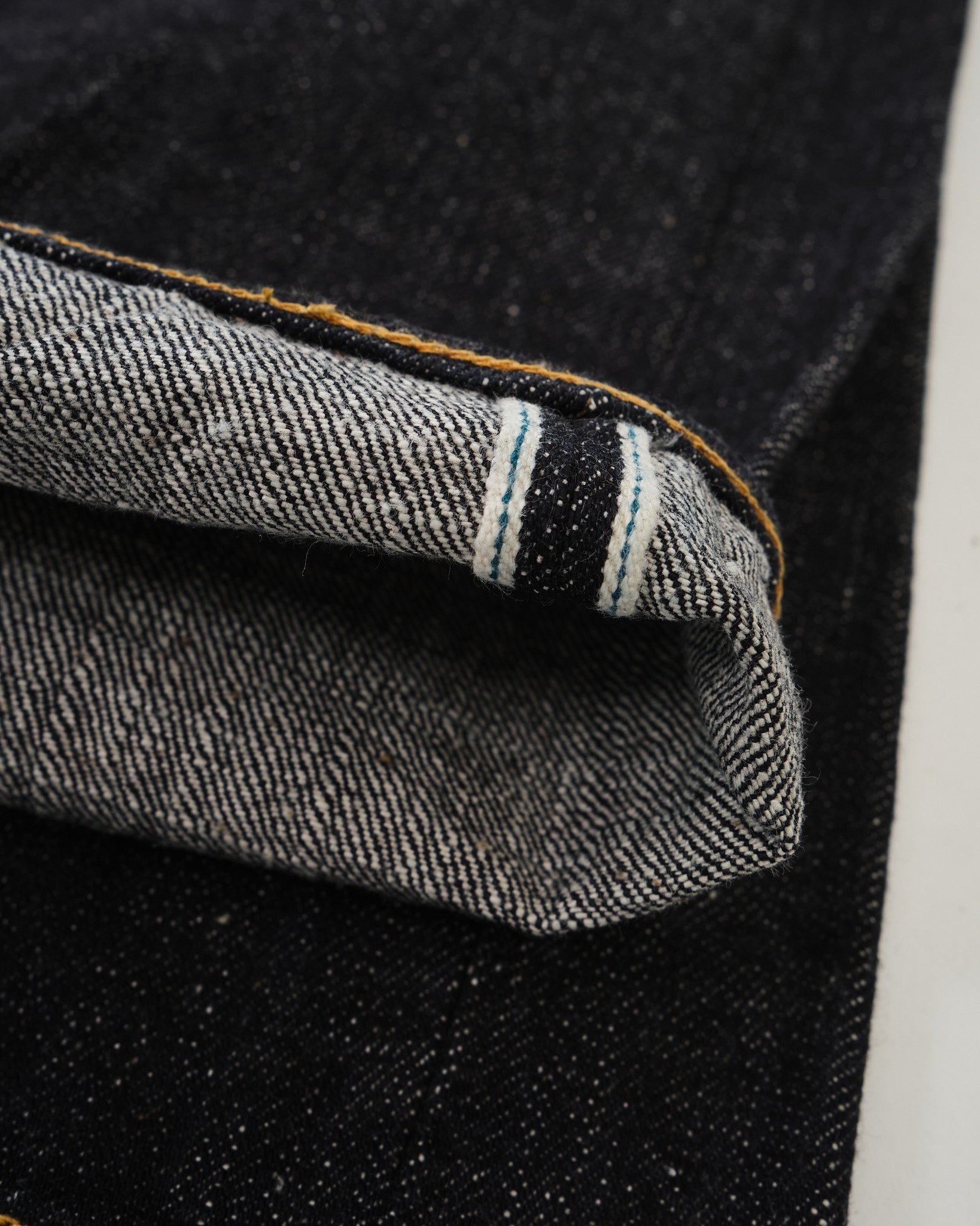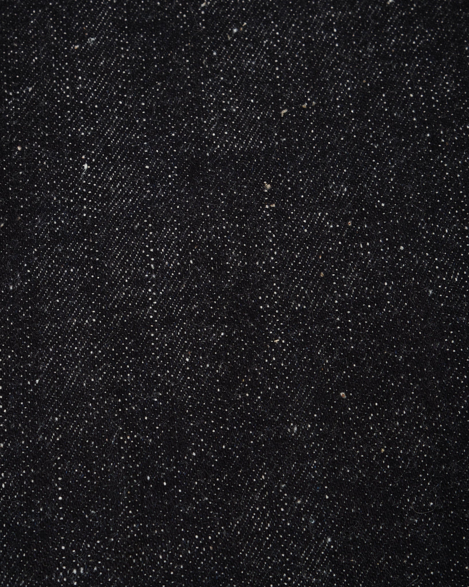 The fabric is a rugged 15.5oz denim woven on vintage Toyoda shuttle looms. The warp yarns are heavily slubbed for pronounced texture, while the weft incorporates nep yarns spun from recycled cotton. This combination creates a denim that develops bold vertical fades and a one-of-a-kind aging process. Low-tension weaving gives the fabric a rough, tactile quality and depth of character.