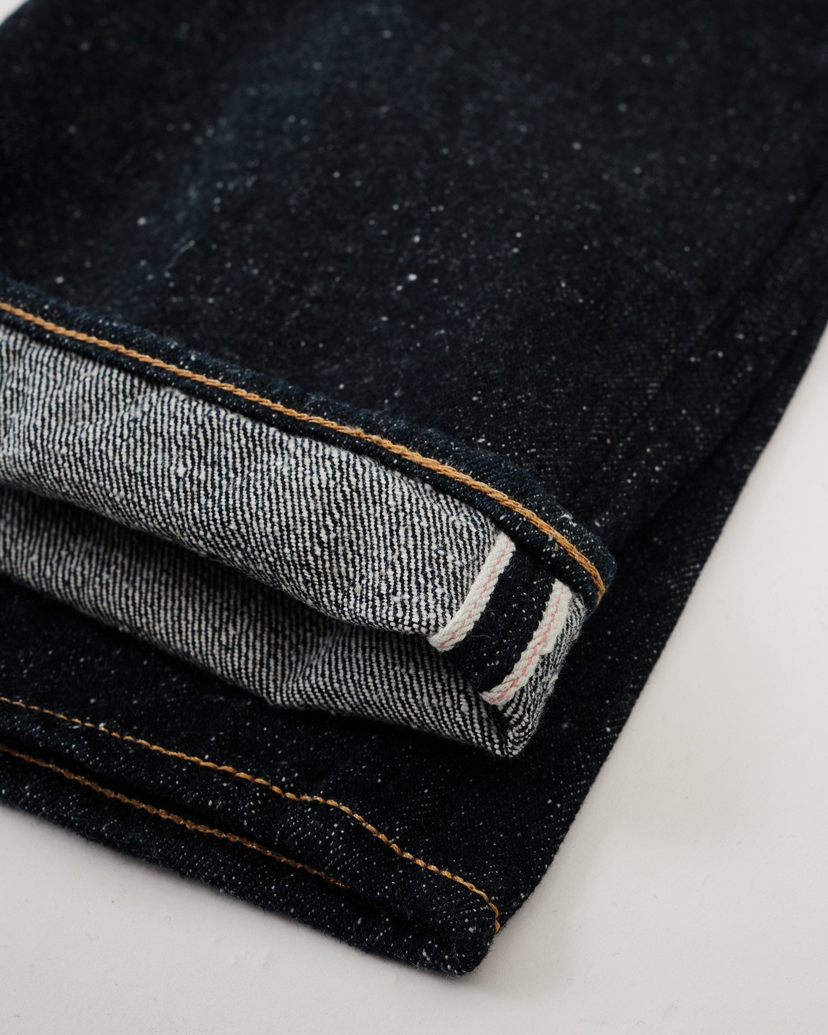Reb-farvet i 100% ren indigo, udvikler garnet en dyb blå overflade med en rå kerne, hvilket tillader skarpe og høj-kontrast fades over tid. Vævet på en 1950'ernes GL8 Toyoda Automatisk Væv, fanger den langsomme, velovervejede vævning luft inden i stoffet, hvilket forbedrer dets tekstur og holdbarhed.
