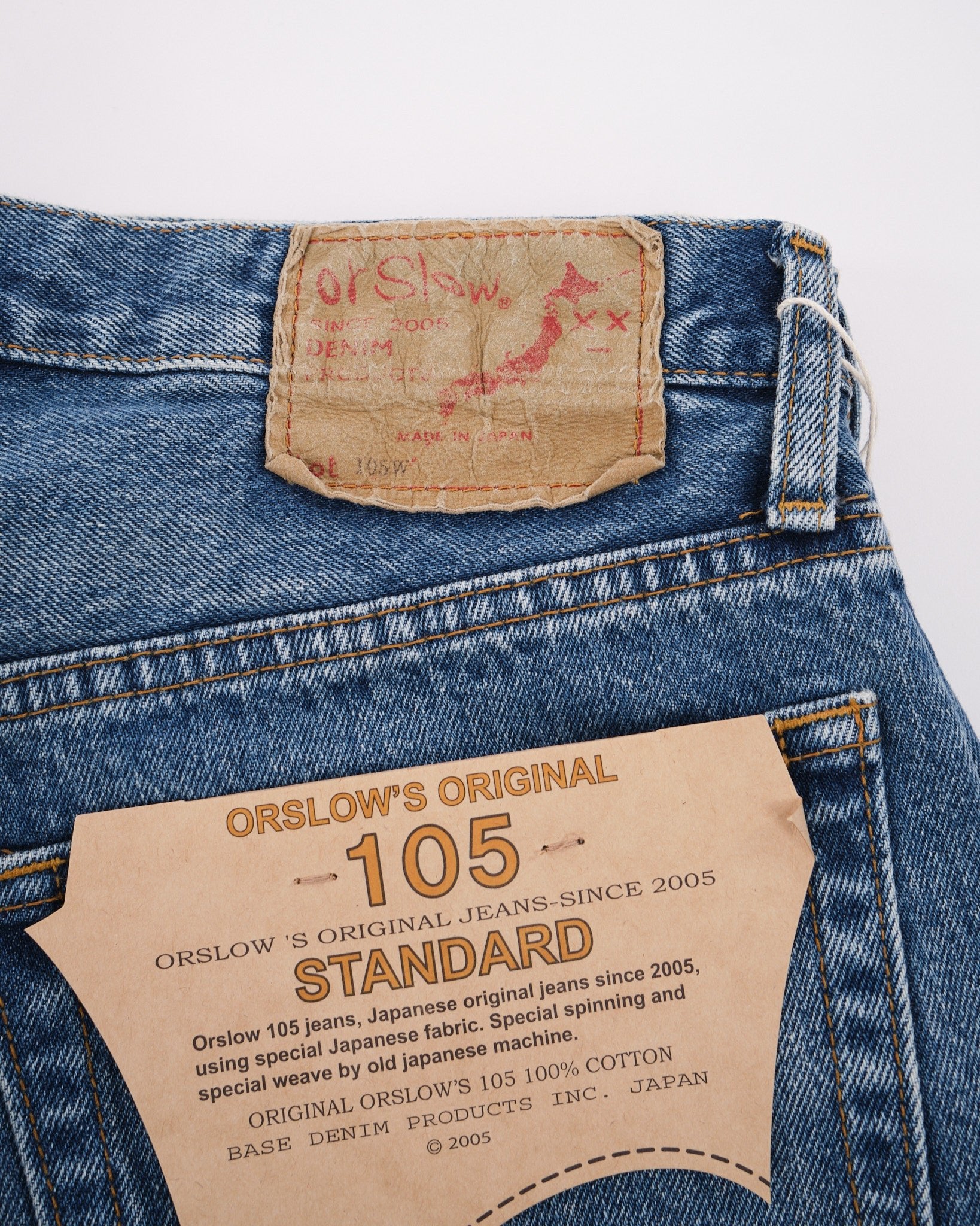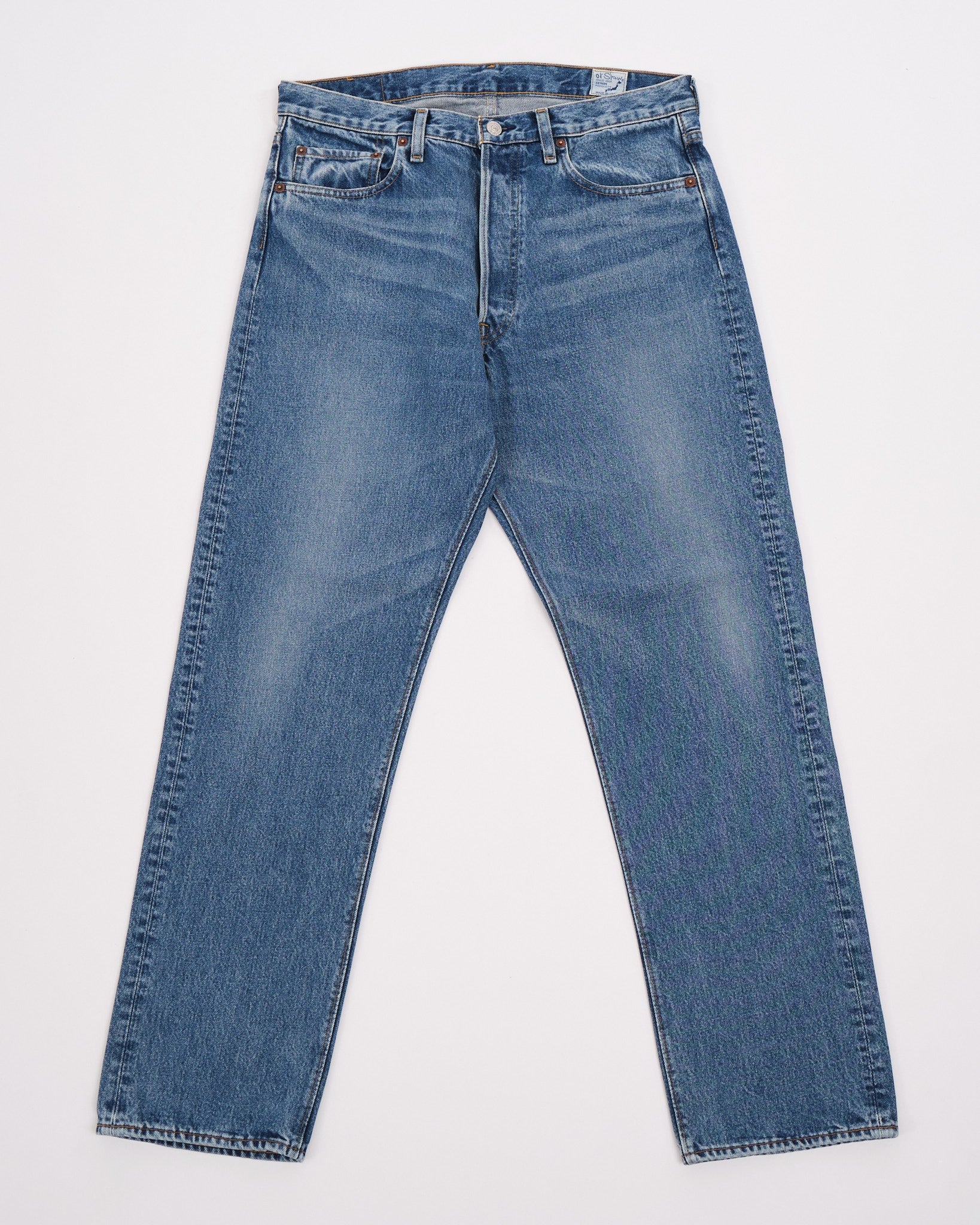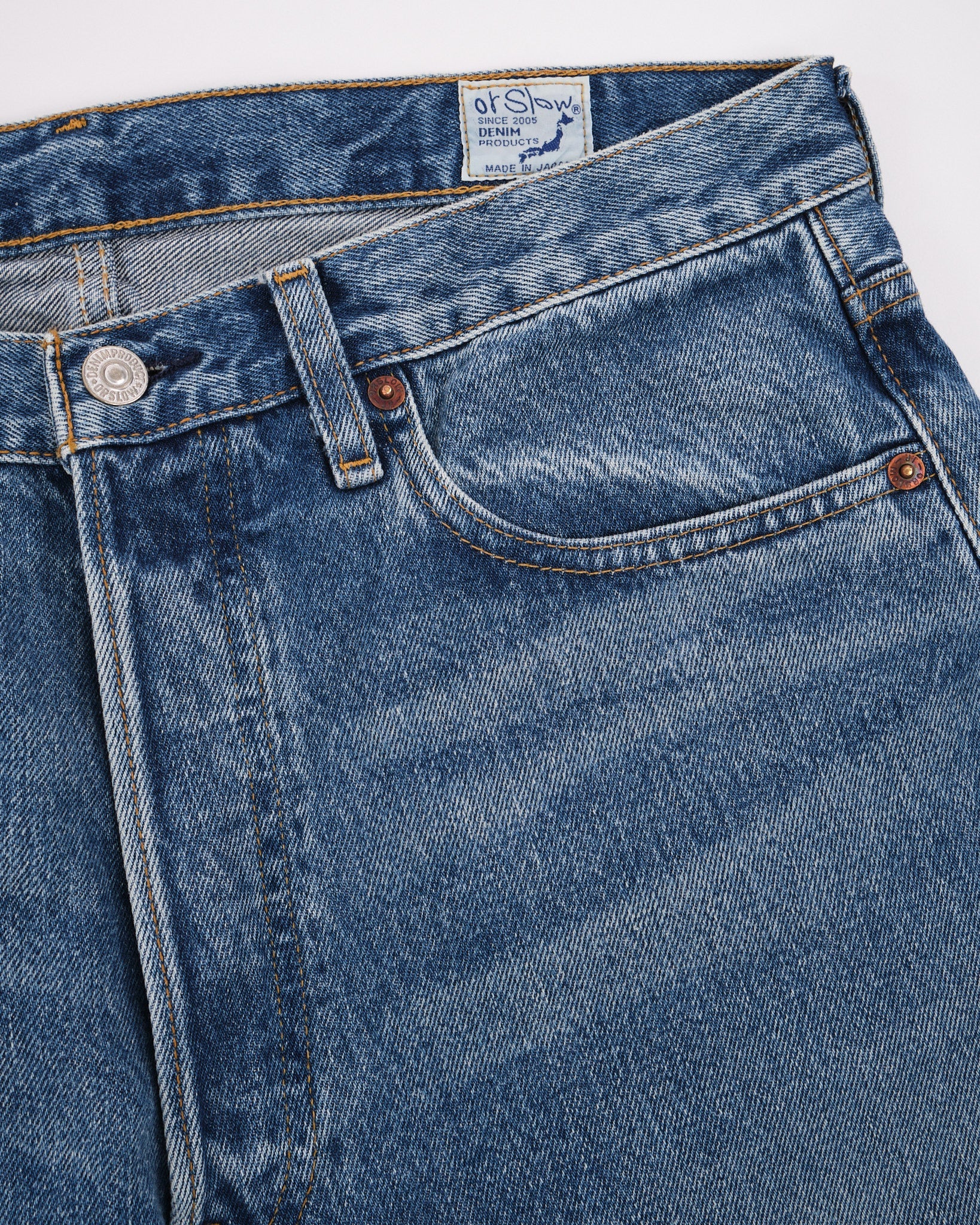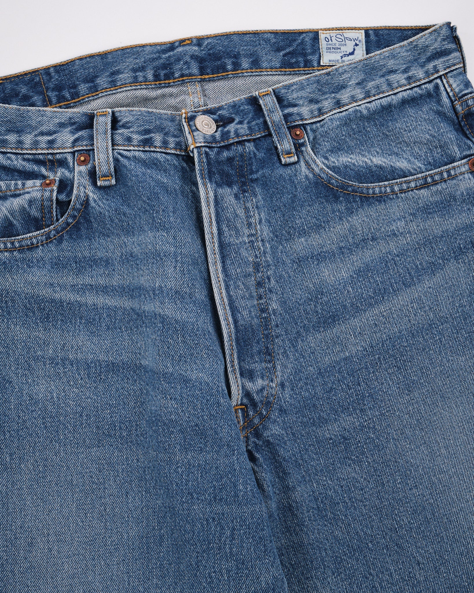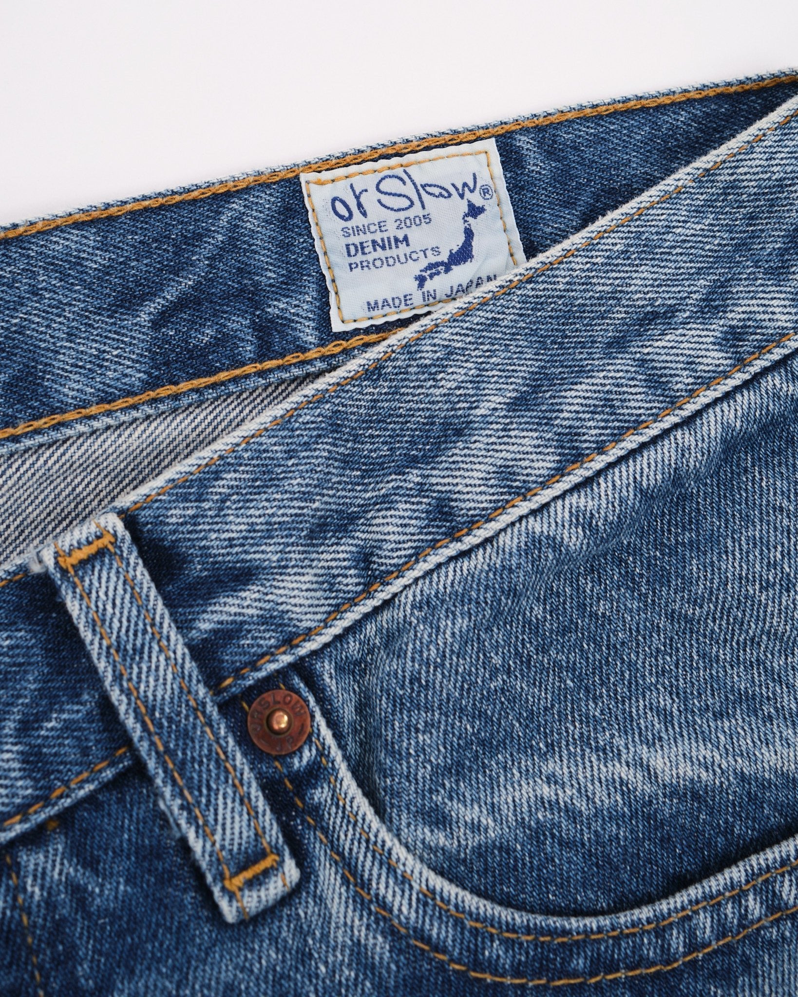 Træd ind i det 20. århundrede med orSlows 105 90'ernes Denim Brugte jeans. Disse jeans henter inspiration fra denim fra forgangne tider, før produktionen flyttede udenlands. De fanger virkelig essensen af 80'erne og 90'erne. Fremstillet af 13,5 oz selvedge denim reflekterer disse jeans de betydelige fremskridt inden for denimproduktion i den æra. Skiftet fra shuttle til projektil- og rapier vævningsteknikker muliggjorde en mere effektiv denimproduktion, hvilket resulterede i stærkere jeans og øget effektivitet. Måden lommer blev påsat, valget af sytråd og endda selve sy metoden gennemgik en revolution, da maskinsyning erstattede håndsyning, mens holdbare polyestertråde blev omfavnet. Den ensartede lommefacon og den glatte udtryk af vævet denim er andre definerende træk ved den tidsperiode, alt sammen trofast fanget i orSlows 105W model.