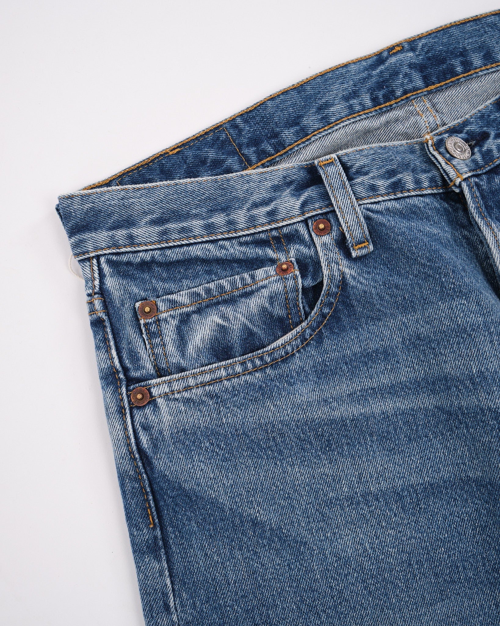 • Har ensartede lommeformer og glattere denimtekstur, karakteristisk for æraen.