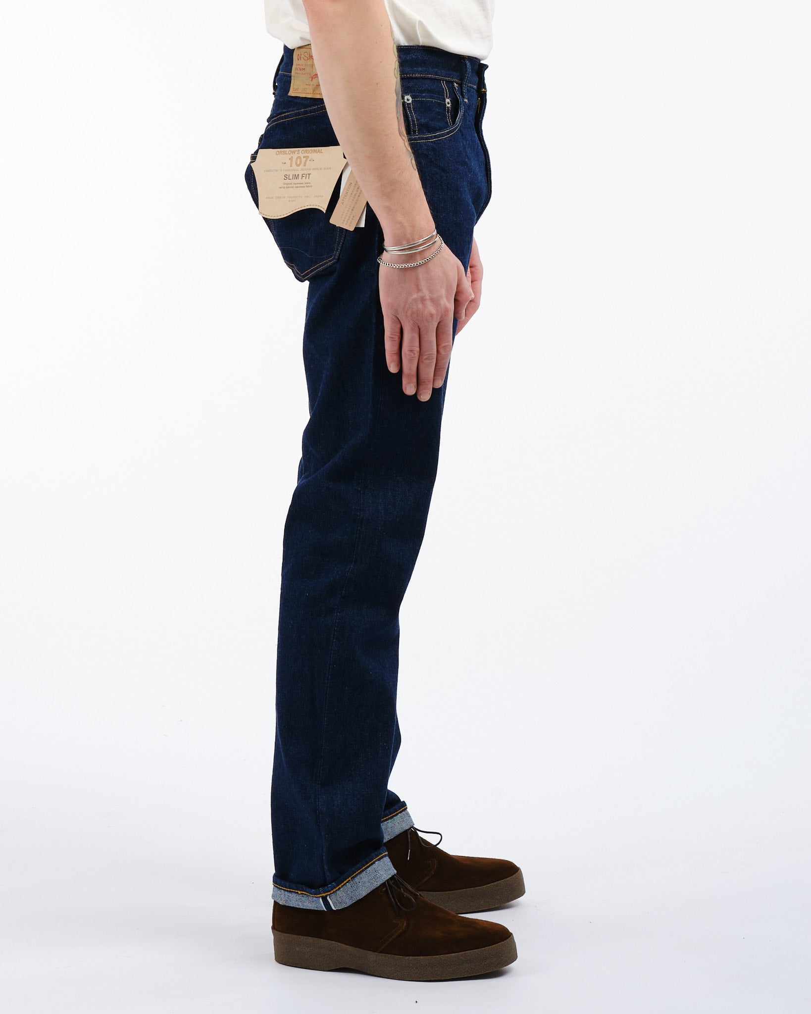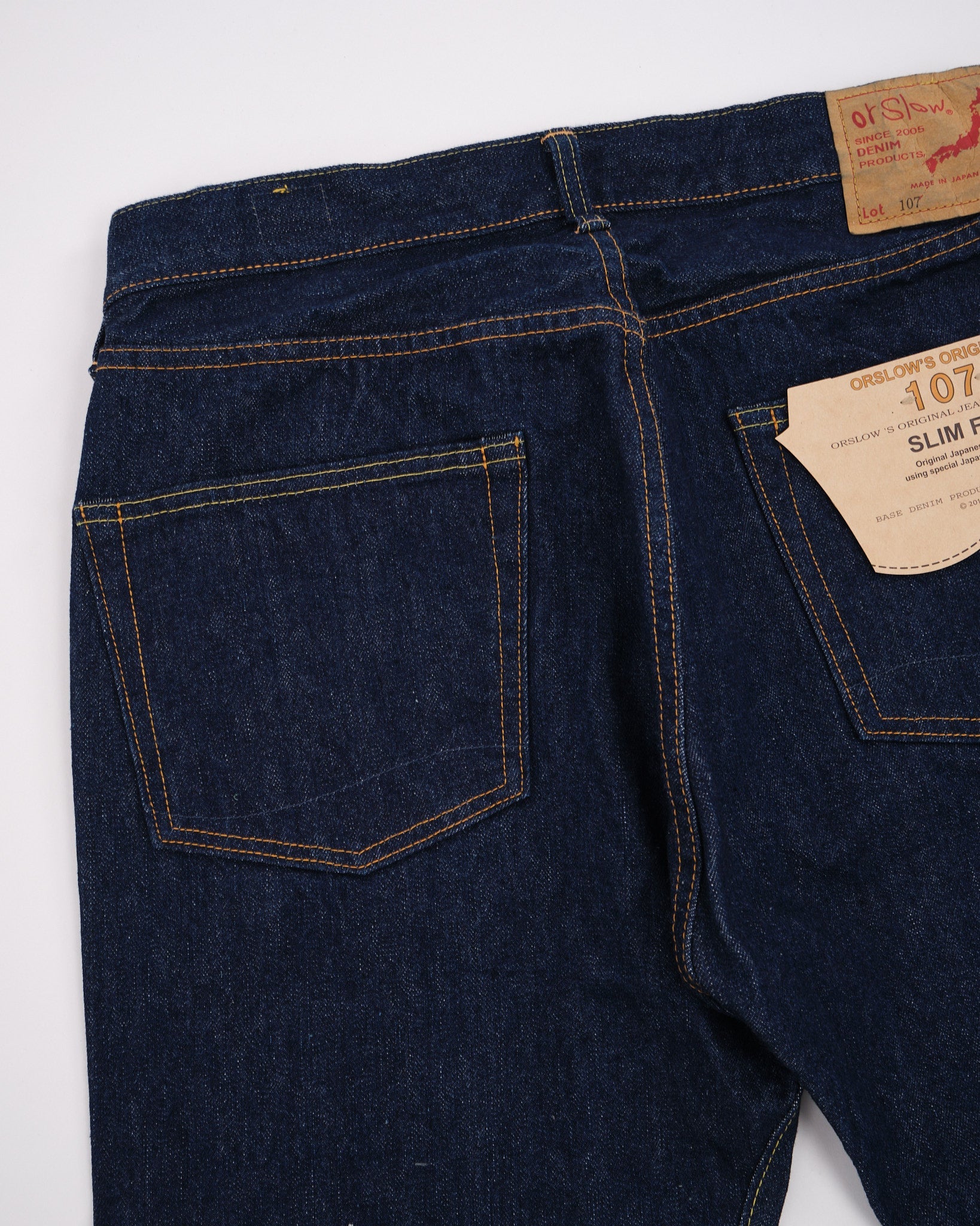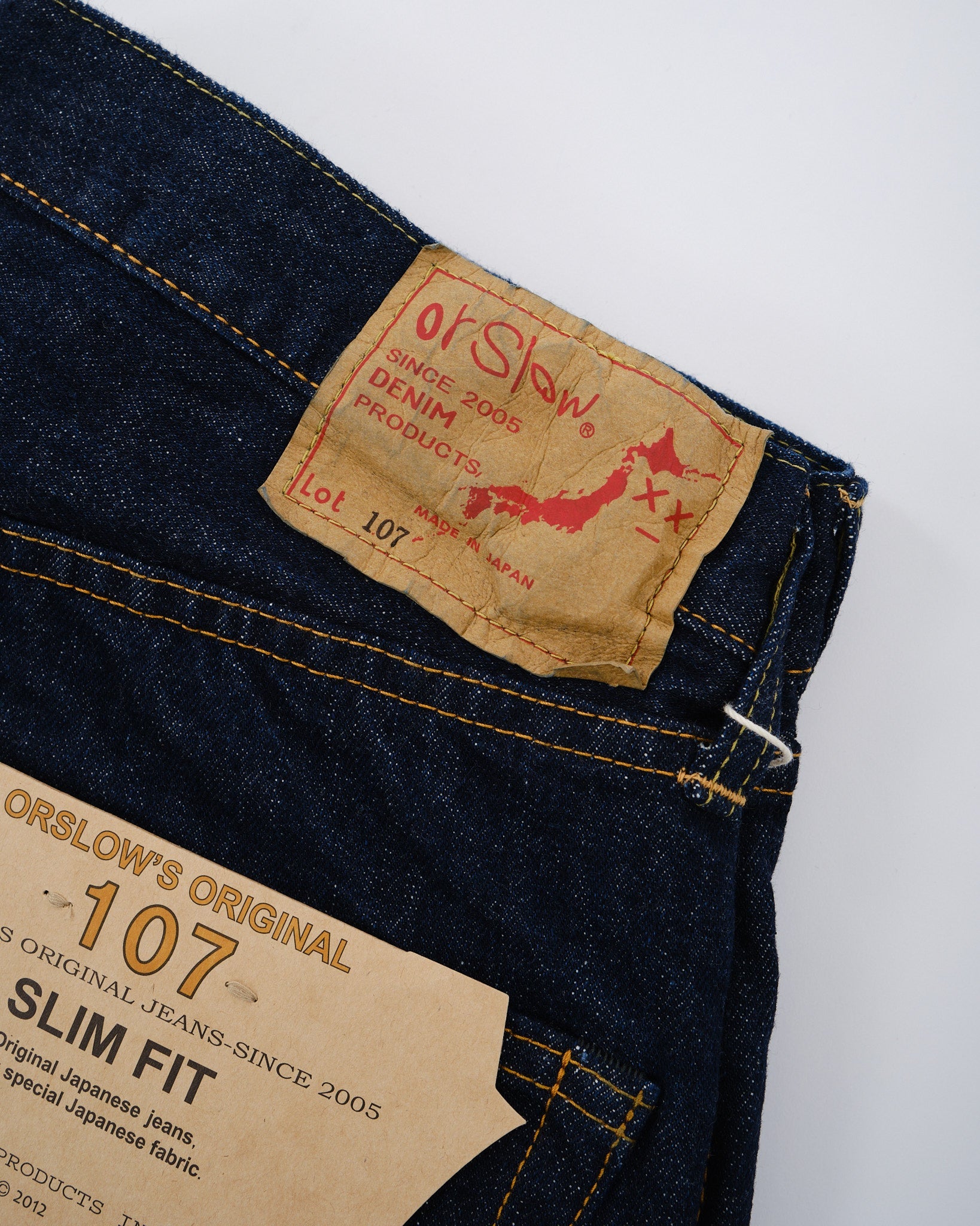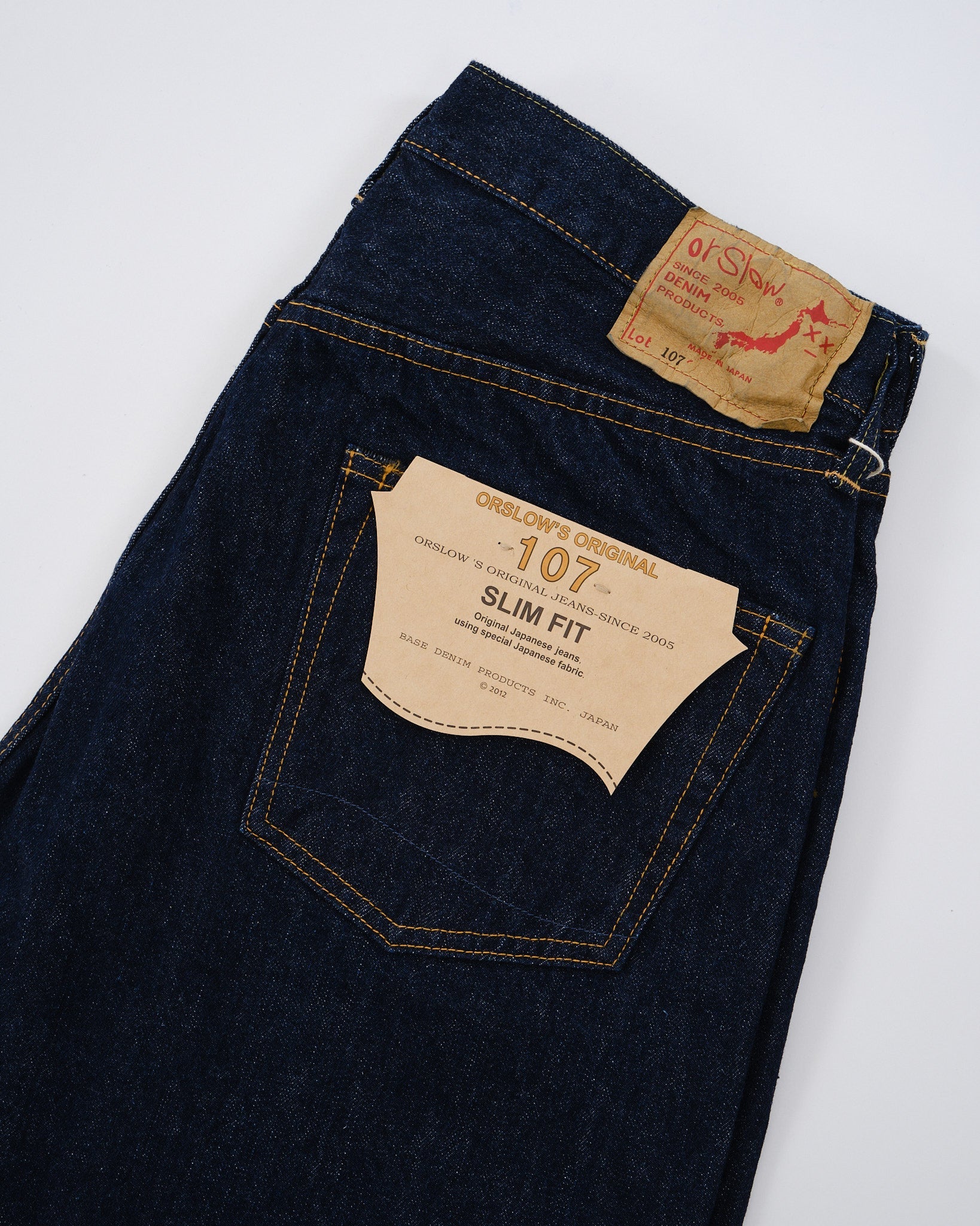 Præsenterer 107 Ivy Fit Selvedge Denim One Wash jeans fra orSlow, som repræsenterer en opdatering til 105-designet. Disse lige jeans med 5 lommer, der oprindeligt blev introduceret i 2009, har en lynlås som et bemærkelsesværdigt karakteristisk træk. Inspireret af Ivy League-studerende fra 1960'erne på østkysten, har de fået navnet "Ivy Fit". Stoffet er fremstillet af garn med en stærk twist, hvilket giver det en karakteristisk stivhed og glans. Fremstillet af originalt selvedge denim, der vejer 13,7 oz, opnår disse jeans en balance mellem nutidig elegance og tidløs appel