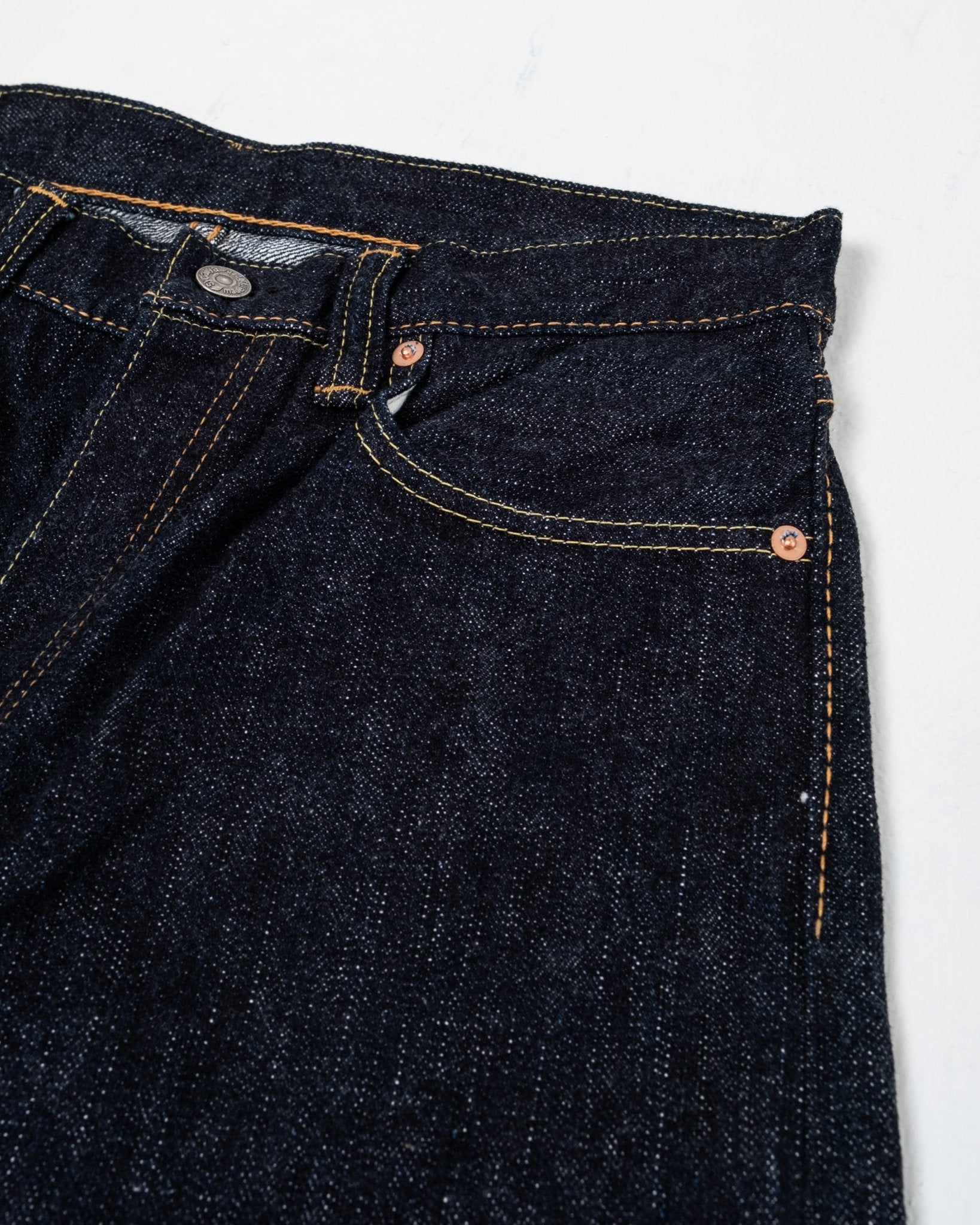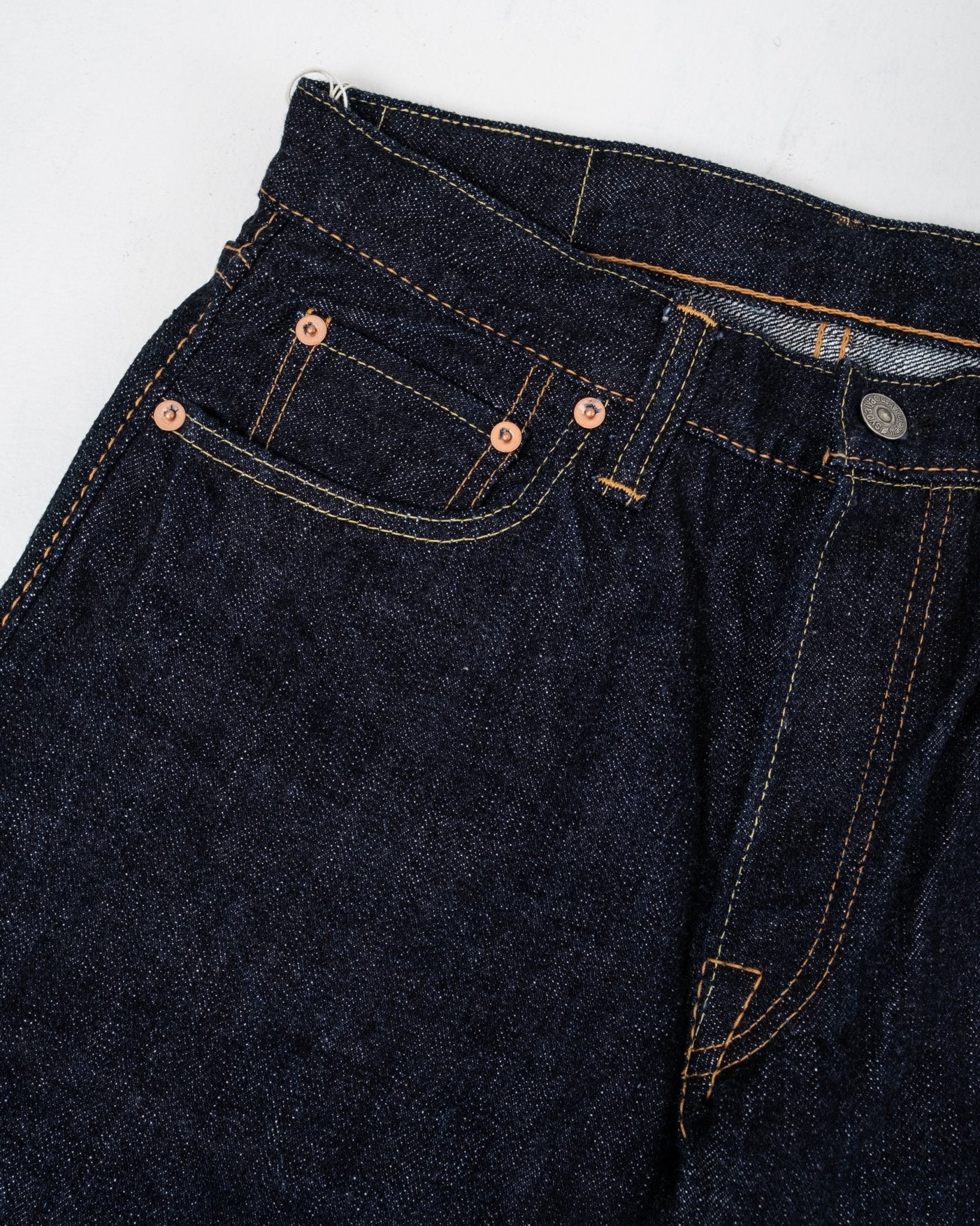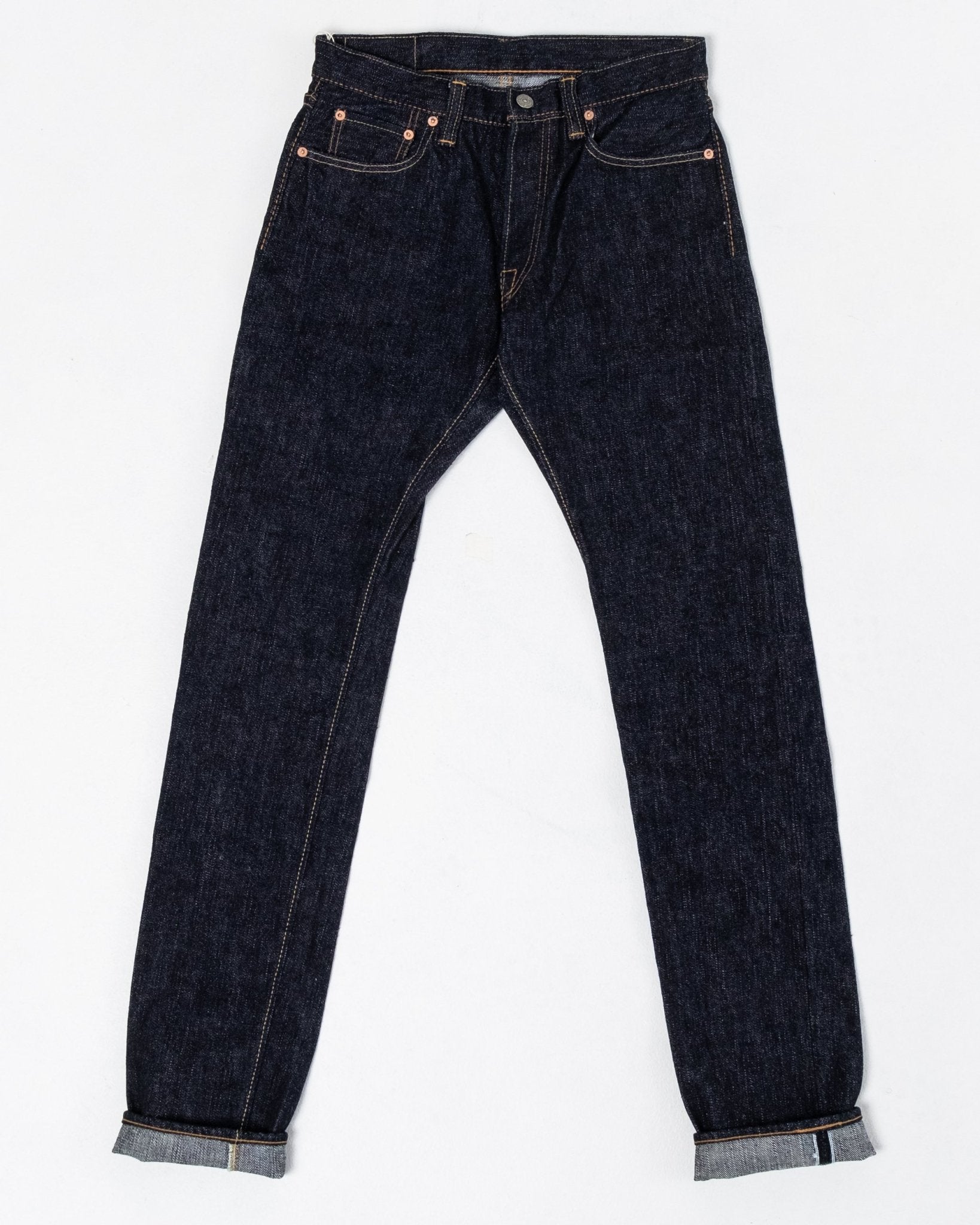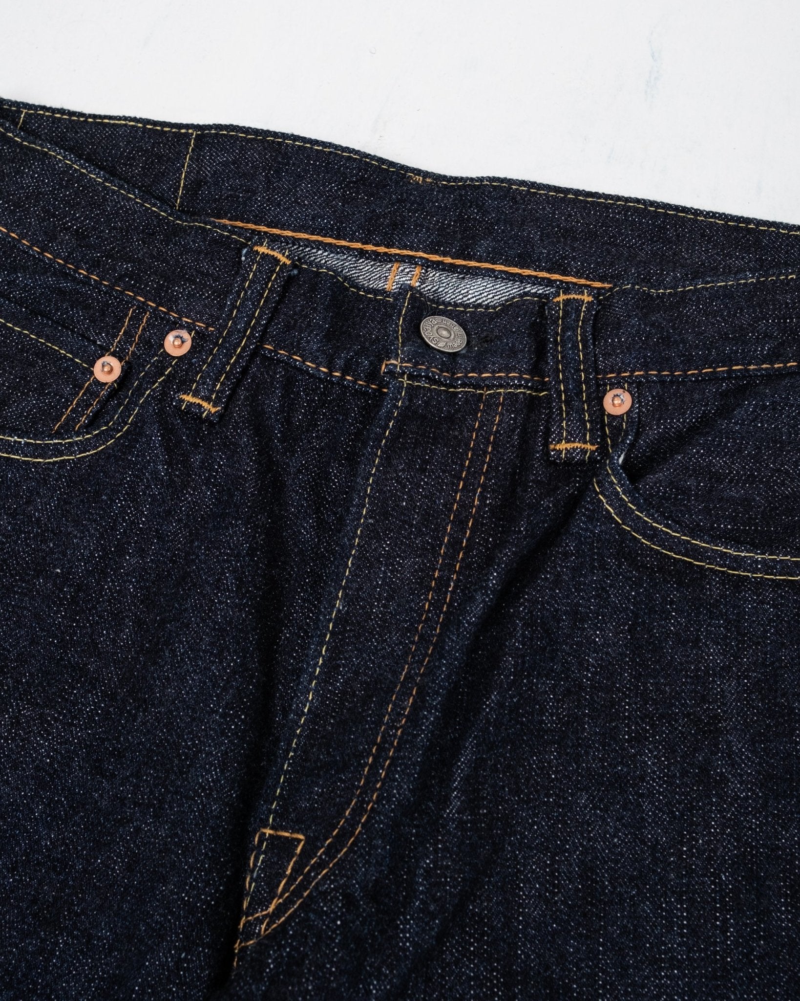 14 Oz Tapered Slim Wash Indigo XX-013 fra Pure Blue Japan. Stoffet, der er brugt, er et 14 oz råt denim, som er blevet vasket én gang for en mere behagelig pasform, og også fordi så behøver du ikke bekymre dig om krympning, når du vasker dem. Fremstillet med et modificeret lavspændings-skyttelvæv og rebfarvet med rent indigo. Resultatet er stoffets smukke slubstruktur. Alle Pure Blue Japans klassiske jeans er lavet af denim fremstillet fra en enkelt væv, hvilket betyder, at den årlige produktion er utrolig begrænset. Fremstillet i Japan.