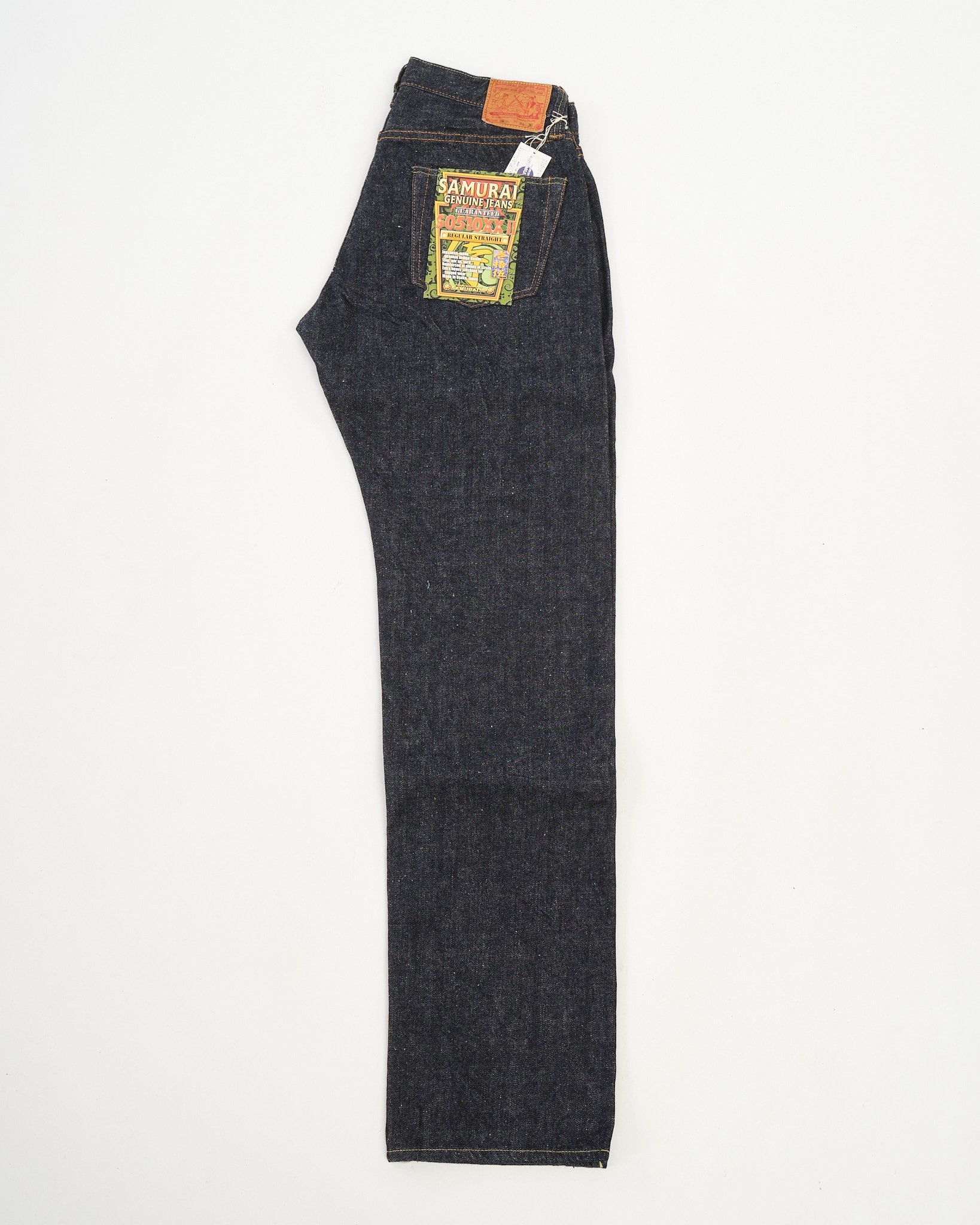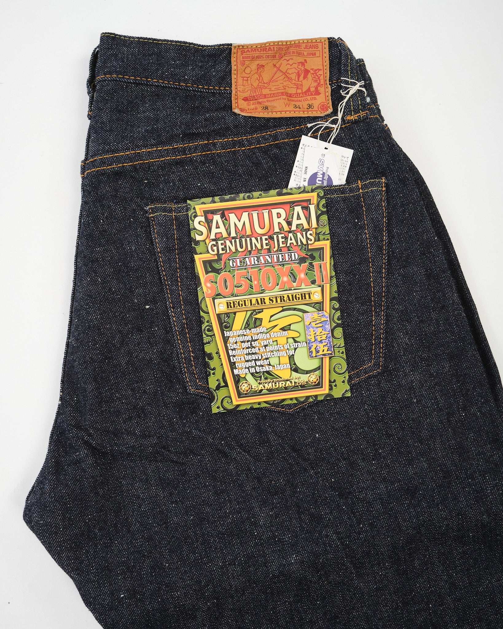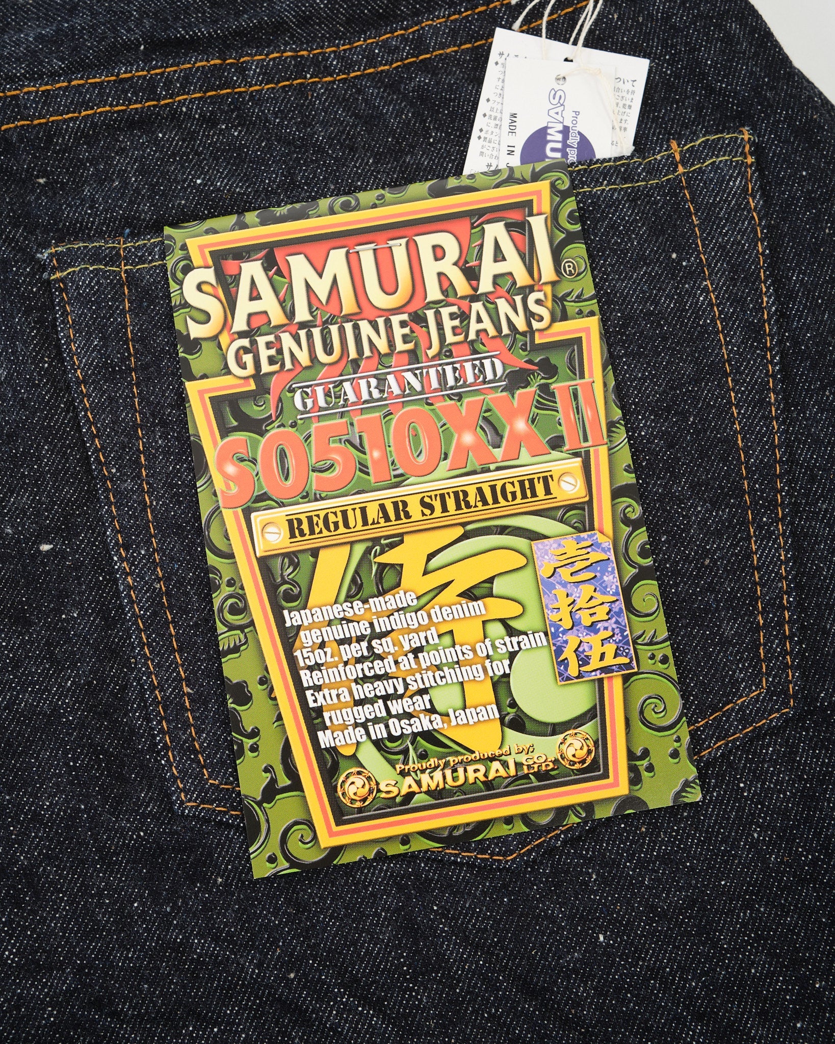 Den S0510XXII står som en sand repræsentant for Samurai Jeans: en 15oz regulær straight cut lavet af mærkets ikoniske Otokogi selvedge denim. Vævet af slubbede #6 bomuldstråde med stykker af bomuldsaffald efterladt i blandingen, skubber dette stof vintage væve til deres grænser, hvilket producerer en robust, ujævn tekstur, der udvikler sig til skarpe, højkontrast fades.