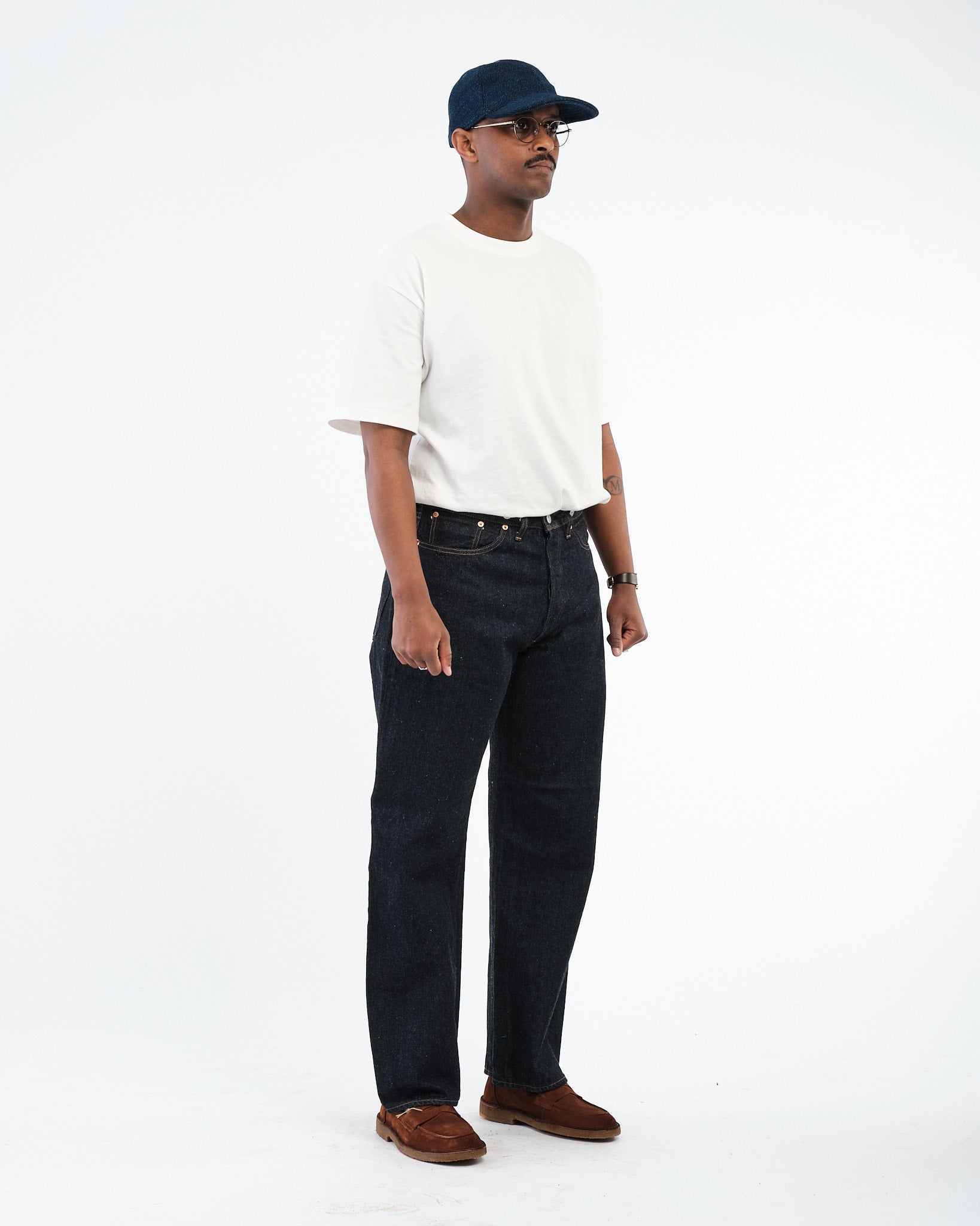 Denimen er vævet med lav spænding på en gammel vævemaskine, en langsom og bevidst proces, der giver stoffet en unik, ujævn tekstur, der fanger essensen af 1940'ernes denim højdepunkt. Når du bærer og vasker disse bukser, fordybes nuancen og karakteren, hvilket resulterer i et virkelig personliggjort look, der udvikler sig over tid.