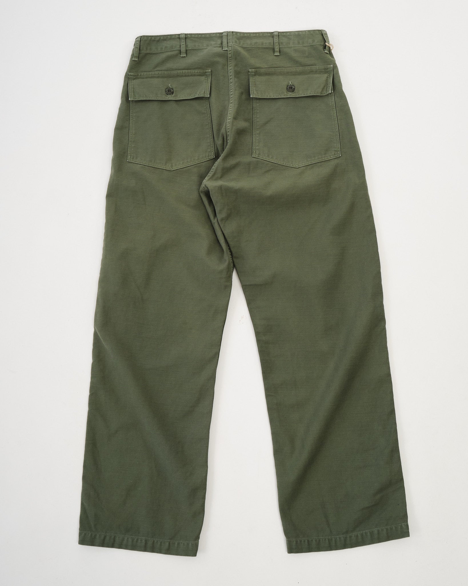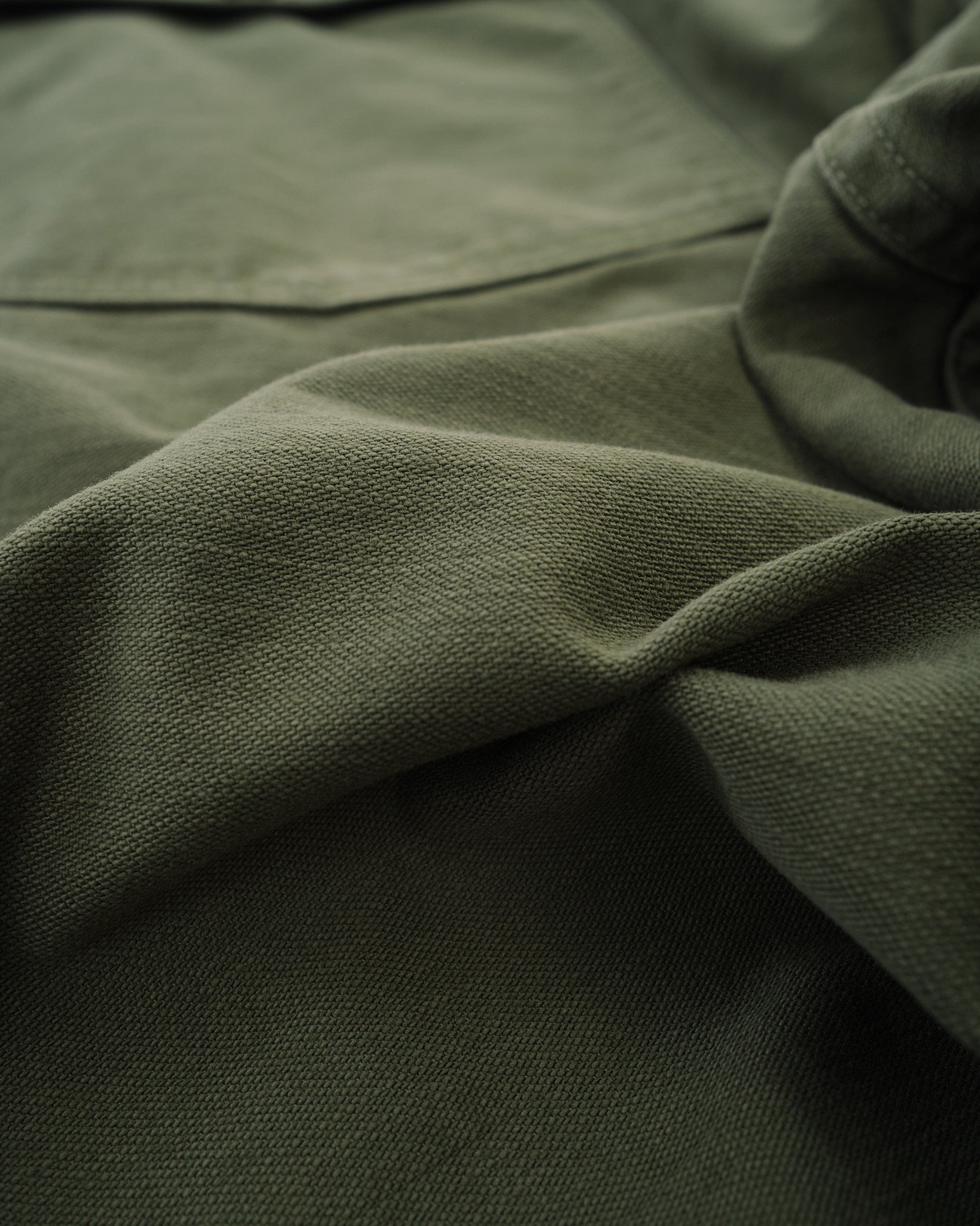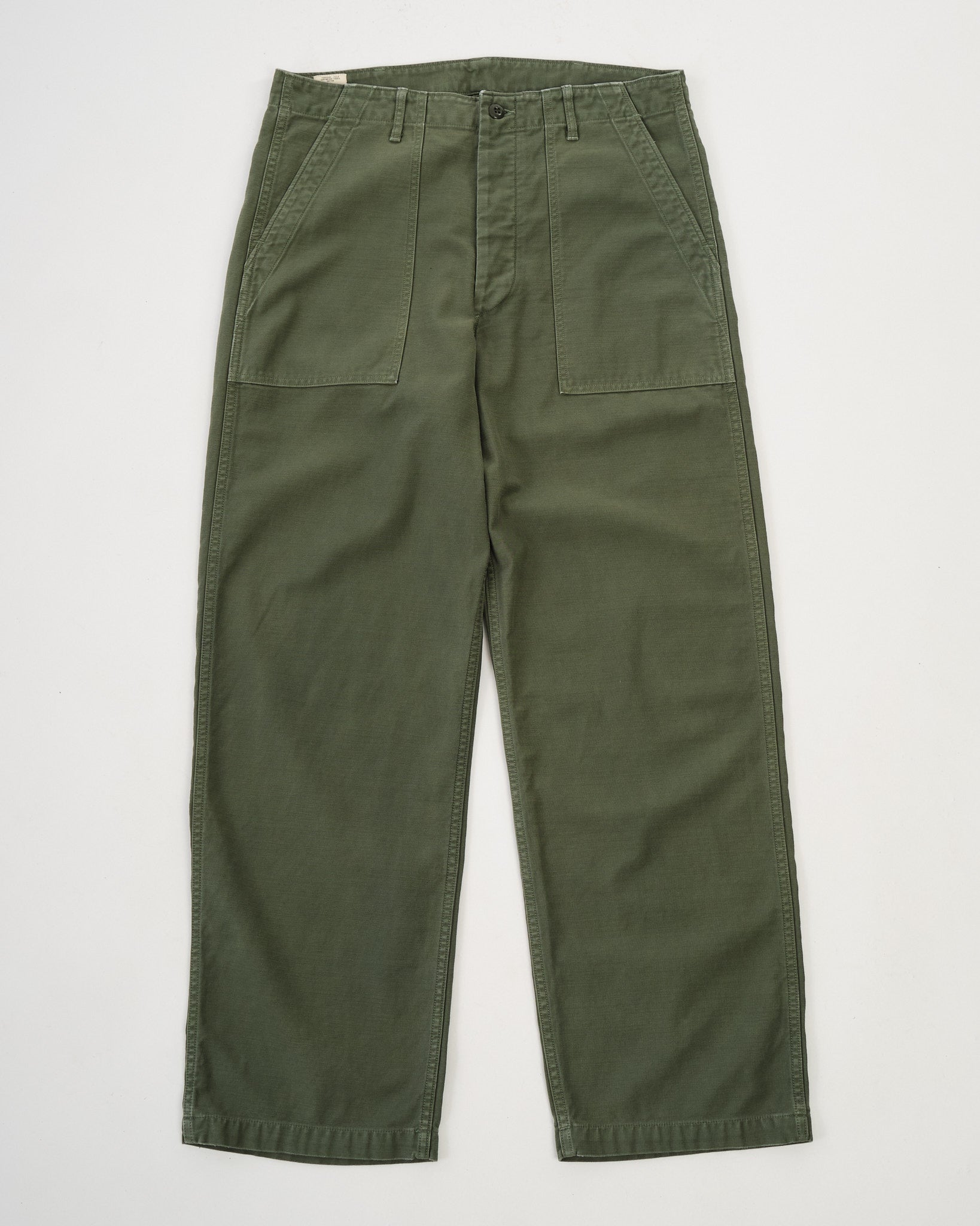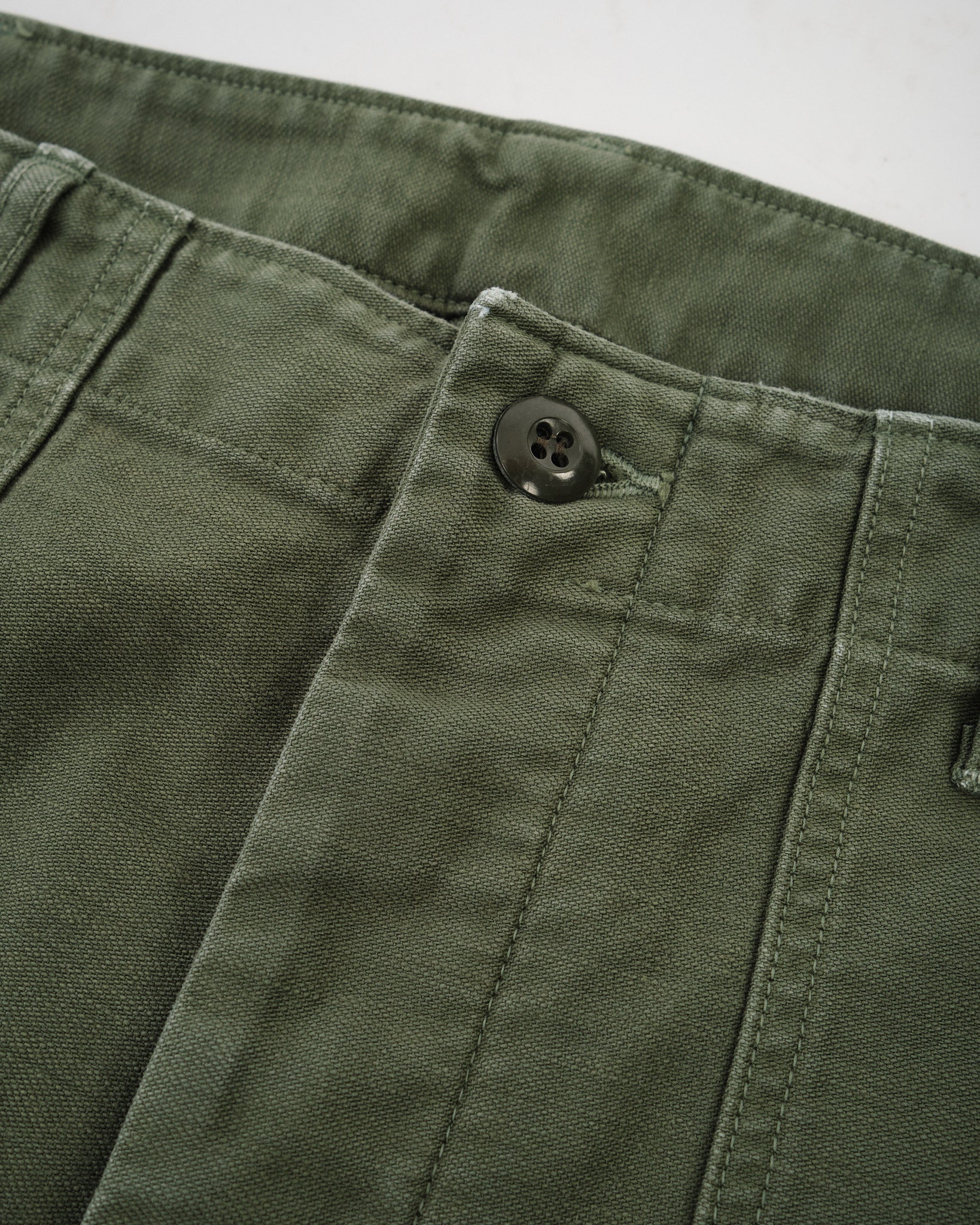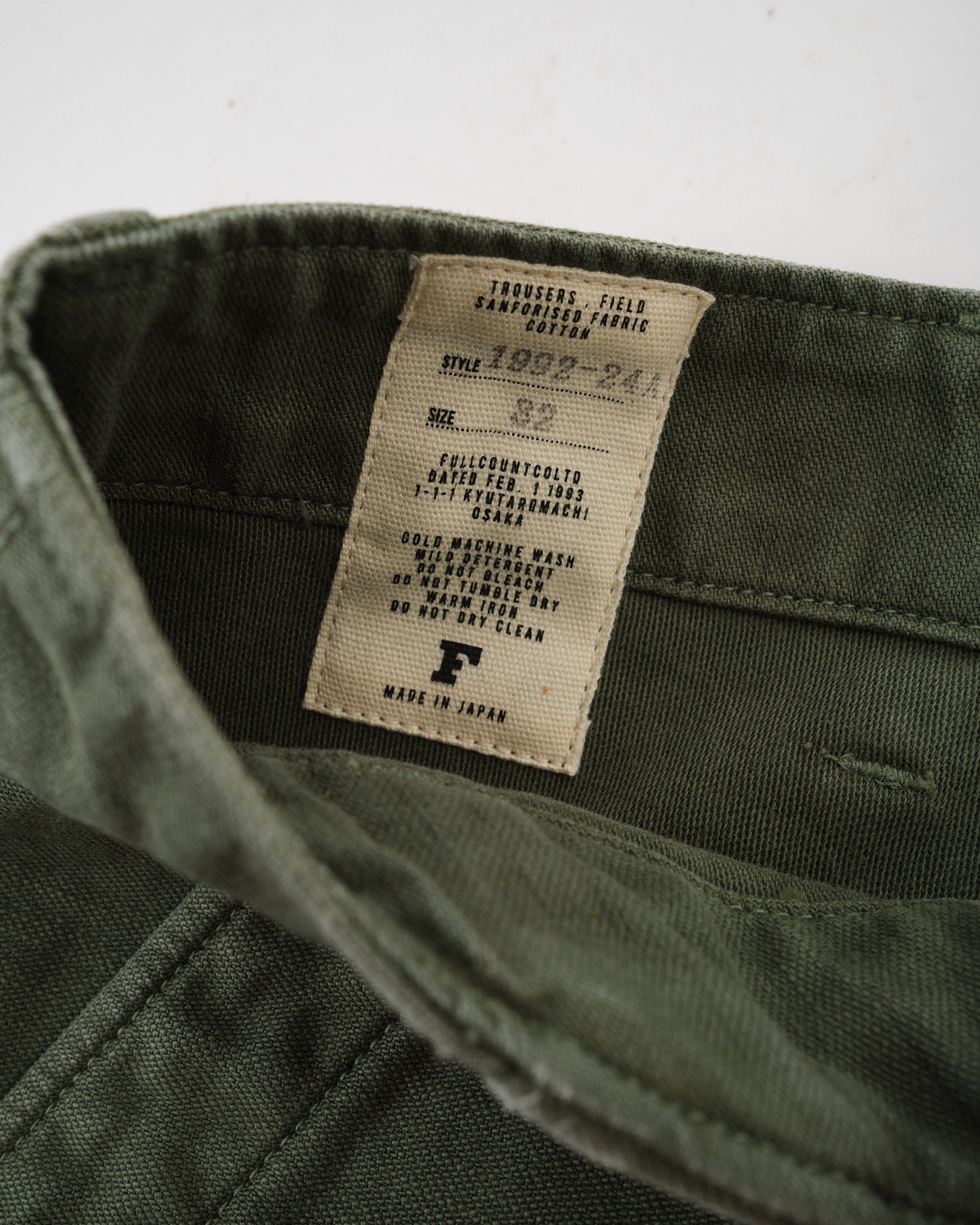 De FULL COUNT 1992-24A UTILITY TROUSERS i OLIVE DRAB (1992-24A) er en hyldest til et af de mest ikoniske militære beklædningsstykker—Baker-bukser. Efter års omhyggelig forskning og udvikling er disse bukser nu en permanent del af Full Count-sortimentet. Fremstillet af 100% bomuld militær back-satin, er stoffet blevet grundigt analyseret, ned til tråden, for at replikere den bløde fornemmelse af vintage Baker-bukser. Det svovlfarvede stof sikrer, at farven ældes gradvist, og udvikler en unik patina over tid. Desuden er ozonbehandling anvendt for at opnå blødheden og teksturen af naturligt indslidte beklædningsstykker, hvilket gør disse bukser komfortable fra første gang, de bæres.