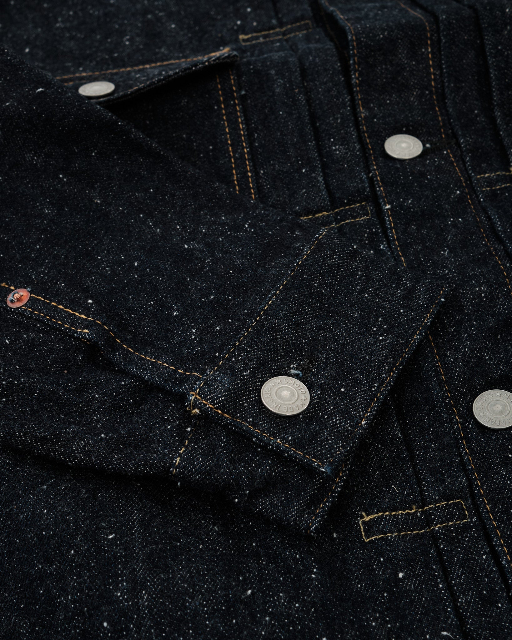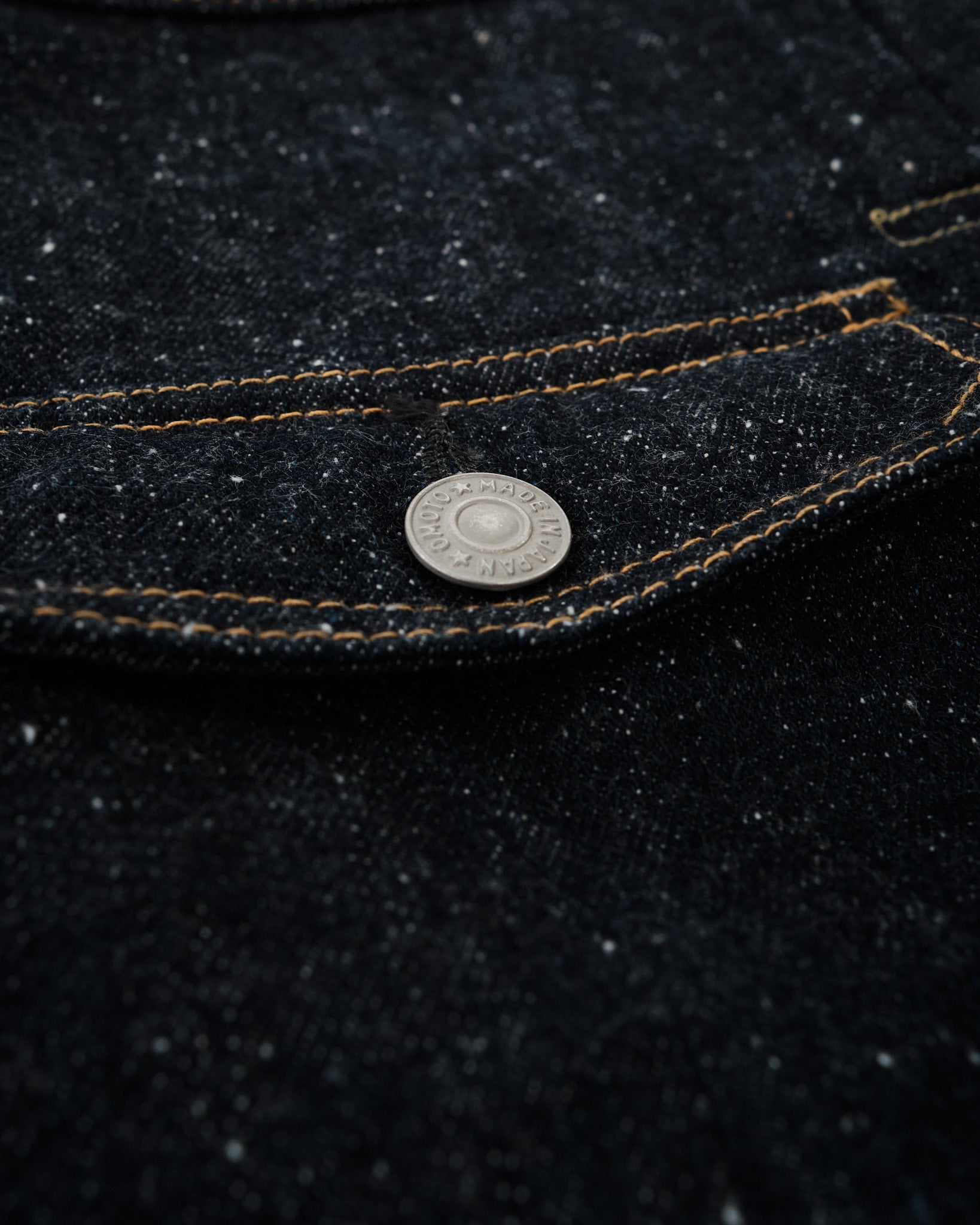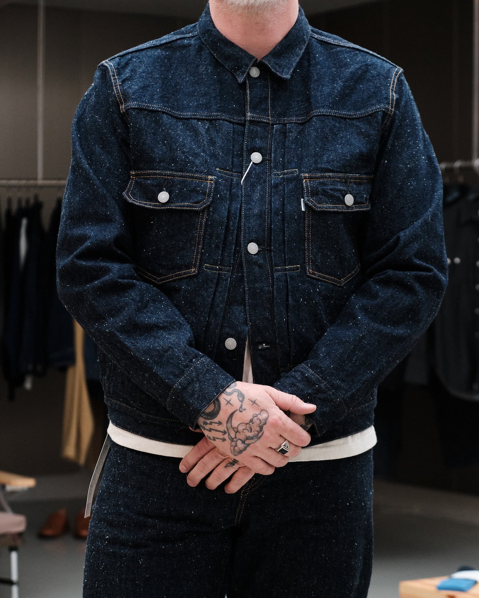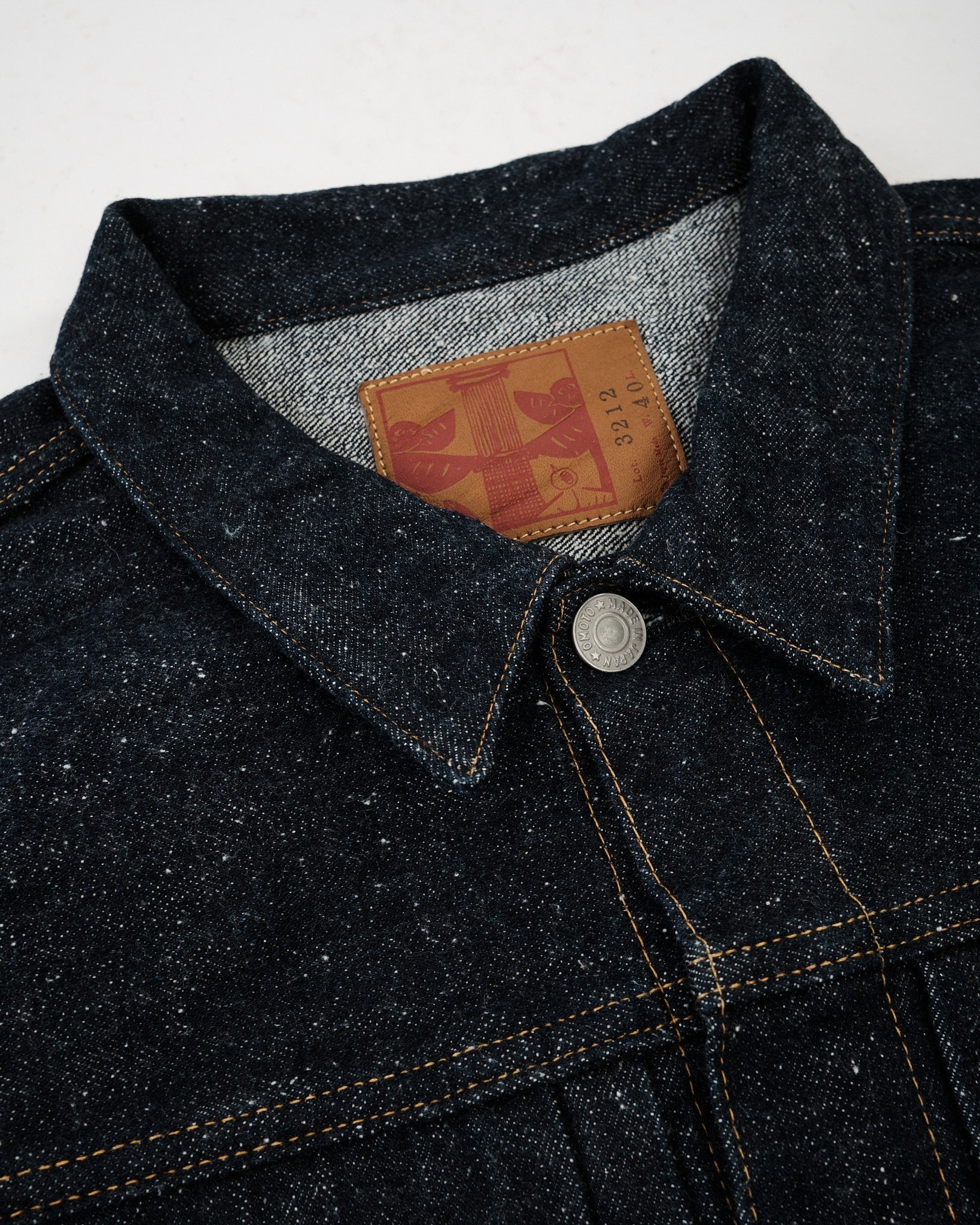 Farvet med 100% ren indigo ved hjælp af en reb-farvningsproces, udvikler jakken dybe, høj-kontrast fades over tid. Stoffet er vævet på en 1950'ernes GL8 Toyoda Automatisk Væv, som fanger luft i stoffet for et tekstureret, vintage-inspireret look.