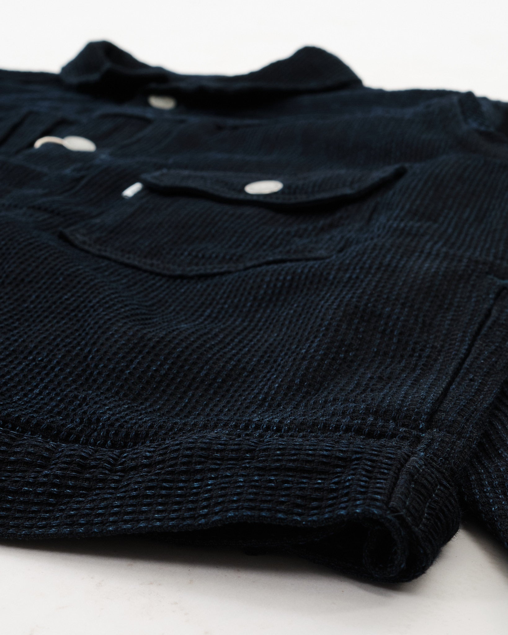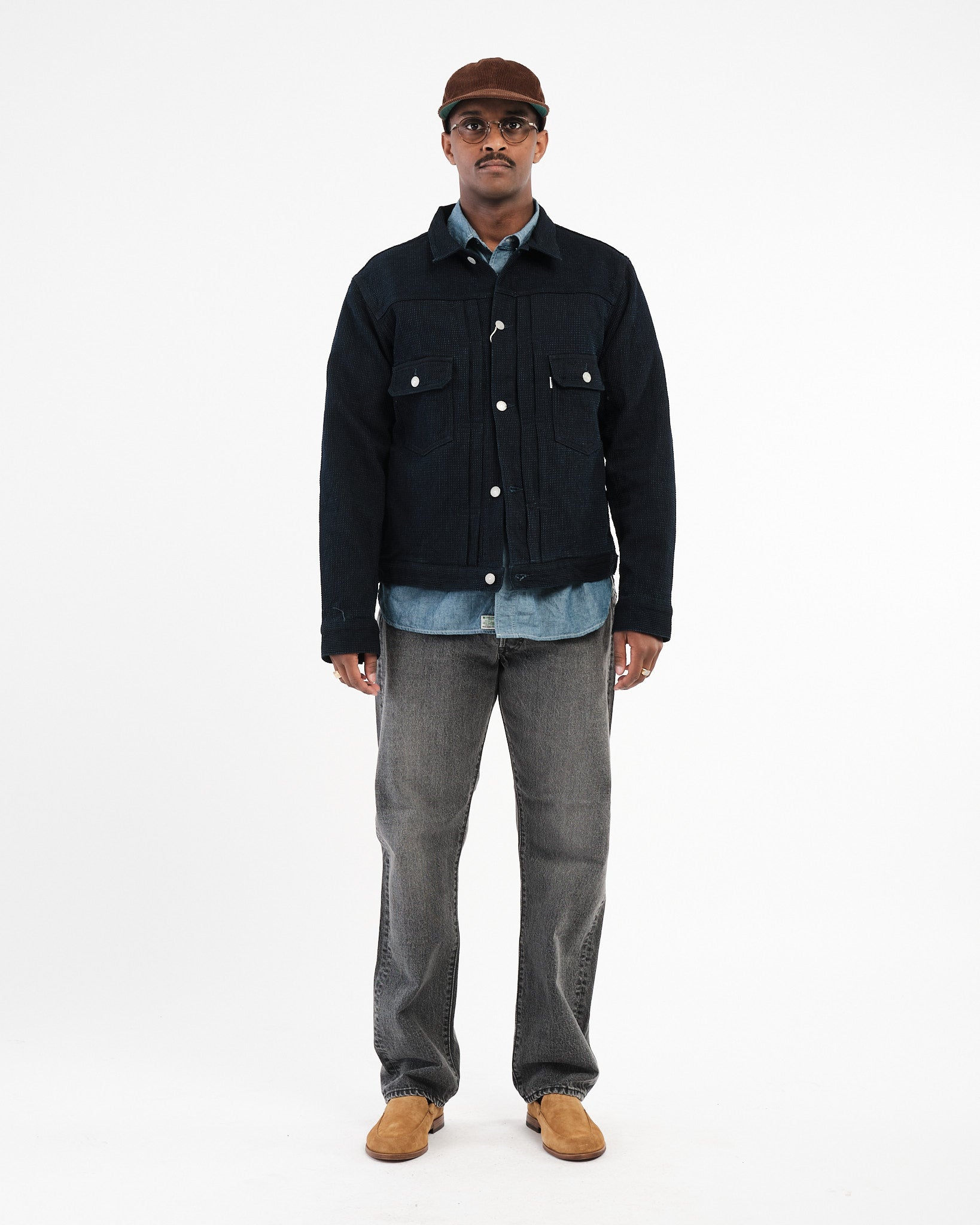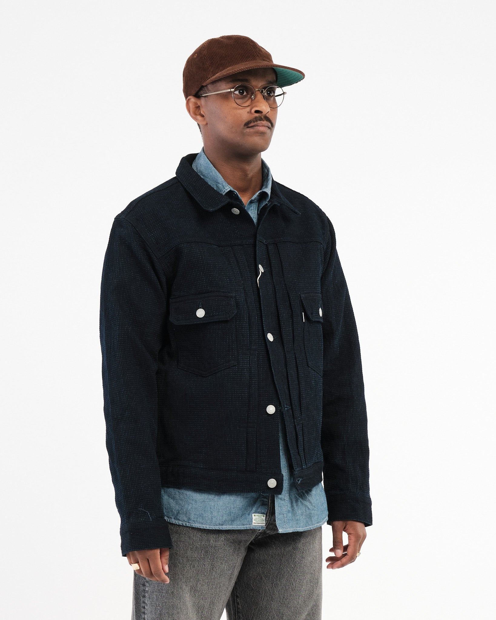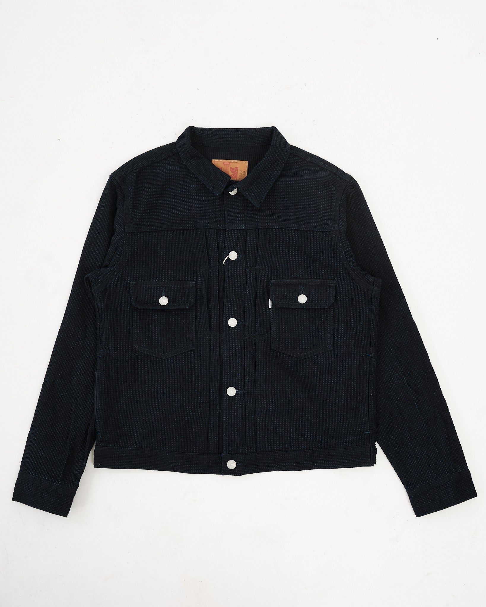 Afsluttende detaljer inkluderer OMOTO's signatur blå-grønne “MIMI” kantsøm, et tilpasset mærket fårelæder mærke, og forstærket syning for lang levetid. Funktionelle brystlommer, originale metal knapper, og præcis sashiko tekstur detaljering gør denne jakke til et tidløst tilføjelse til enhver garderobe.