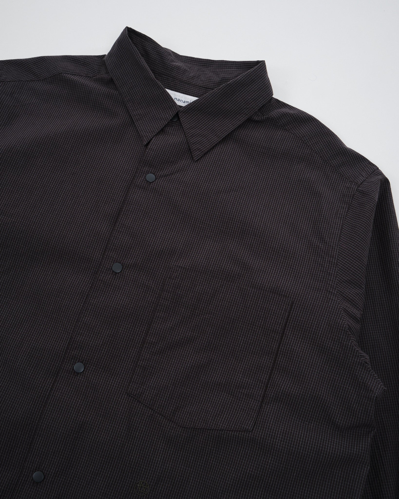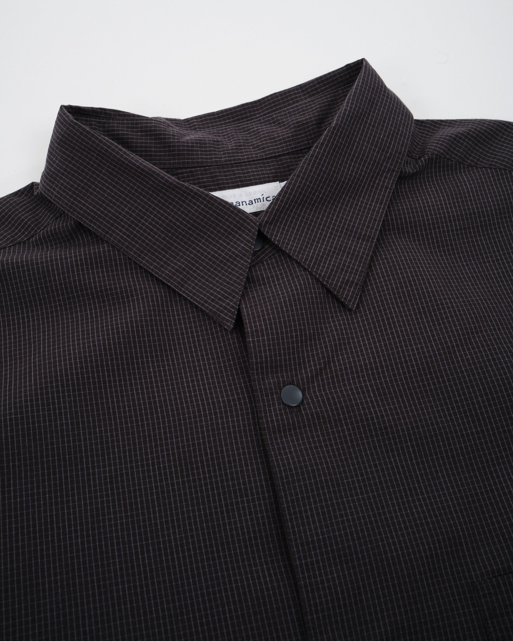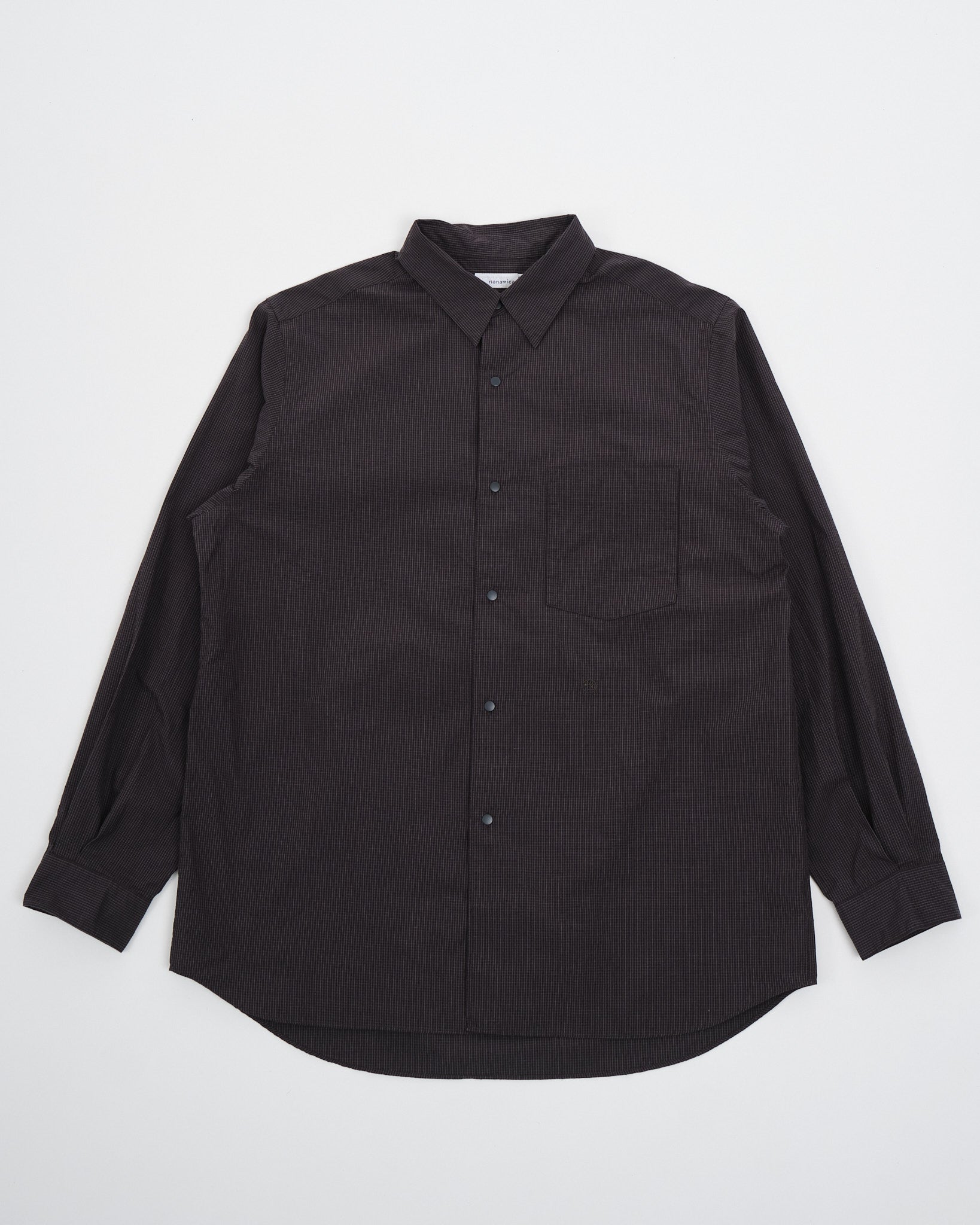 Træd ind i raffineret sofistikation med Nanamicas Regular Collar Wind Shirt i en dyb Charcoal nuance. Skjorten forener traditionel tiltrækning med nutidig elegance. Dets unikke broadcloth stof, fremstillet af dækkende kerneyarn, er tankefuldt designet med bomuld, der omslutter en polyesterkerne. Sammenlignet med standard SUGS307, praler den af en lettere stoftextur og tilbyder en silhuet, der er omtrent en størrelse smallere. Skjorten prydes af et klassisk graf check mønster, der subtilt forhøjer dens æstetiske appel. For at komplementere dens design, er alle knapper stylet som prikknapper, ledsaget af dekorative knaphuller, for det ekstra touch af finesse.