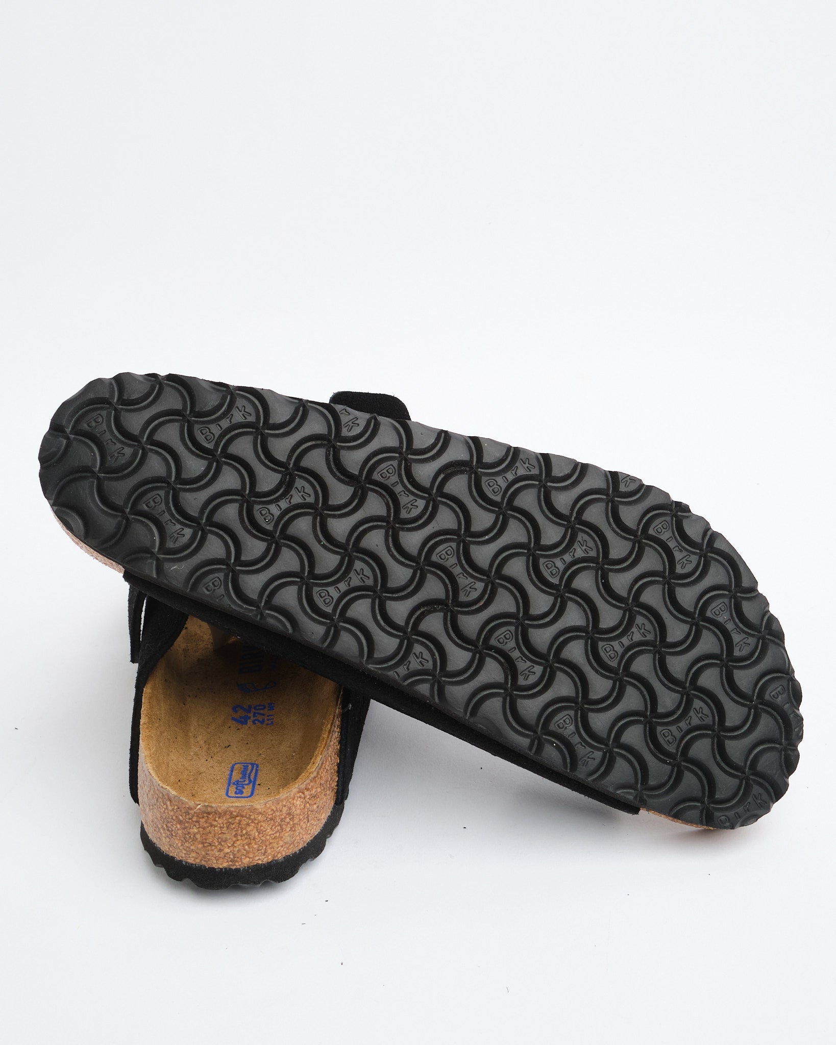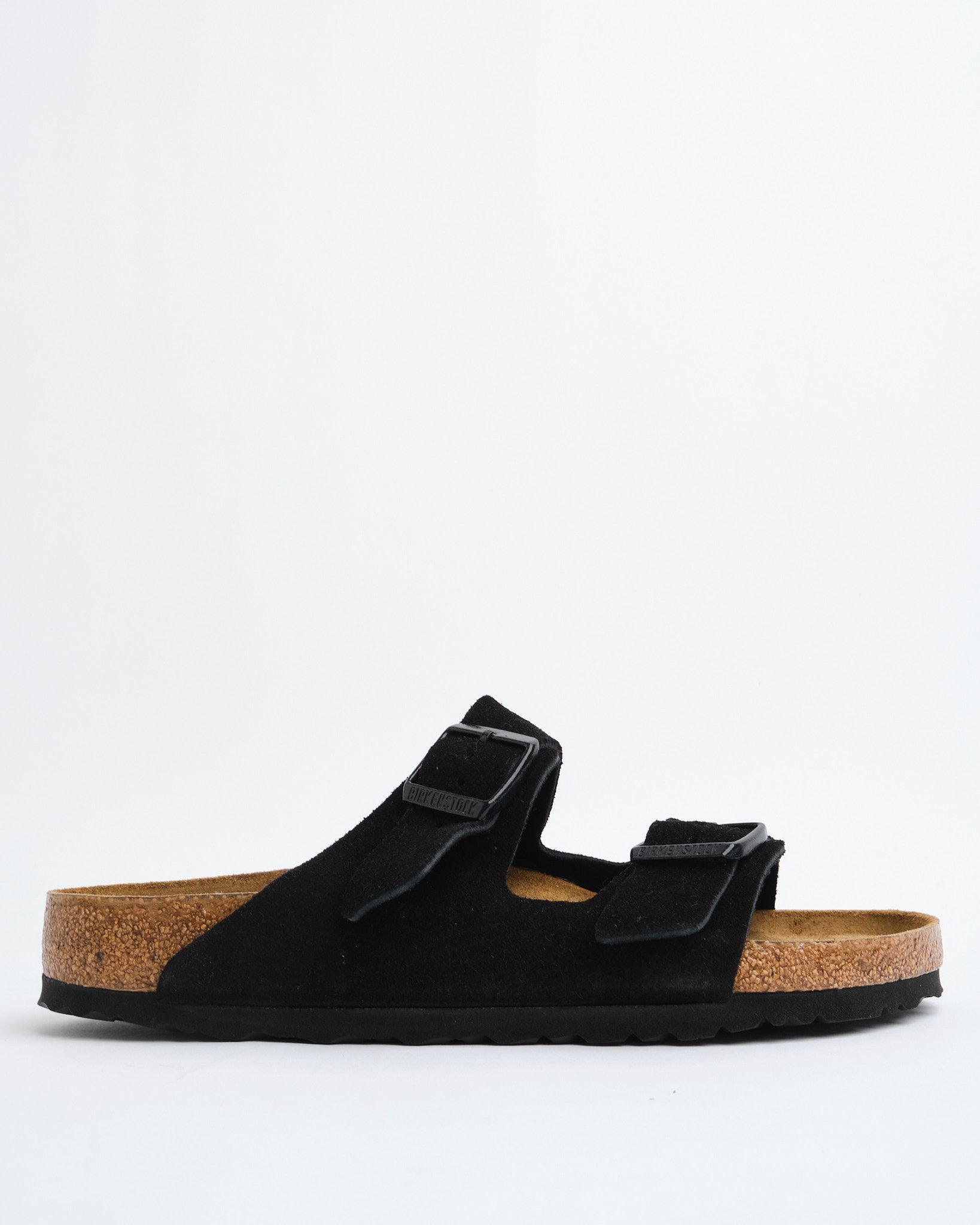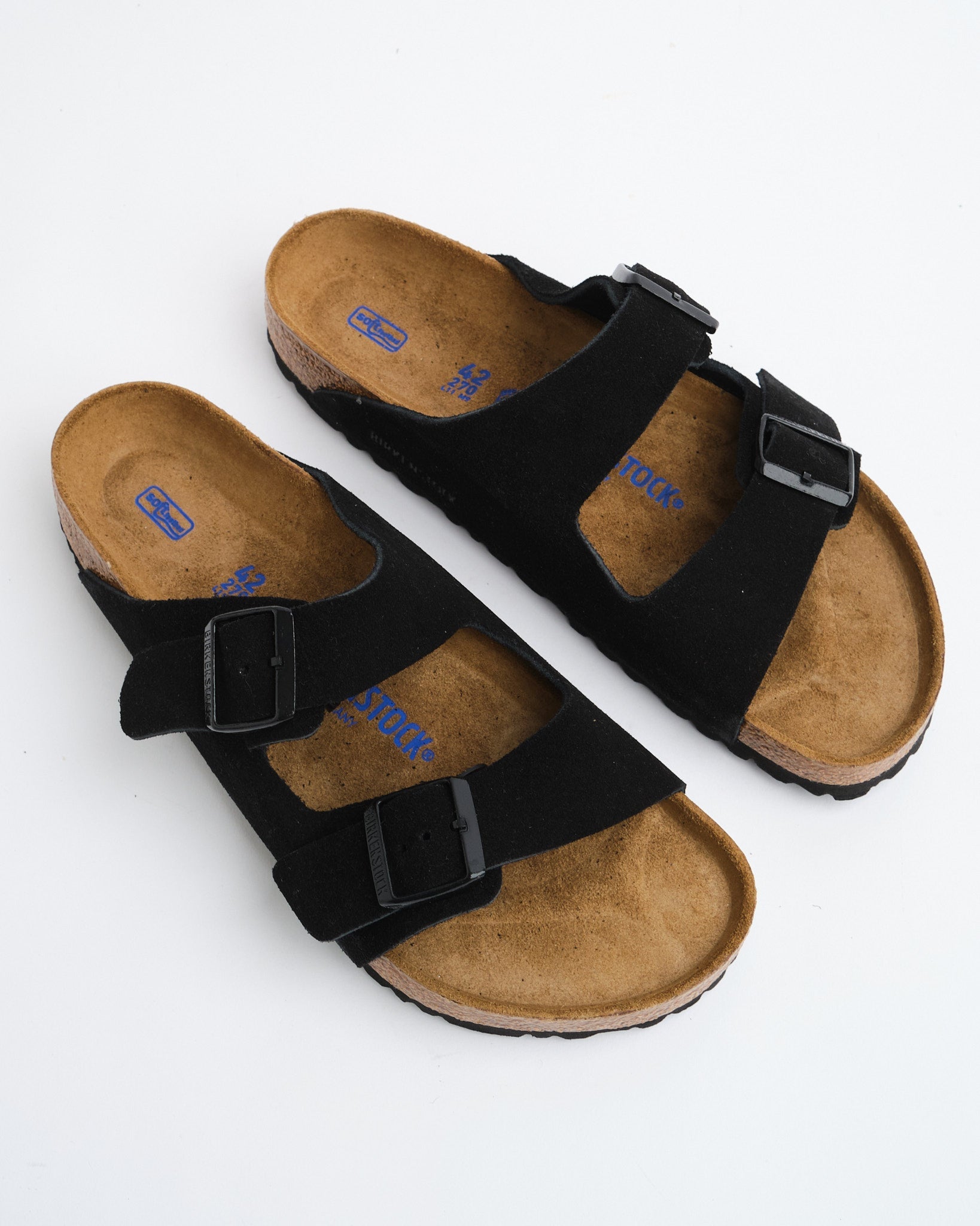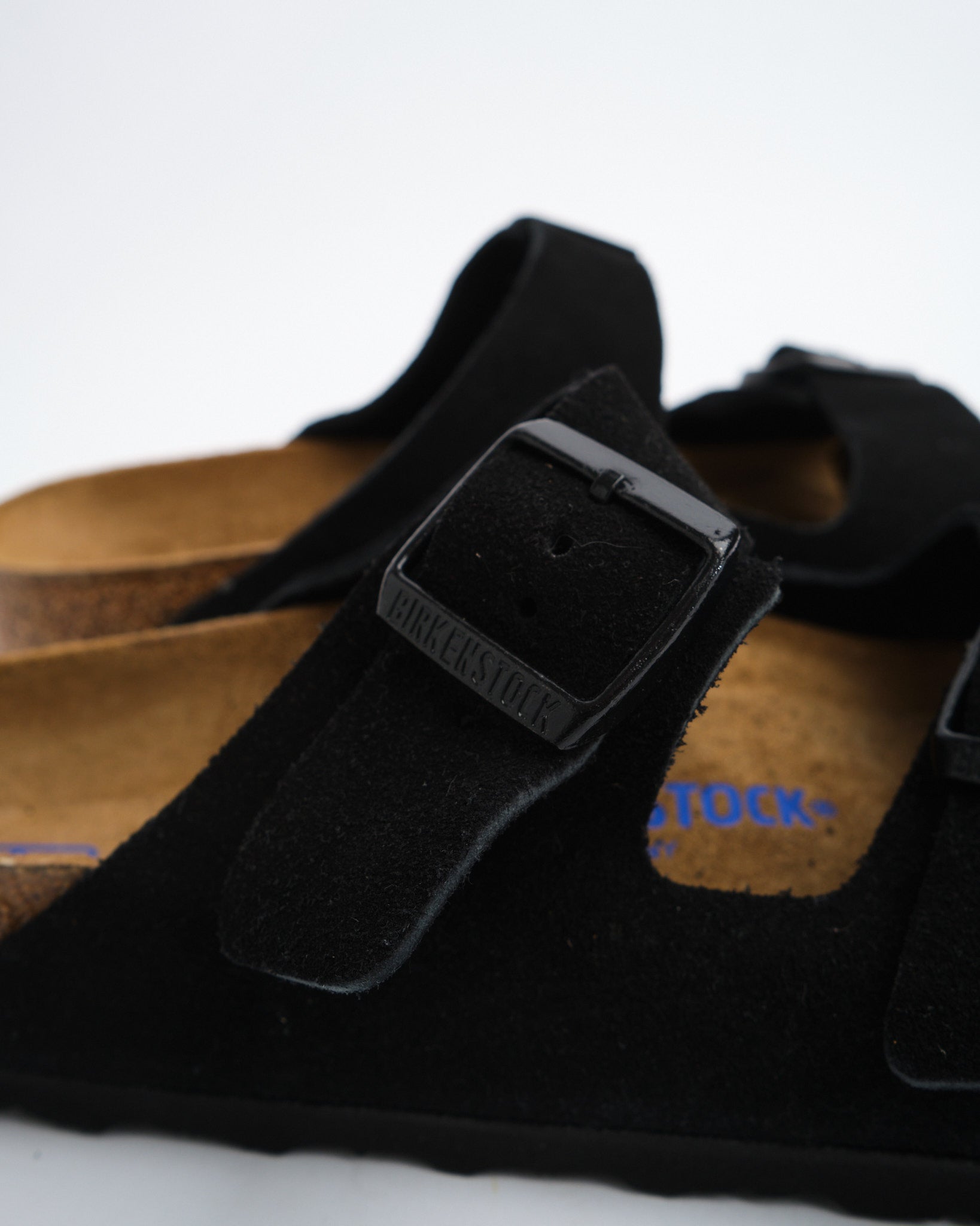 Introduktion af Birkenstock Arizona Soft Footbed Suede i Sort (Produktkode: 951321), en tidløs to-strops sandal, der kombinerer klassisk design med øget komfort. Fremstillet af førsteklasses ruskindslæder, denne sandal har Birkenstocks signatur bløde fodseng, der giver et ekstra lag af polstring til hele dagen brug.