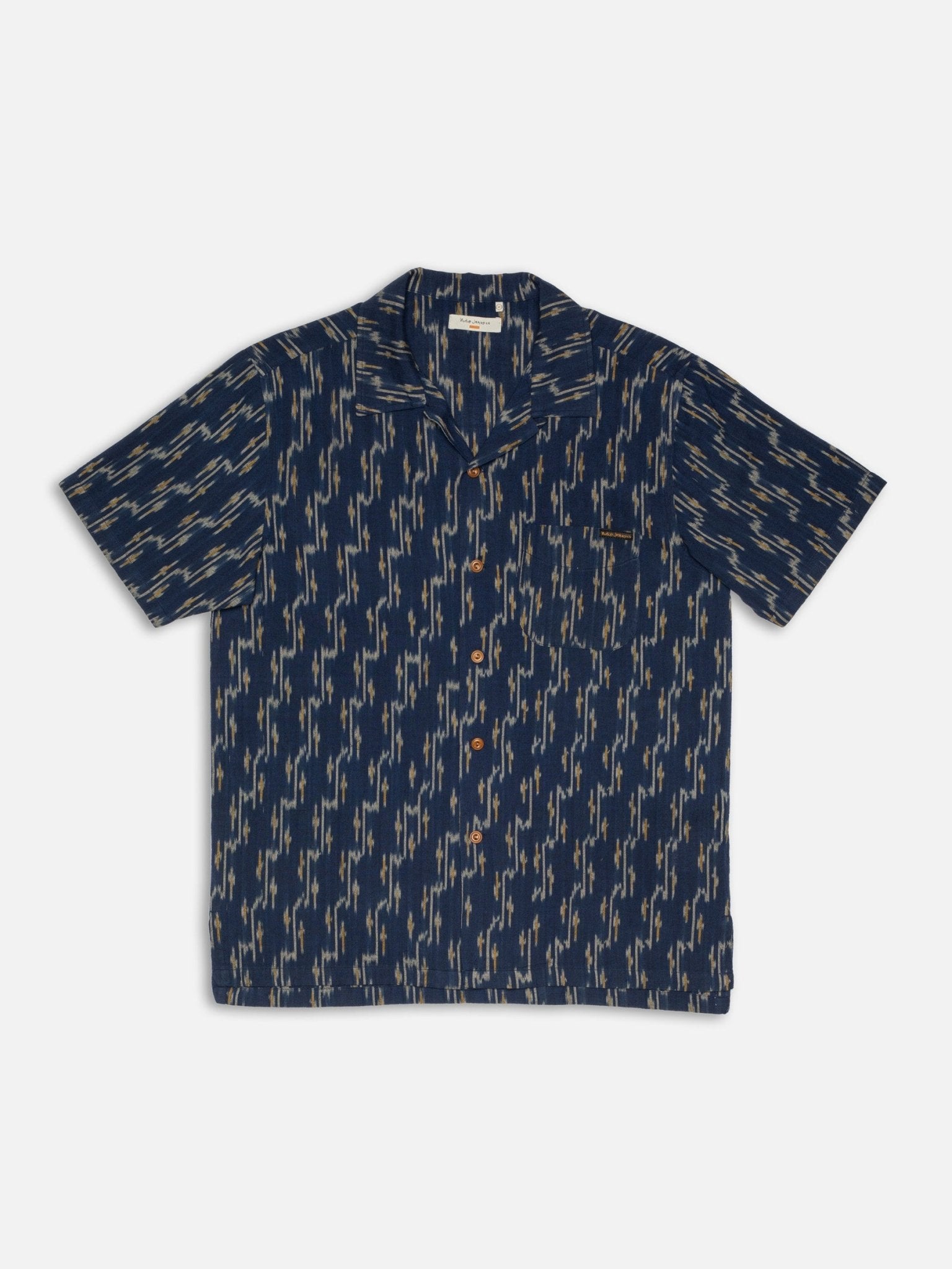 Præsentation af ARVID IKAT SKJORTEN fra NUDIE JEANS CO—en harmonisk blanding af traditionelt håndværk og moderne stil. Denne skjorte har et unikt Ikat-mønster i en rig blåbærfarve, der tilbyder et distinkt og iøjnefaldende look.
