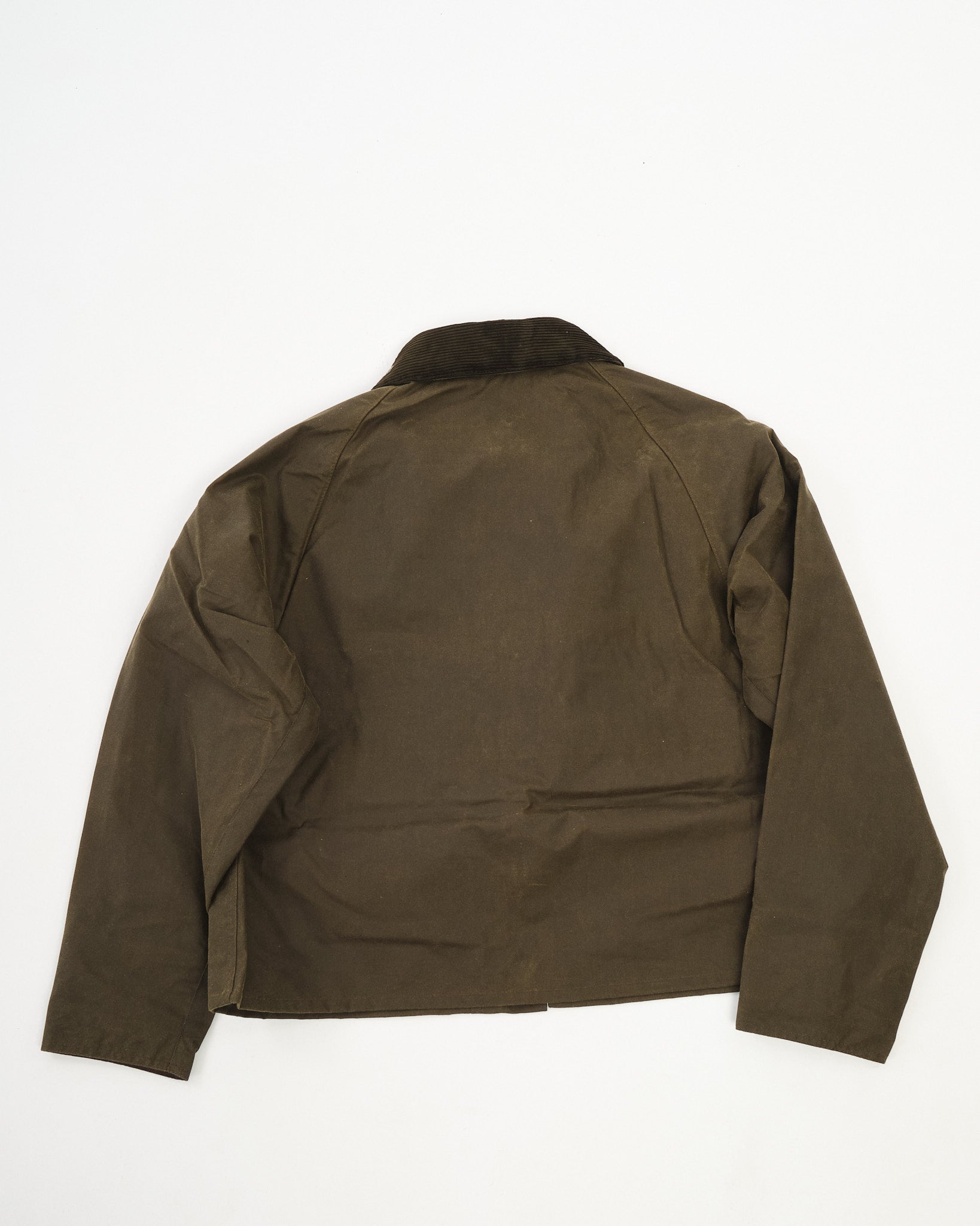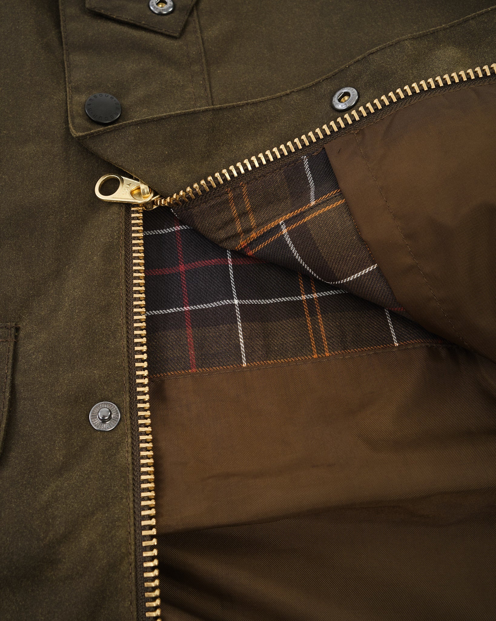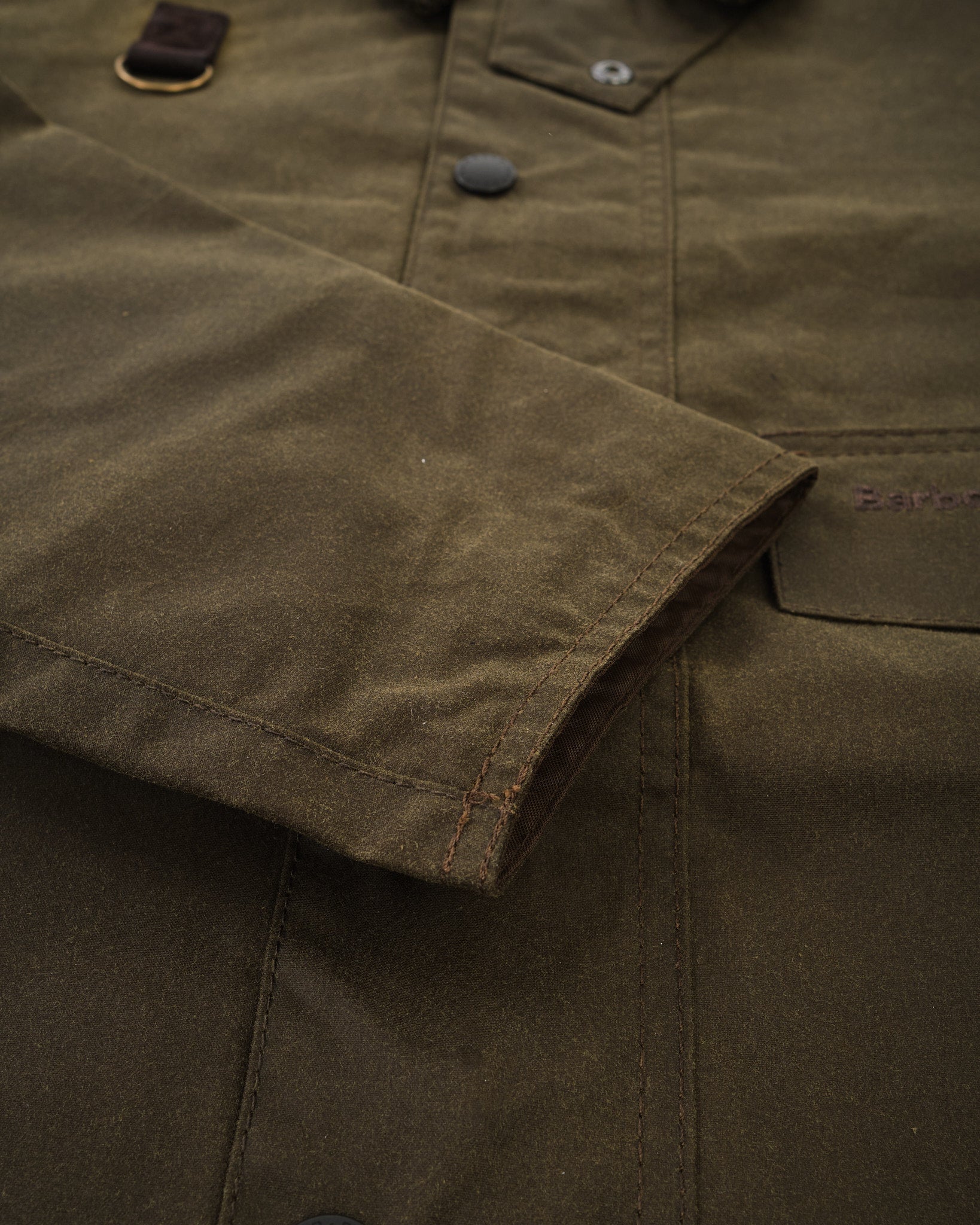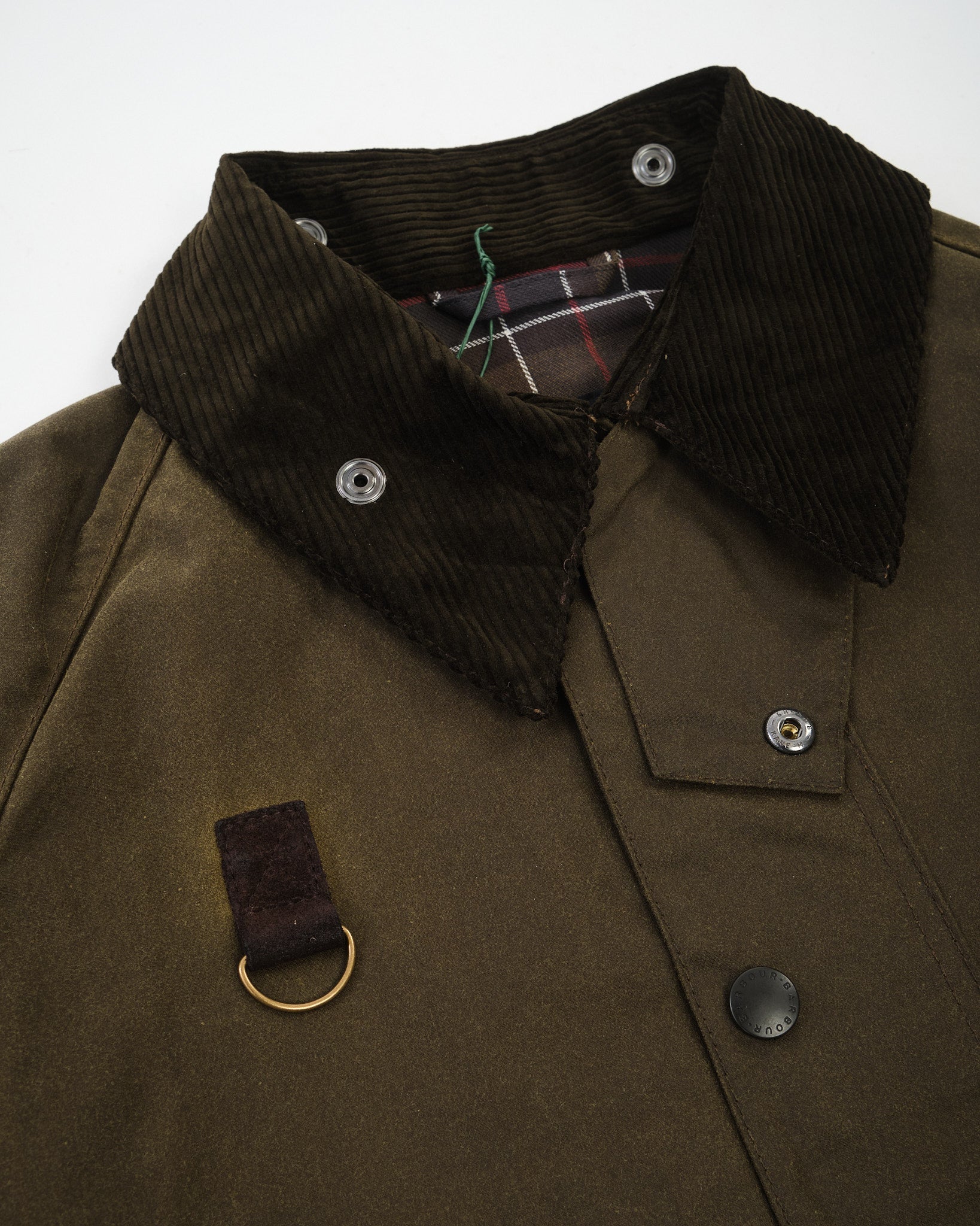 Barbour Spey Wax Jacket i Beech genintroducerer en tidløs silhuet født fra fiskeriarv og tilpasset til moderne brug. Konstrueret fra Barbours ikoniske 6oz Sylkoil vokset bomuld, denne korte, kasseformede jakke har en rig, mat olivenfarve, der udvikler karakter med alderen. Den er bygget til mobilitet med raglanærmer og et kort snit, oprindeligt tiltænkt til nem kastning under vadefiskeri. Klassiske detaljer inkluderer en blød fløjlskrave med halsrem, trykknap klokkelommer, en messing tovejs lynlås og Barbours signatur tartanforing. Robust men raffineret repræsenterer dette stykke Barbours dybe forbindelse til funktionel stil og britisk tradition.