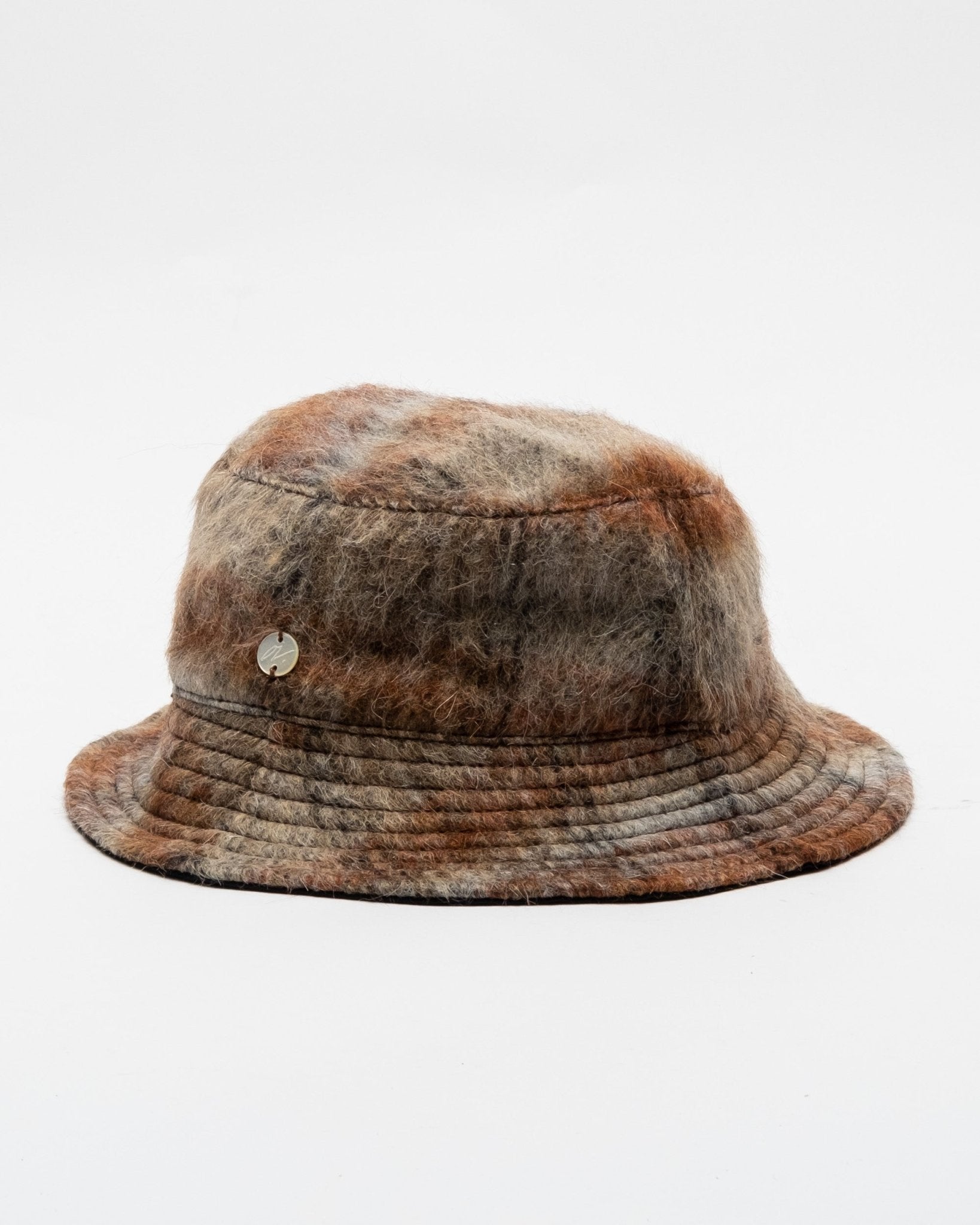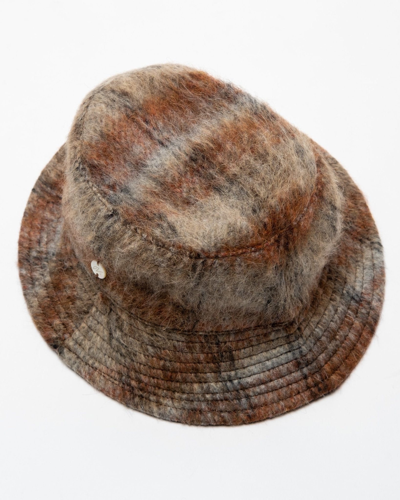 Bucket Hat Ament Check Mohair fra Our Legacy. En af de bedste efterår/vinter bucket hatte, vi har set i årevis. Smuk Ament farvekombination blandet med den hyggelige mohair følelse.
