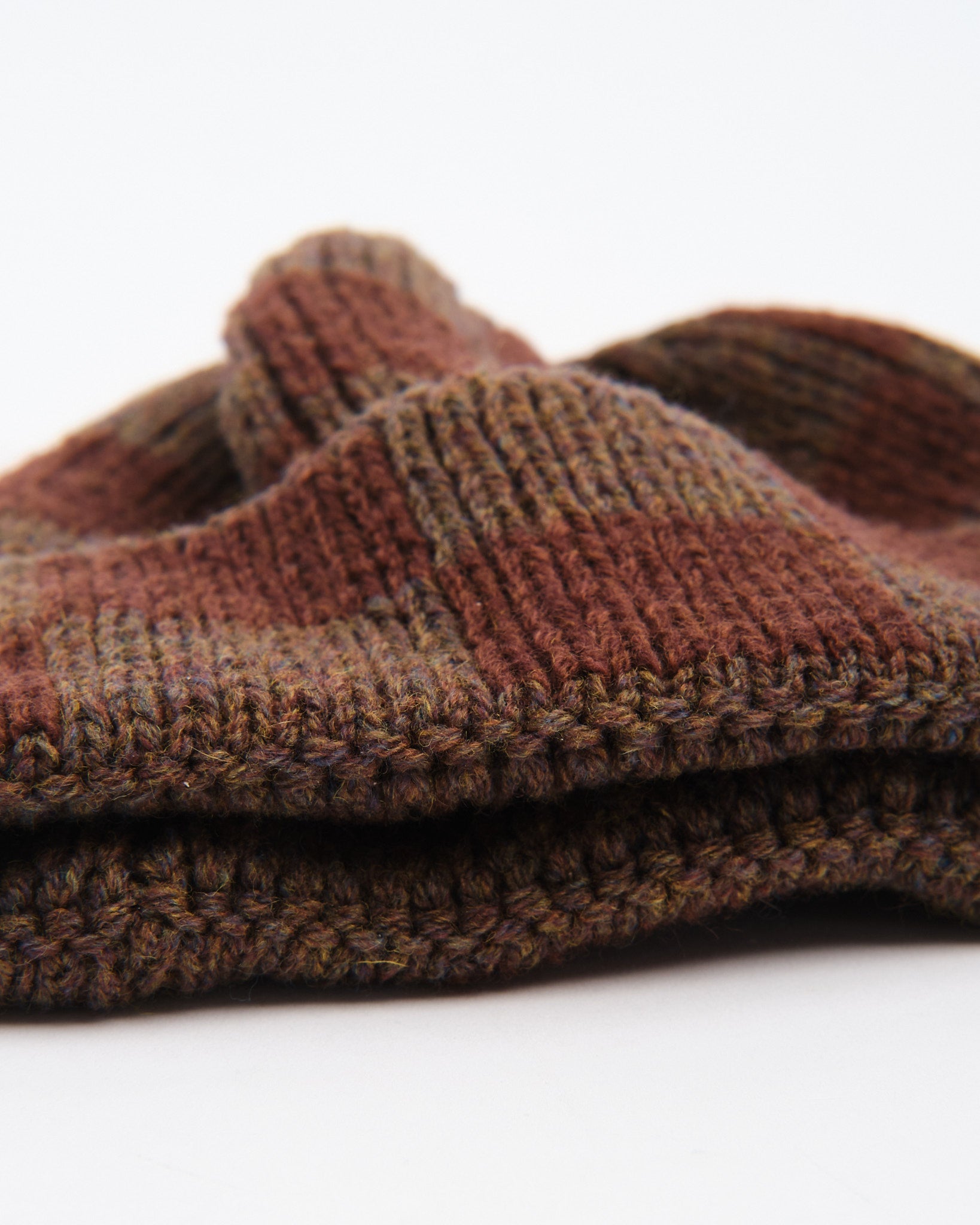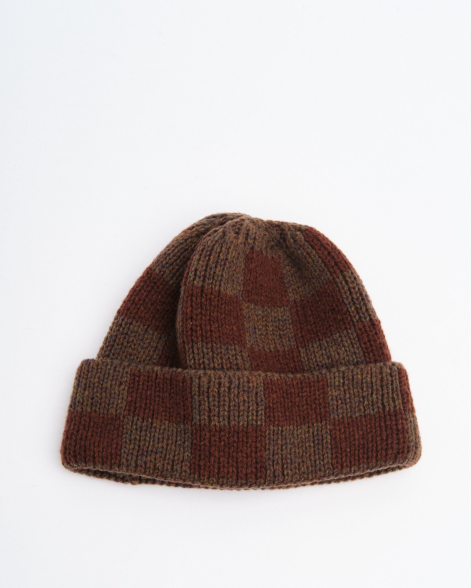 Checker Beanie i brun fra Found Feather bringer jordfarver og forhøjet tekstur til din vinterrotation. Fremstillet i Japan med blødt, vaskbart italiensk Donegal-uld, har den en jacquardstrikket konstruktion, der giver den både visuel dybde og behagelig struktur. En strækbar garnblanding sikrer en sikker unisex pasform, mens den almindelige 7 cm kant og det rene design med ét panel holder formen klassisk. Diskret, varm og designet til at holde — dette er en arv-inspireret beanie med moderne lethed.