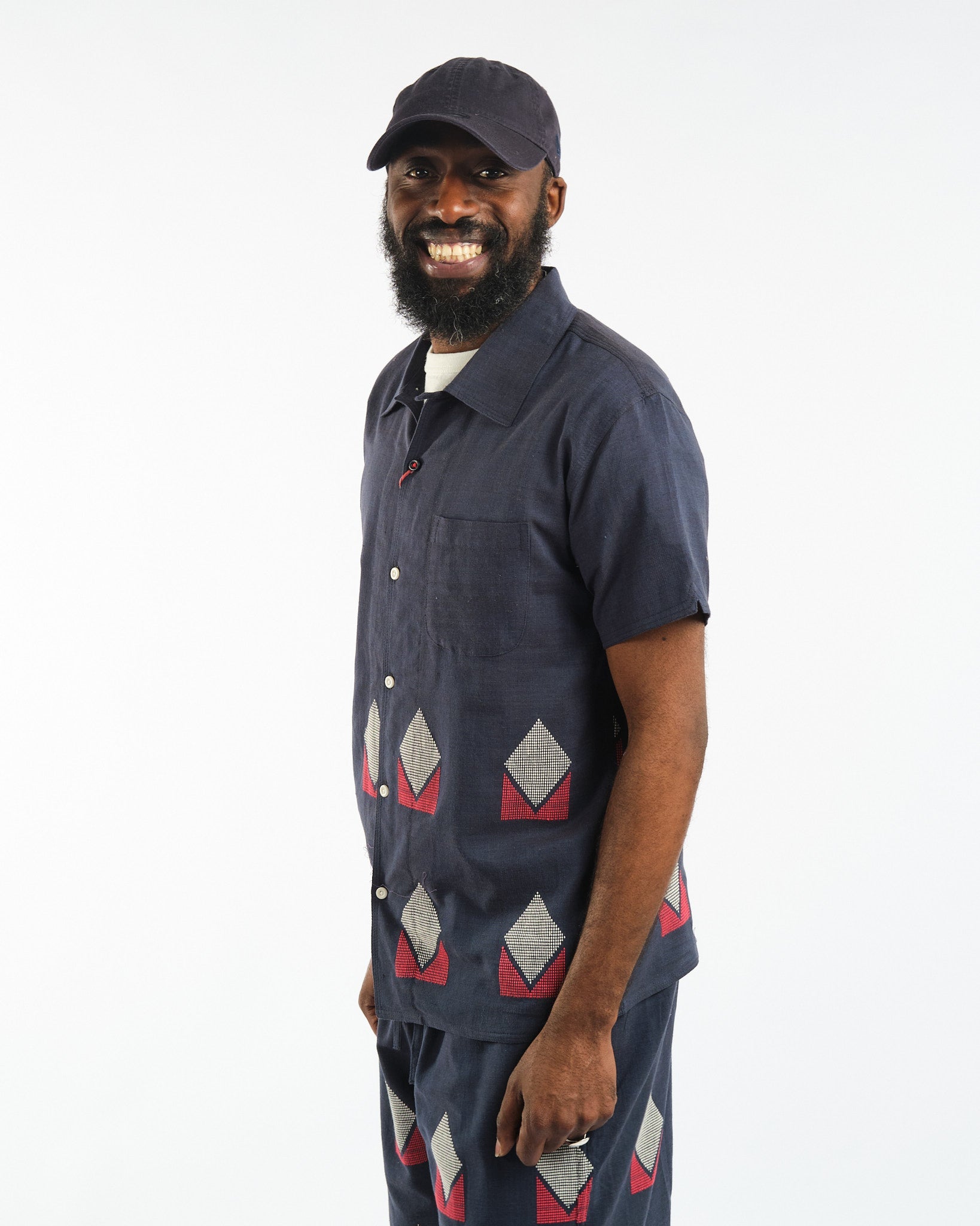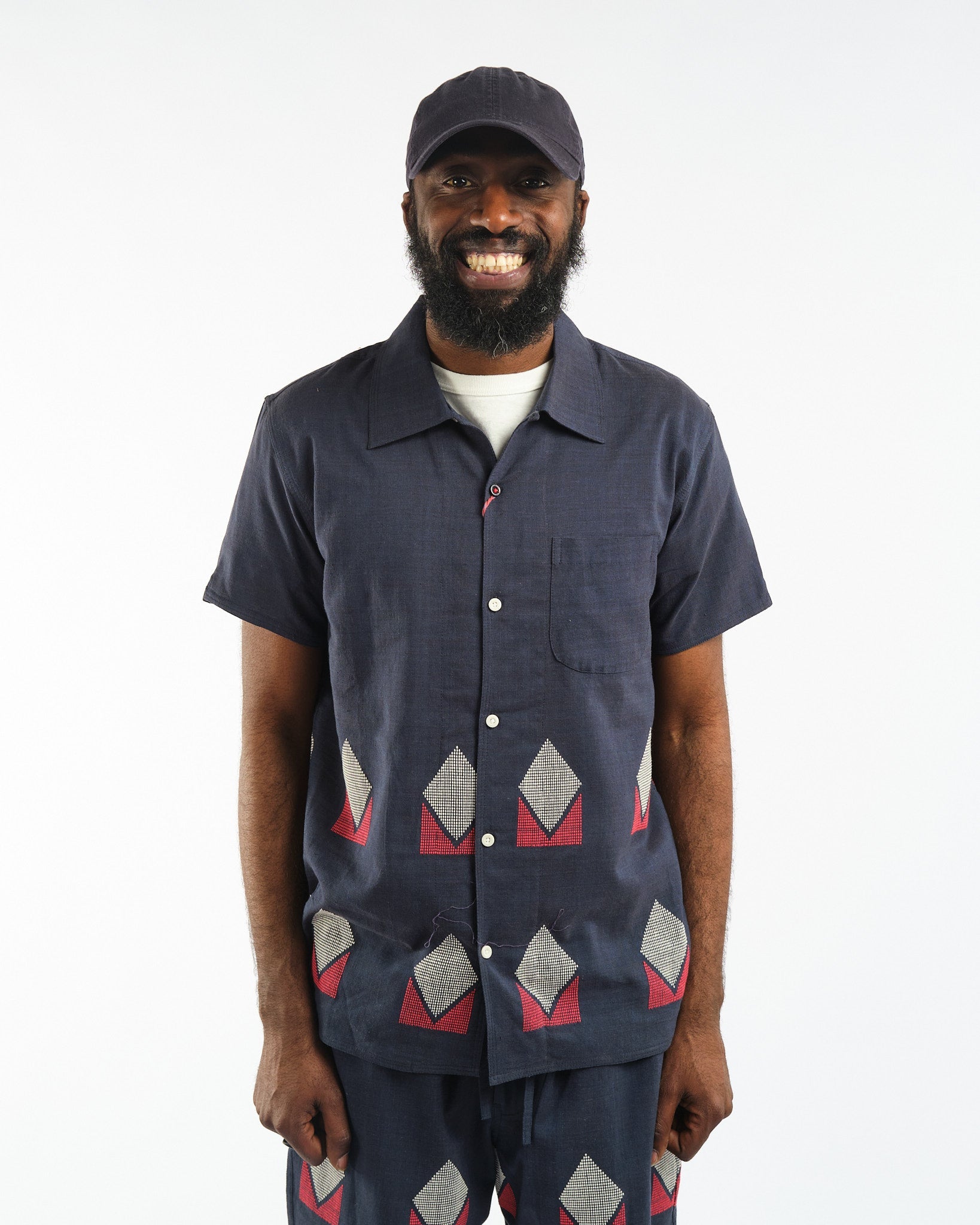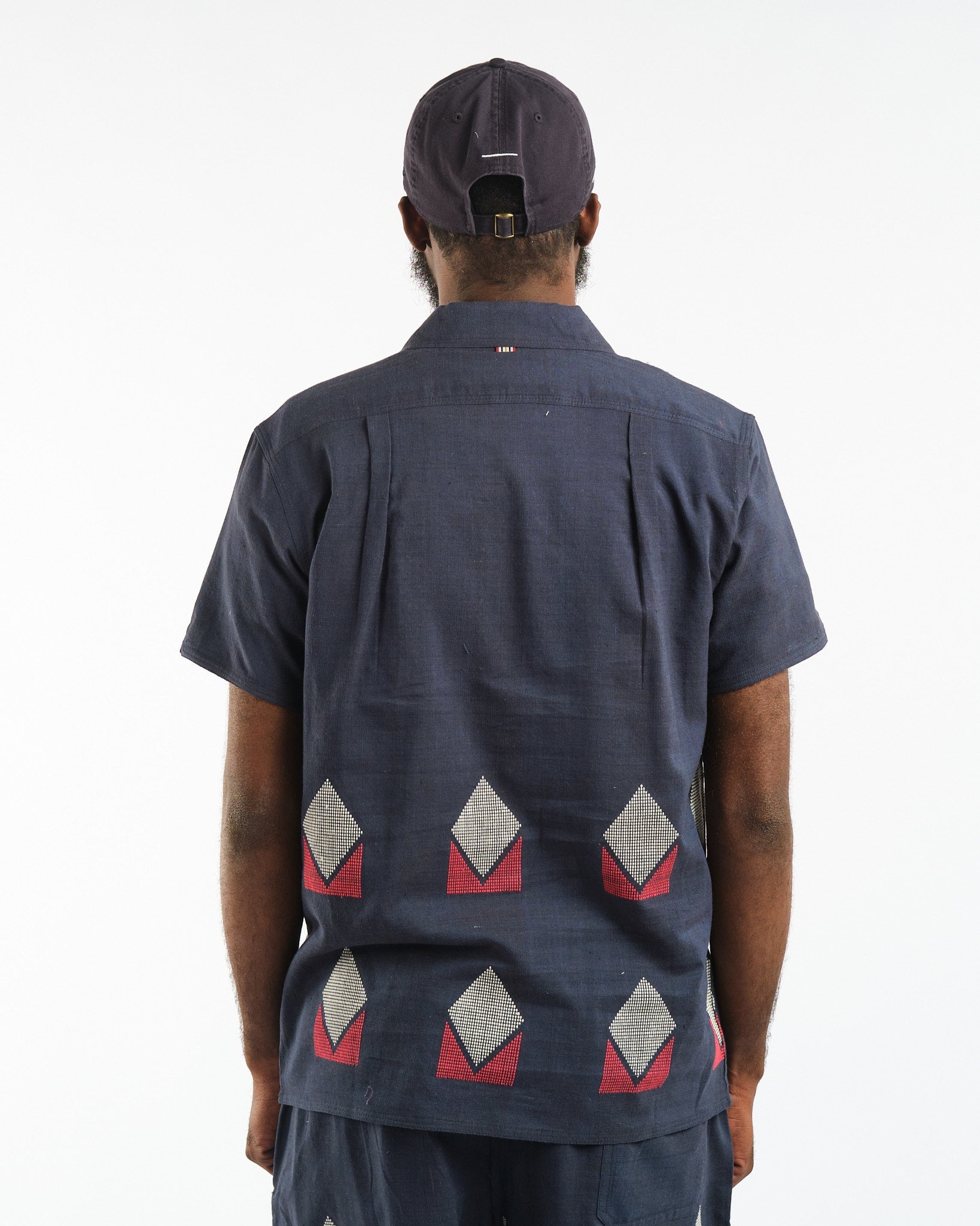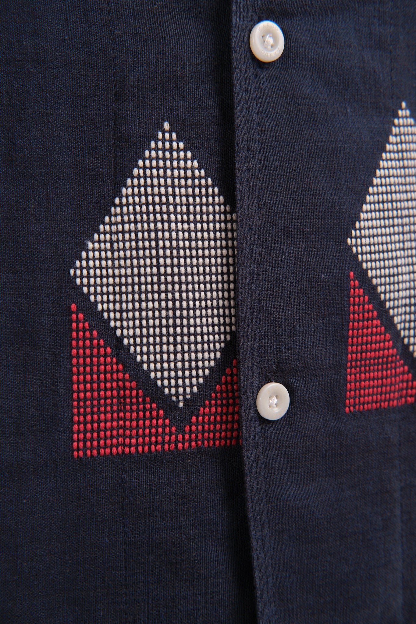 Oplev den ultimative komfort og stil med Kardo Chintan Bunkar navy skjorten. Håndspundet og håndvævet af væverne Nasruddin og Amresh fra Bun.Kar, dette khadi bomuld har ekstra skudmønstre inspireret af buddhistiske templer og arkitekturen i Bodh Gaya i Bihar, stedet hvor Buddha opnåede oplysning. Denne kortærmede skjorte har en boxy pasform og en åben krave, med Bun.Kar motiver for ekstra detalje. Corozo knapperne og de håndfærdige detaljer skaber et sofistikeret og moderne look, samtidig med at den er lavet af én skrædder fra start til slut for ekstra kvalitet.