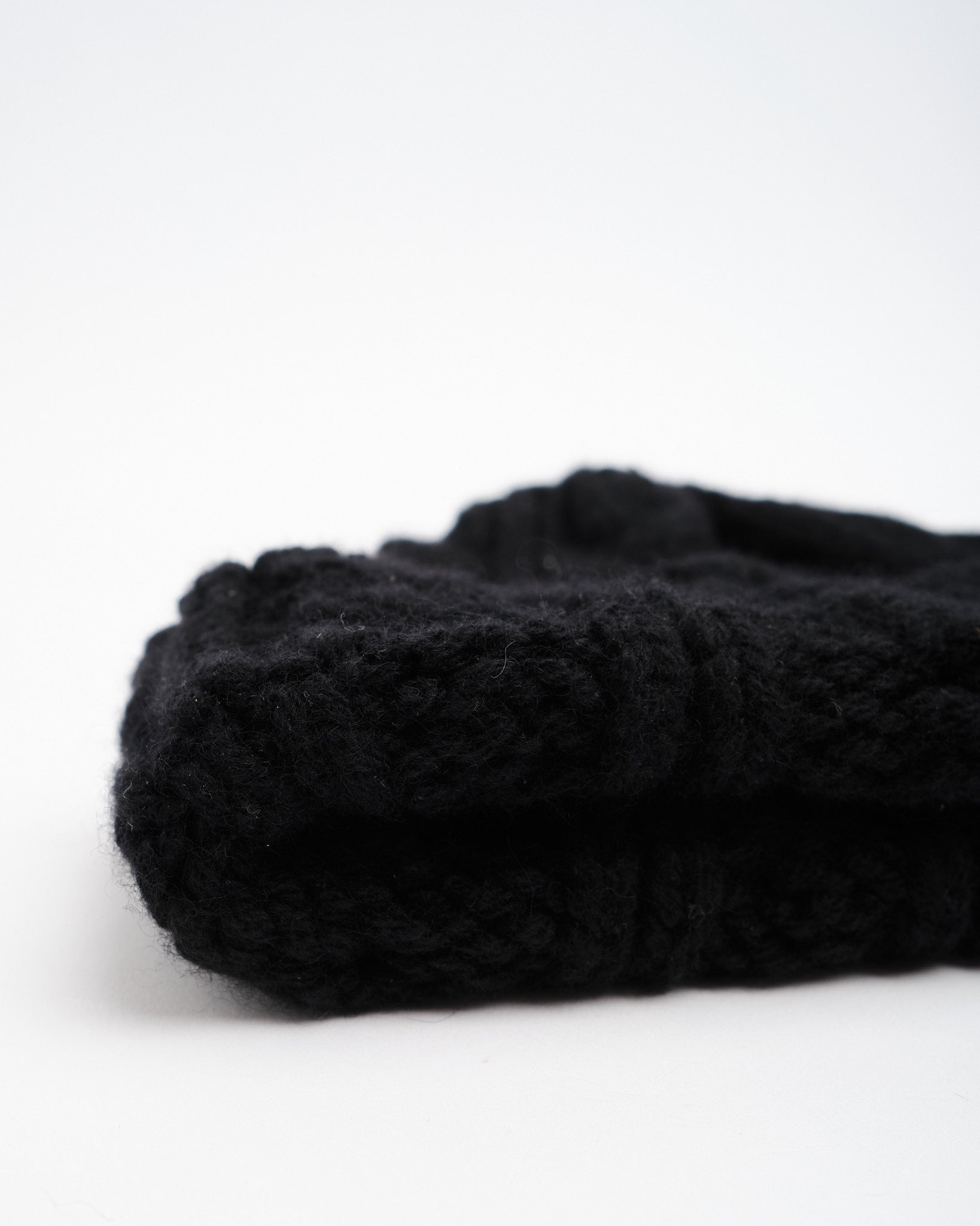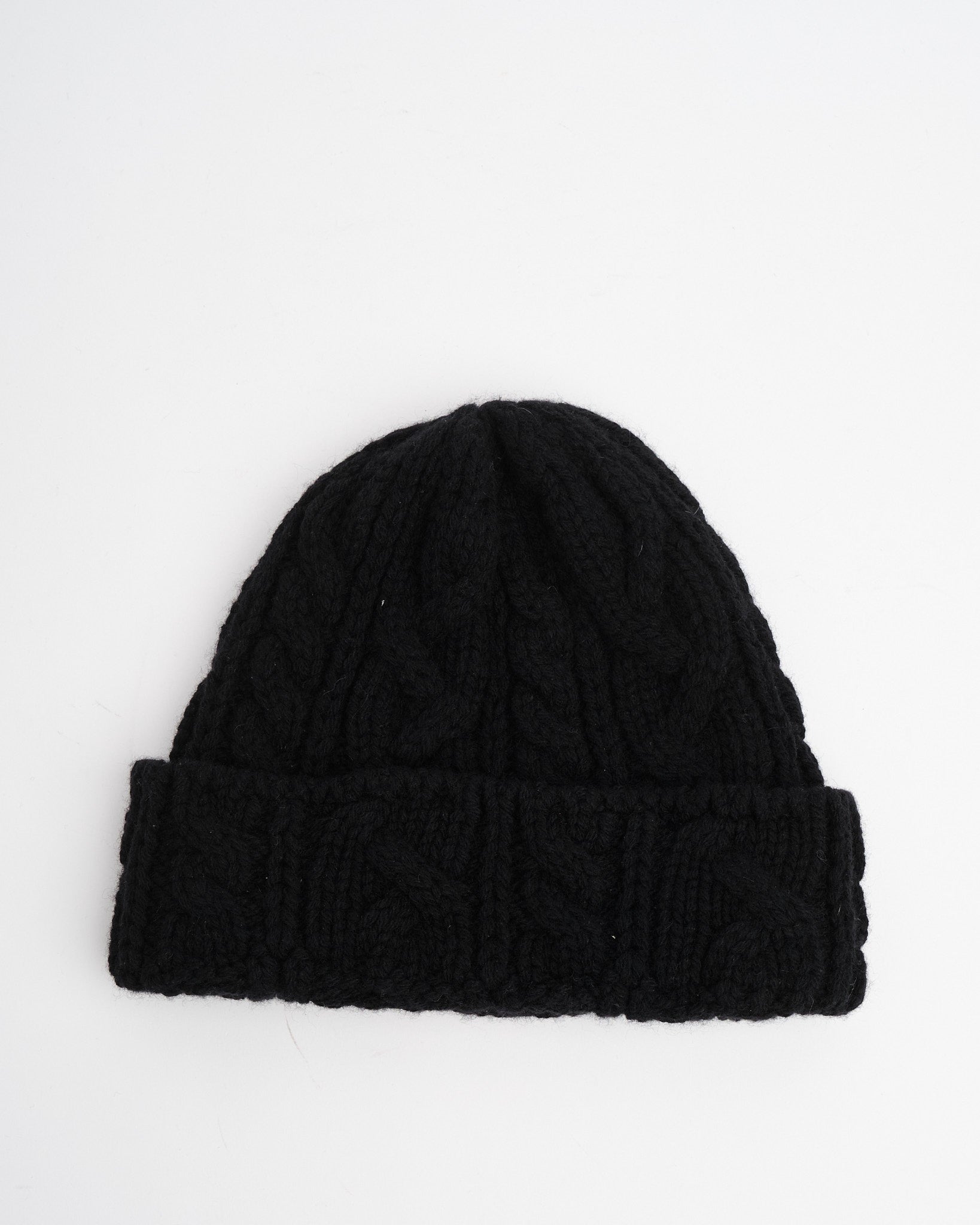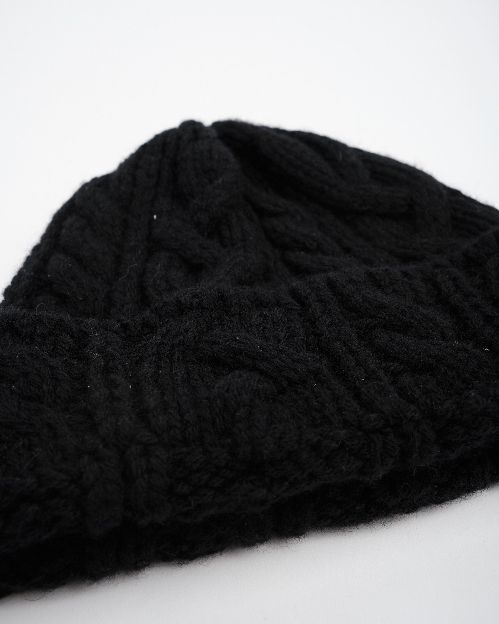 Forbliv hyggelig og moderigtig denne vinter med Black Found Feather Chunky Cable Knit Beanie. Denne hue, omhyggeligt håndlavet i Japan, handler om komfort og varme. Den er lavet med garn af høj kvalitet merinould, hvilket sikrer, at du forbliver varm, samtidig med at dit hoved kan ånde. Det tykke kabelstrikdesign holder dig ikke kun varm, men tilføjer også et strejf af elegance til dit vinteroutfit. Uanset om det er dage eller frostklare aftener, er denne hue et must-have til din vintergarderobe!