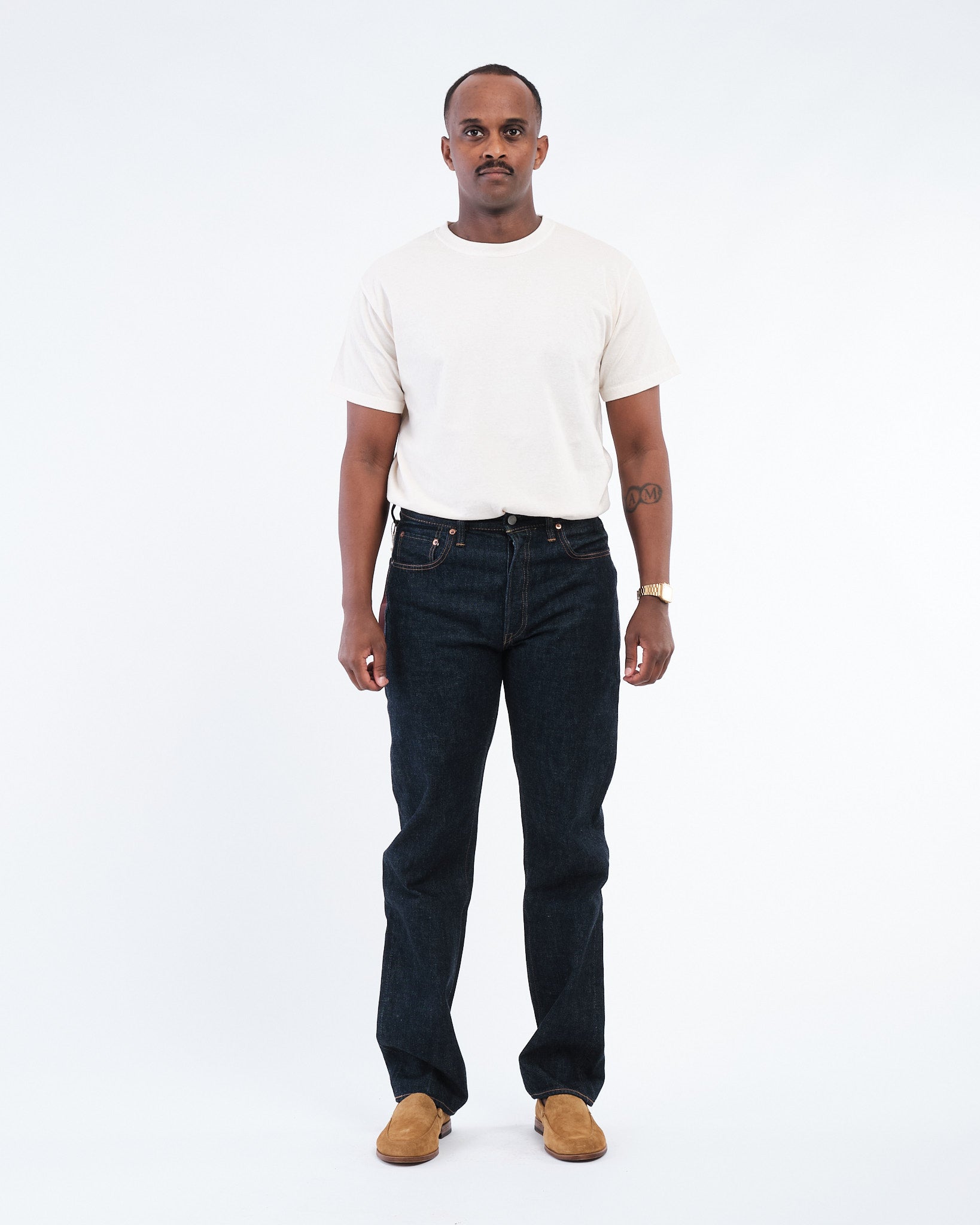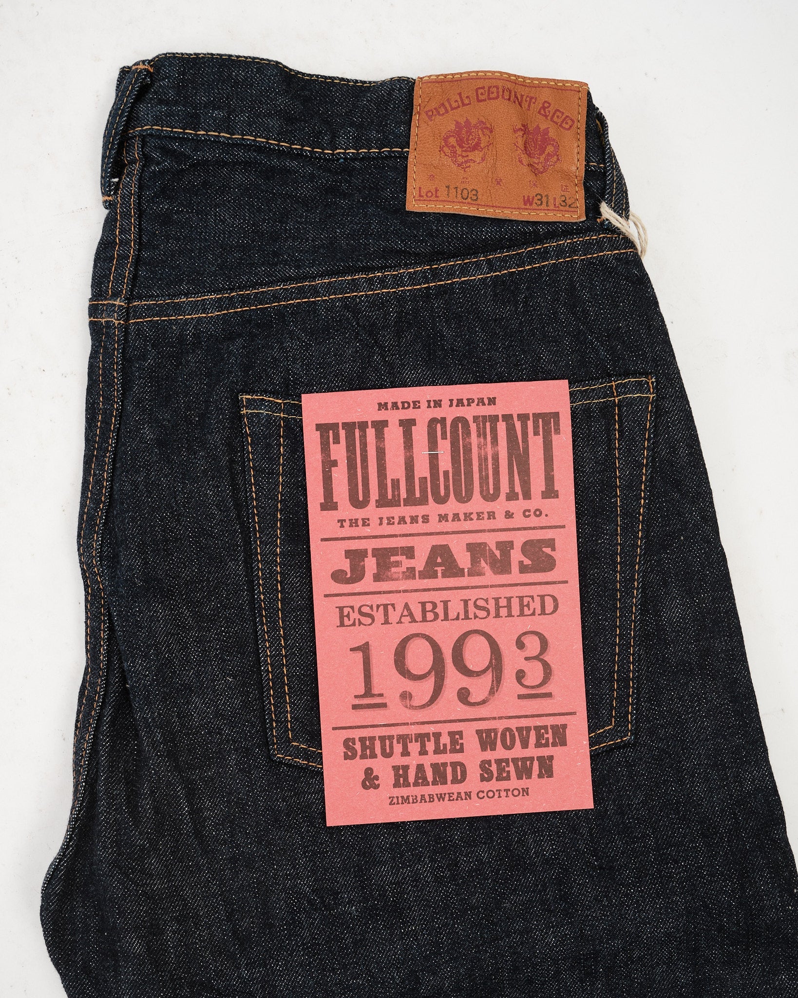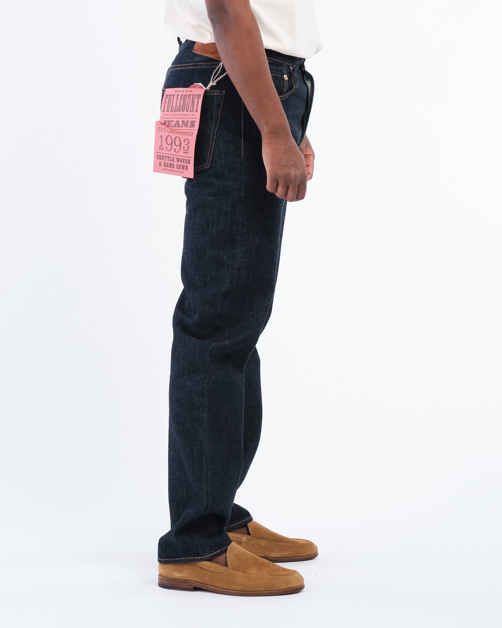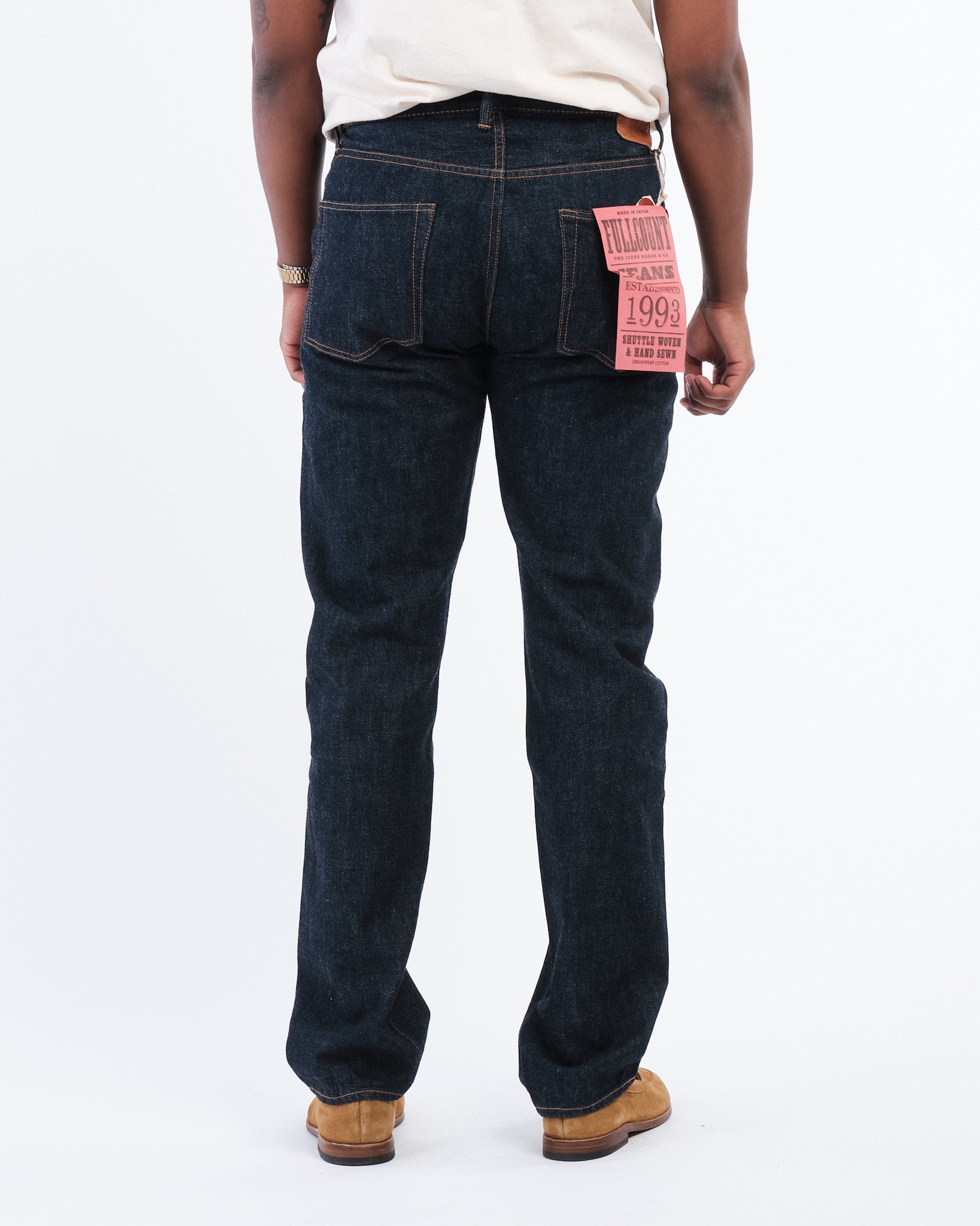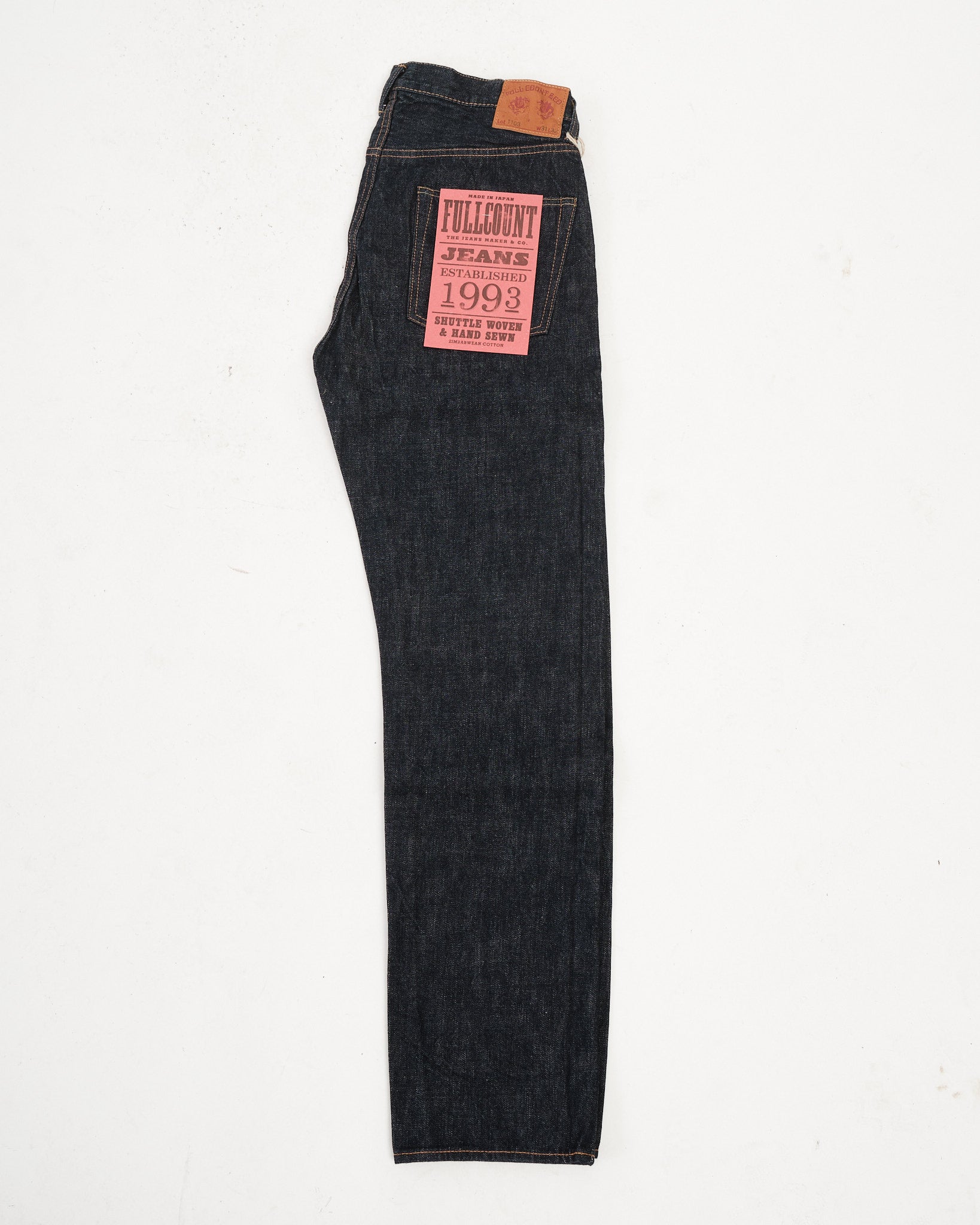 Den FULL COUNT 1103W-23 CLEAN STRAIGHT DENIM i INDIGO BLÅ (1103W-23) introducerer en frisk silhuet designet til at balancere struktur og alsidighed. Udviklet som en del af Full Counts 30-års jubilæumskollektion, sidder denne Clean Straight cut perfekt mellem 1101 og 1108 pasformene, med en lårbredde tættere på 1101 og en bensvidde lignende 1108. Fremstillet af 13.7oz originalt selvedge denim, vævet af 100% Zimbabwe bomuld, tilbyder disse jeans holdbarhed, komfort og en glat tekstur, der blødgør smukt med brug. En subtil detalje—et diagonalt hældende bæltestrop bagpå i midten—tilføjer et karakteristisk touch. Uanset om det er i en vask eller ikke-vask, er denne stil et nyt go-to for denim-entusiaster.