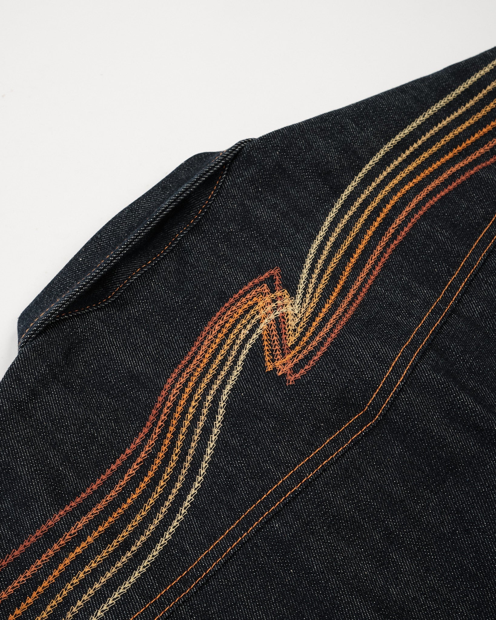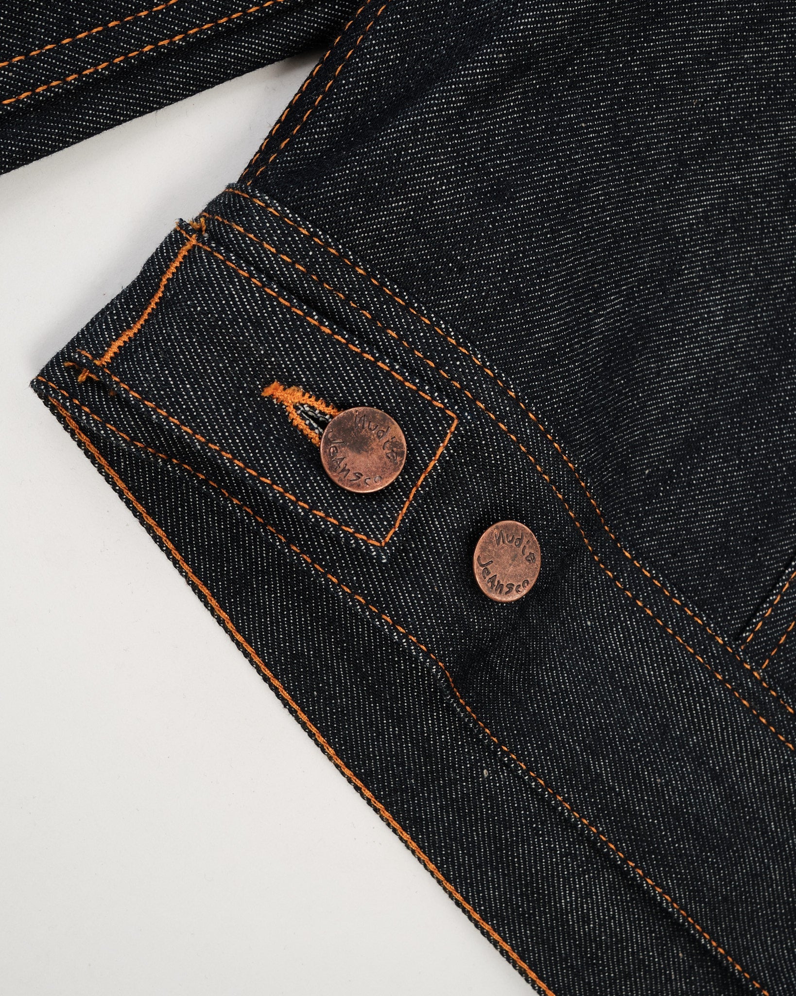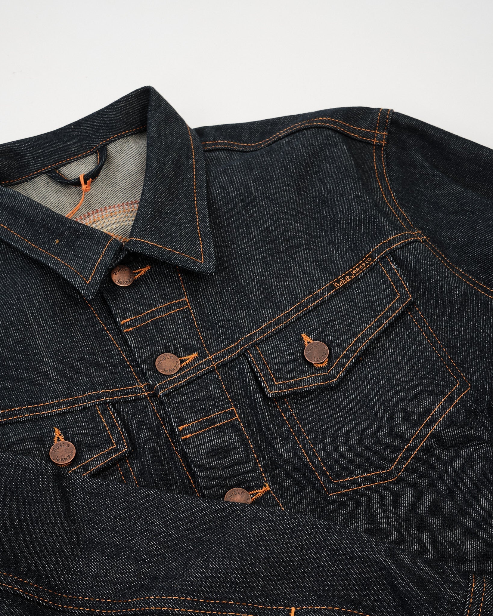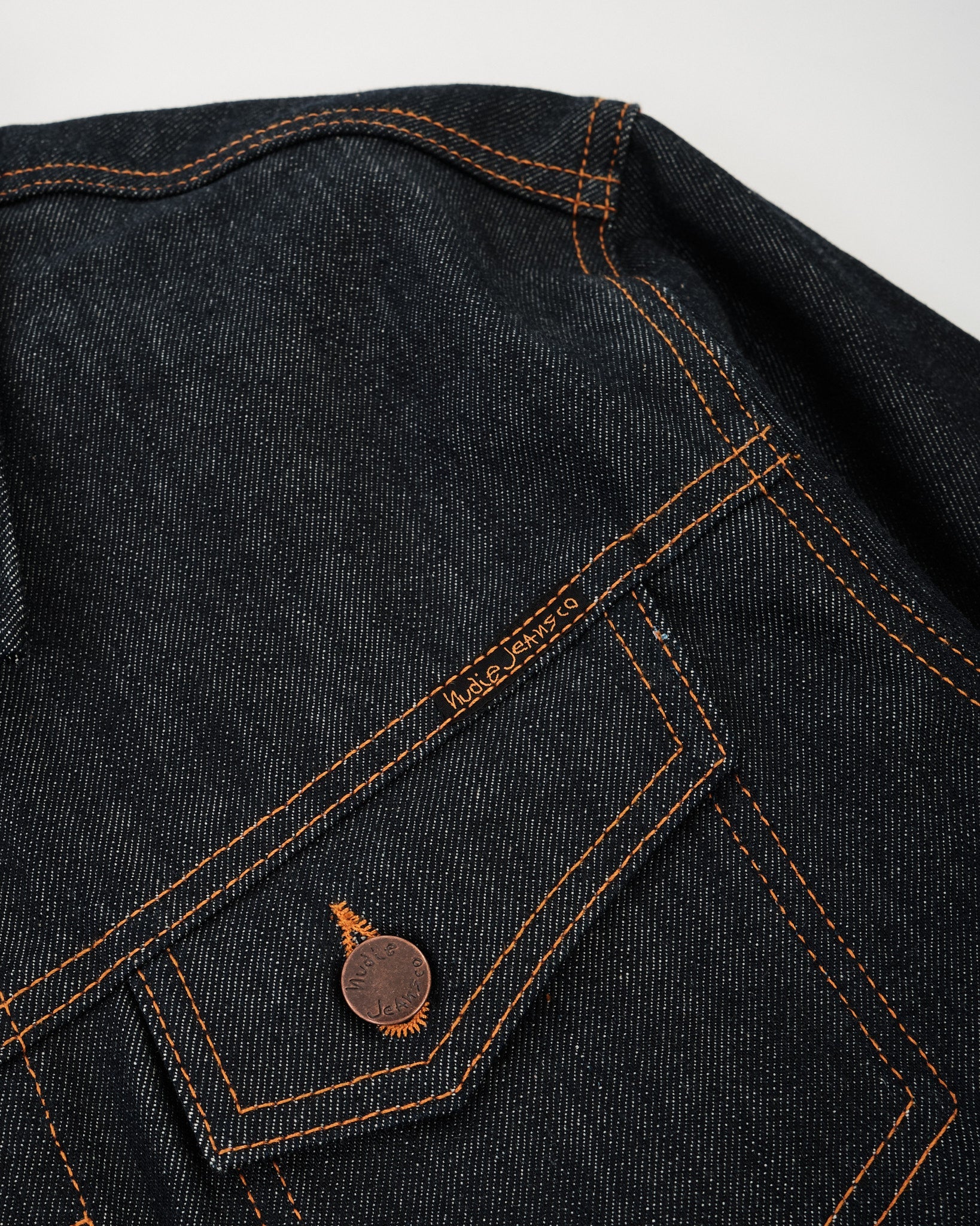 Conny Denim Jakken i Sunburns Blue er Nudies skarpeste tag på en tidløs klassiker. Skåret fra 14,2 oz stift denim lavet med regenerativ økologisk bomuld, parres holdbarhed med et engagement i bæredygtighed. Det fremtrædende træk er et gradient "sunburns" broderi på rygstykket – en dristig detalje, der løfter denne slim-fit jakke fra garderobegrundstof til samtaleemne. Afsluttet med kobberknapper, orange tråd og en jacron patch, er Conny bygget til at blive brugt hårdt og falme smukt.