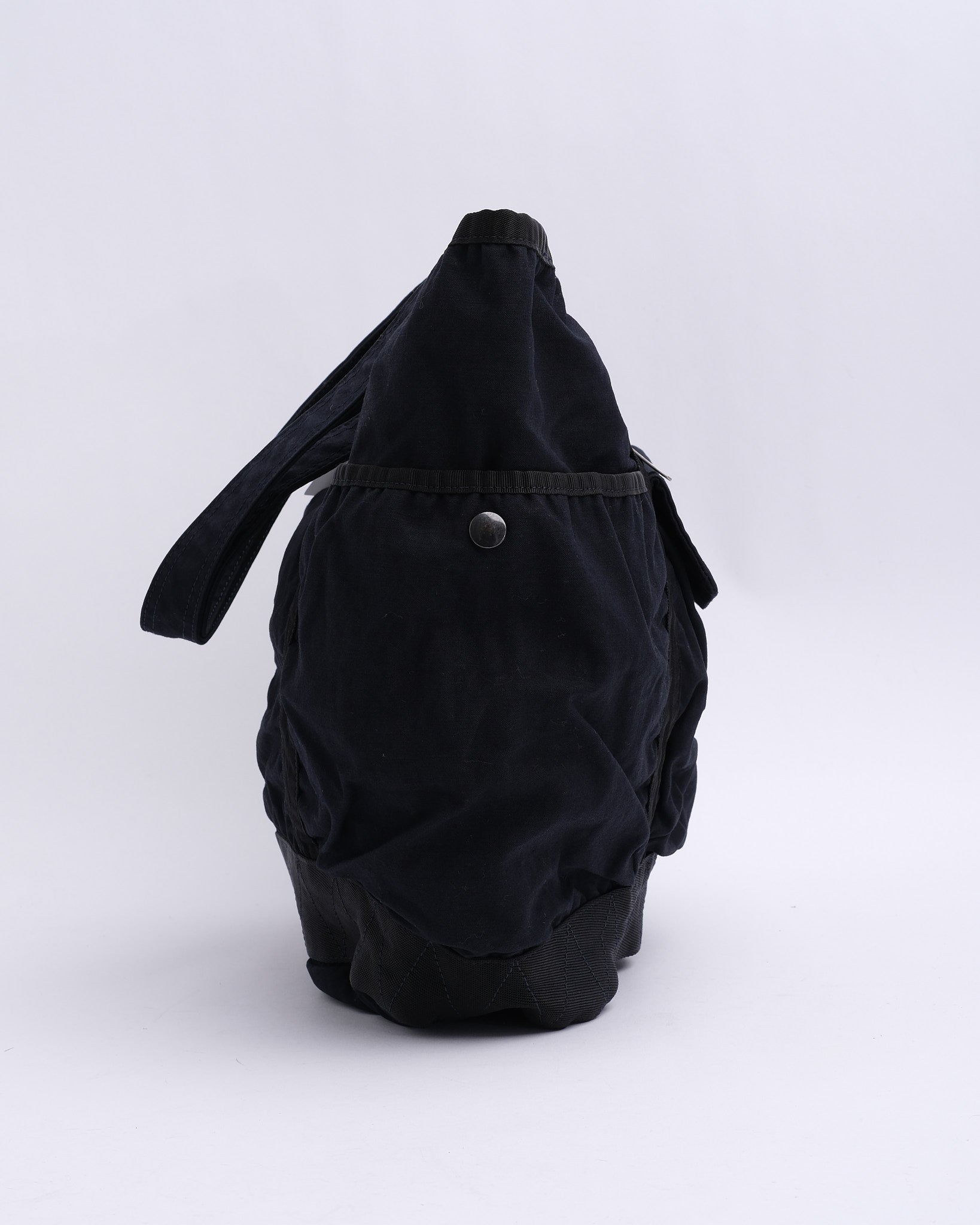 Taskens design inkluderer også nylonbånds accenter og elastisk syning i bunden, hvilket bidrager til dens robuste struktur og sikrer, at tasken kan stå oprejst. Håndtagene er lange nok til at bære over skulderen, hvilket gør denne tote-taske praktisk til daglig pendling eller ærinder.