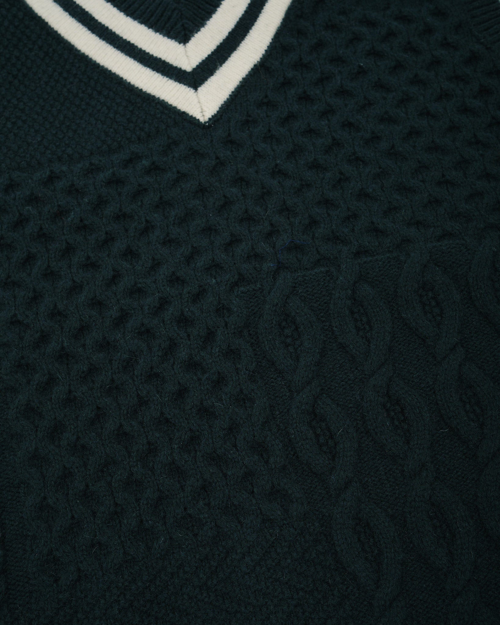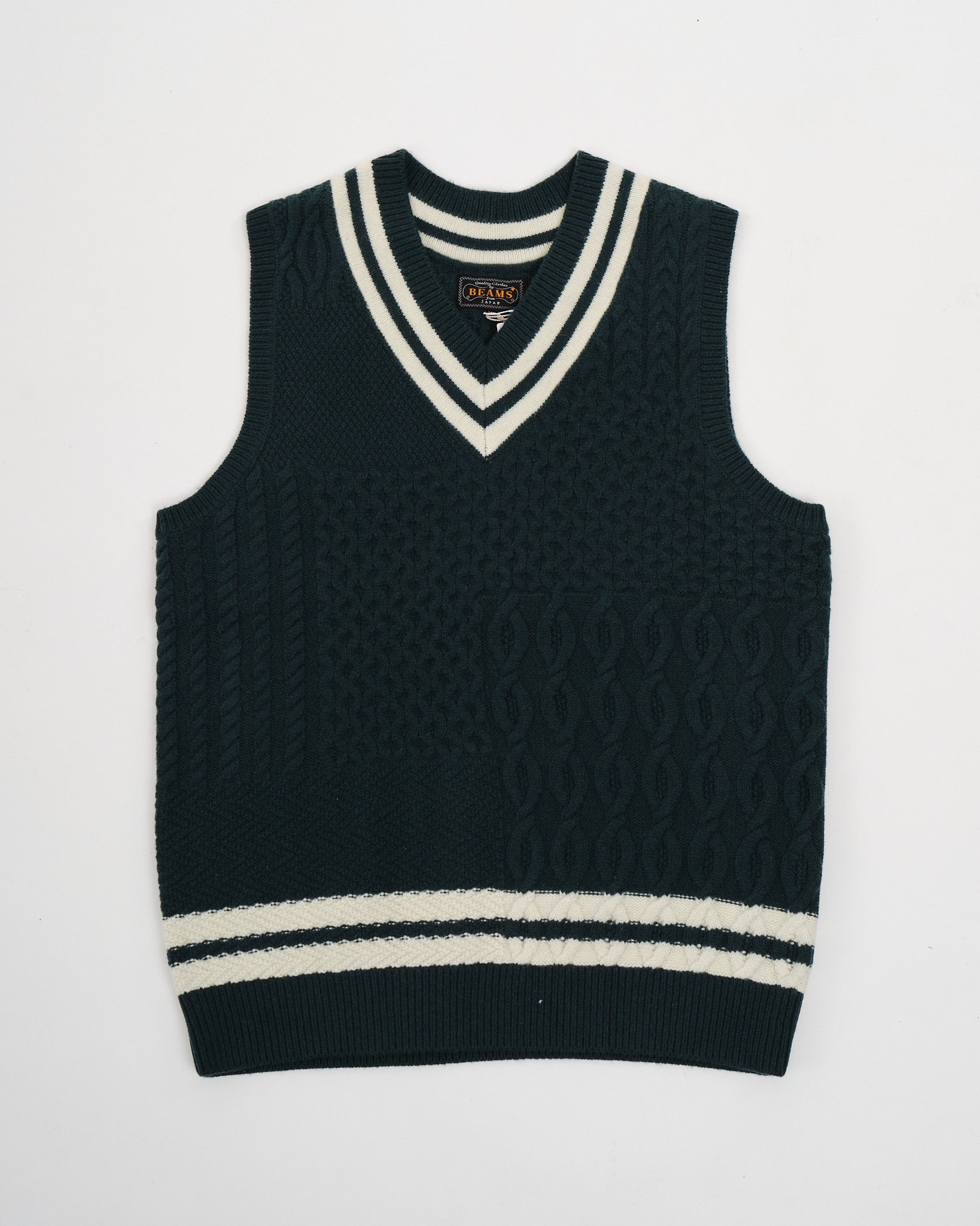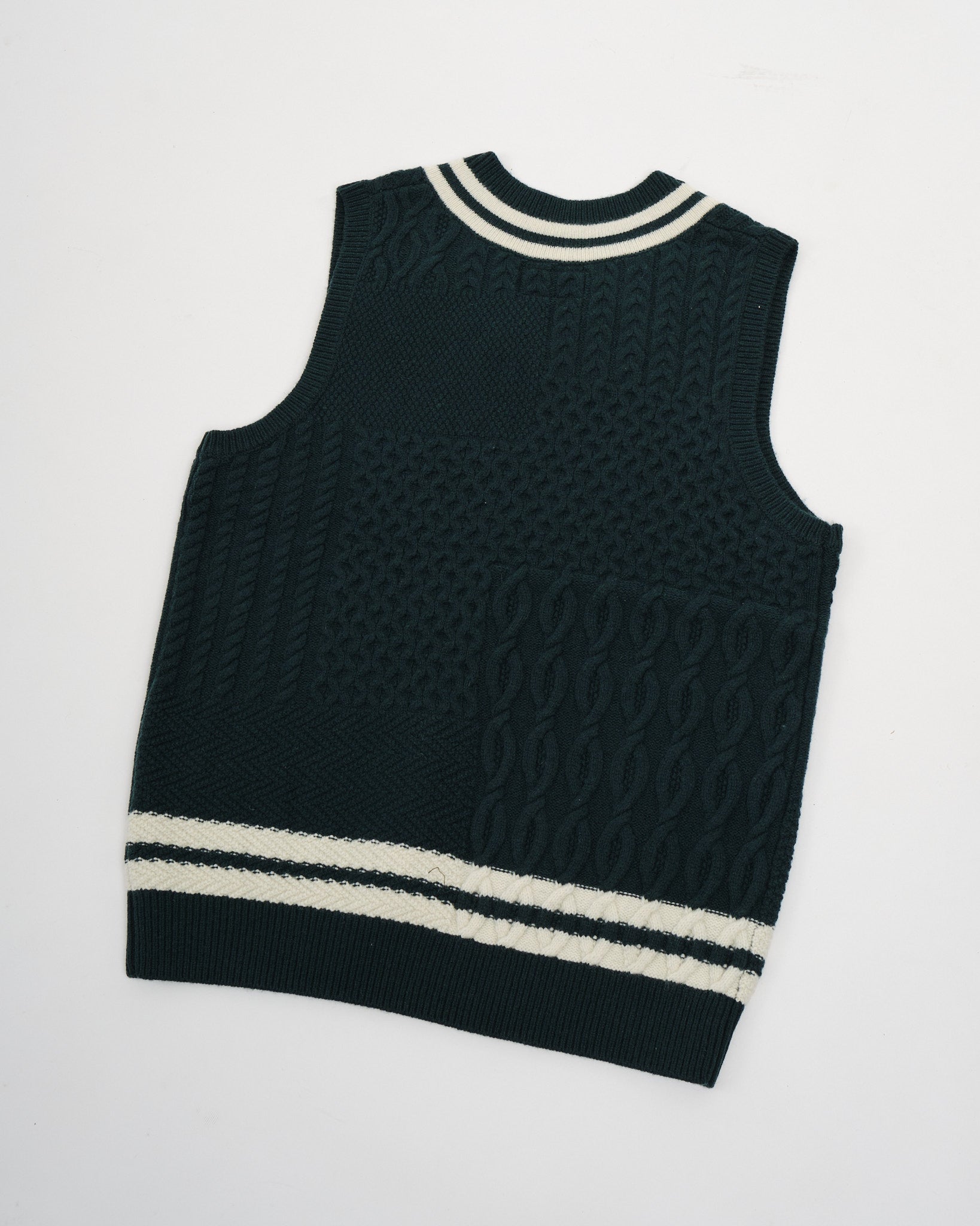 Tjek Beams+ Cricket Vest Patchwork Like Green ud hos Meadow. Denne fantastiske vest viser en blanding af patchwork strik, der lever op til de høje standarder for crickettøj, men med et livligt twist. Komplekse kabel-, fugleøje- og fiskebensmønstre er mesterligt kombineret, hvilket resulterer i et dynamisk look. Fremstillet af en uld nylon blanding, har den et ærmeløst design med karakteristiske strikkede stribe detaljer på sin ribstrikkede V-hals og nederste bånd. Ærmegabene er fremhævet af ribbede manchetter, mens patchwork-stil finishen skabt med forskellige strikketeksturer tilføjer et uventet touch. Med sin let kortede pasform er den perfekt til stilfulde lag-på-lag muligheder.