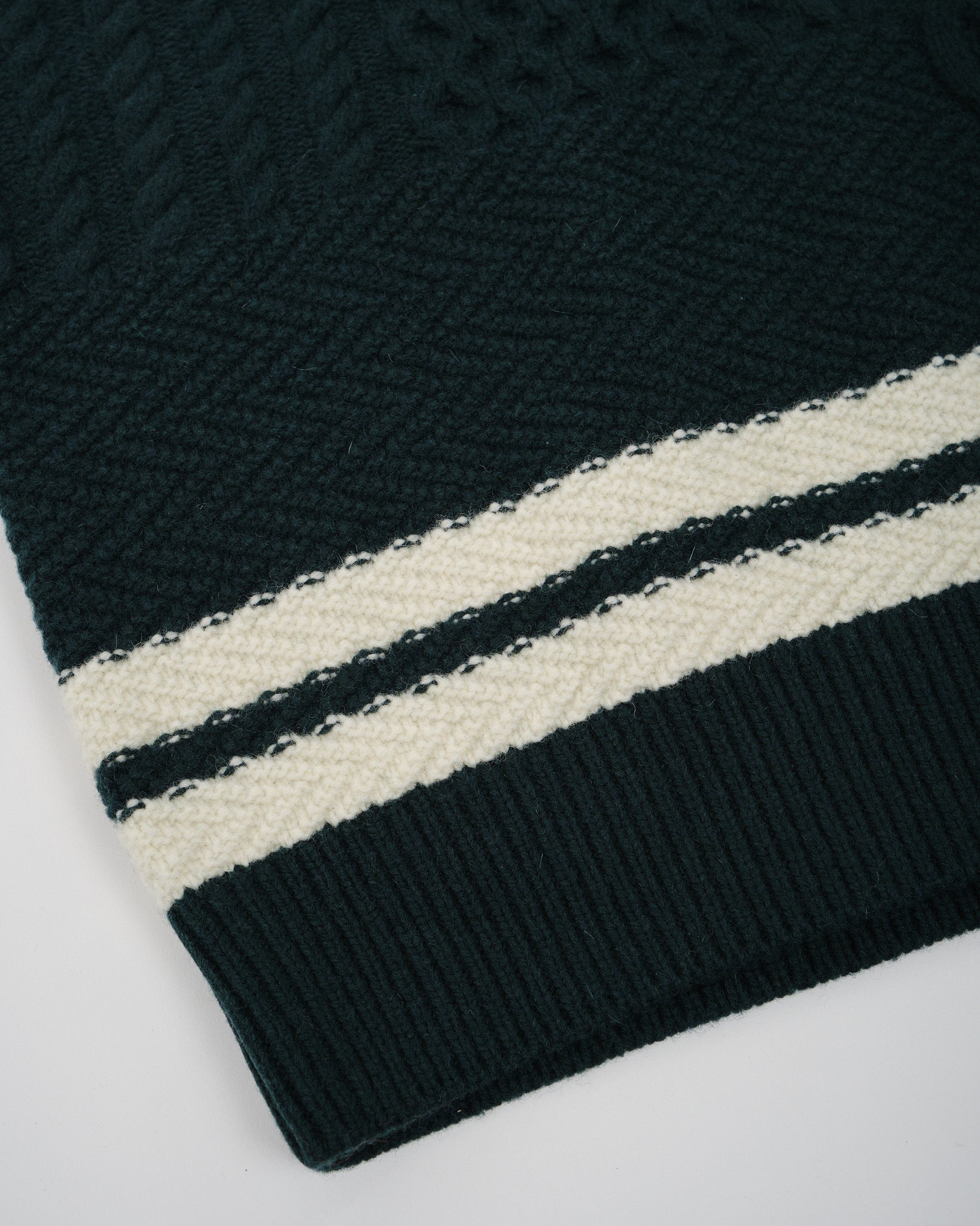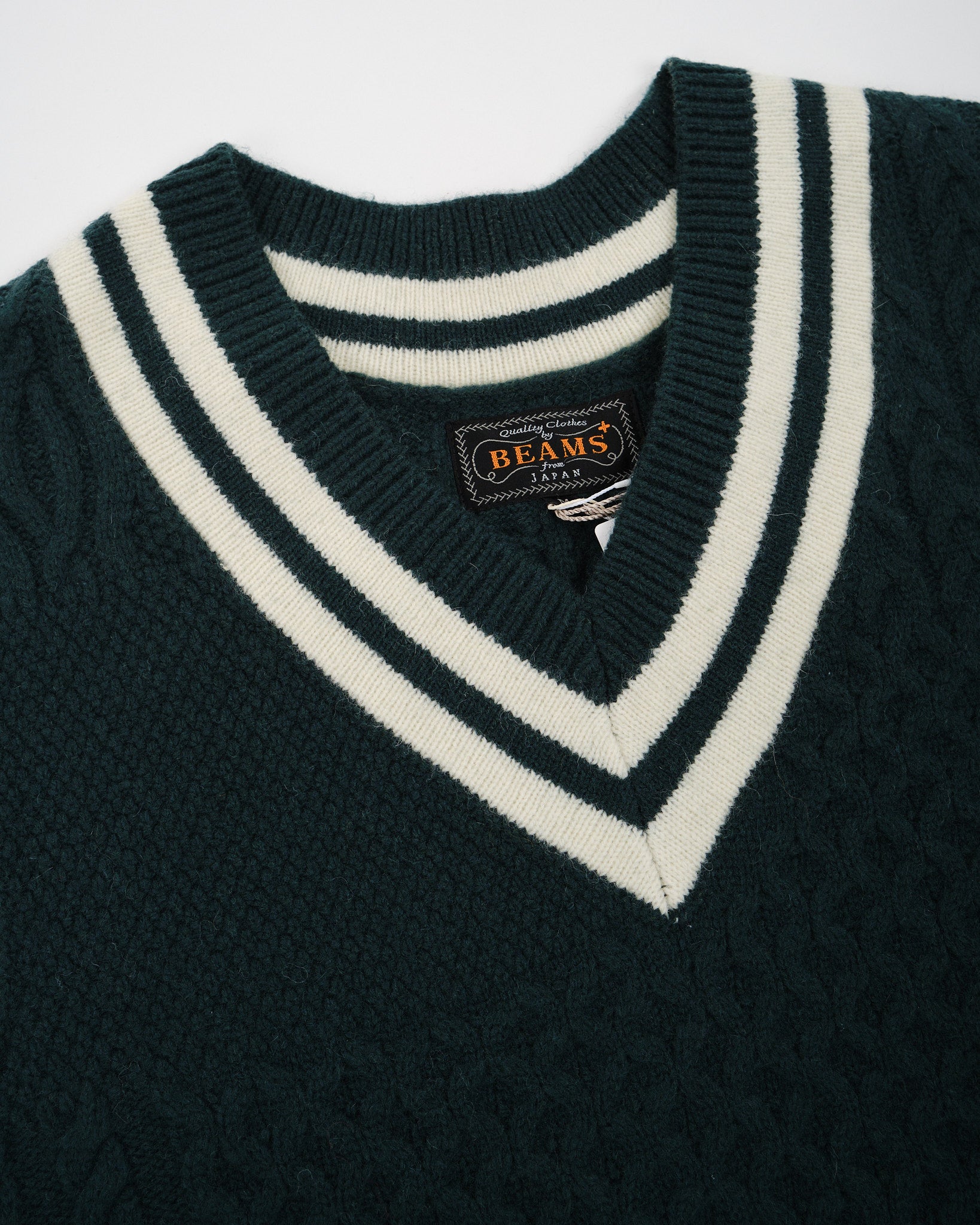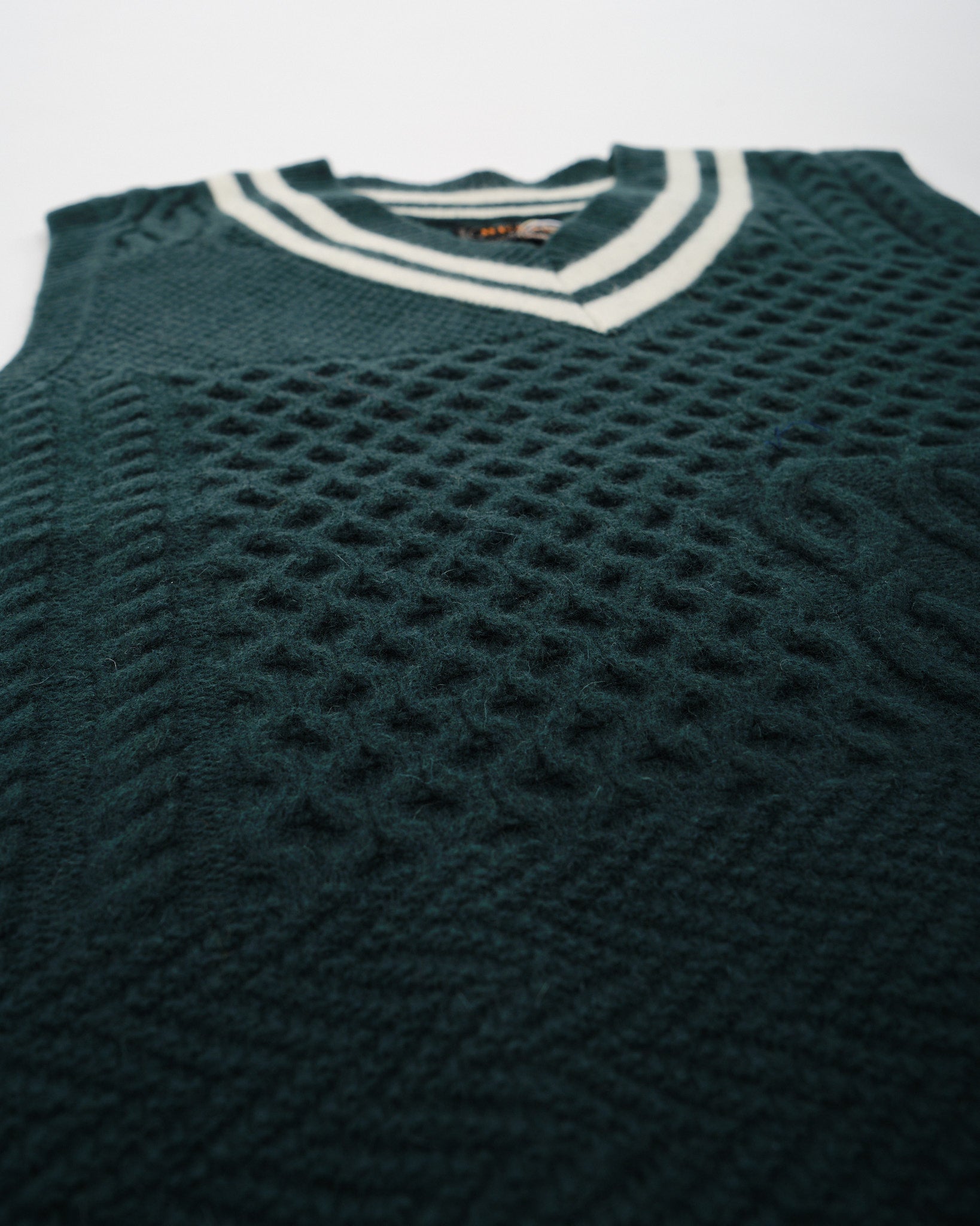 Tjek Beams+ Cricket Vest Patchwork Like Green ud hos Meadow. Denne fantastiske vest viser en blanding af patchwork strik, der lever op til de høje standarder for crickettøj, men med et livligt twist. Komplekse kabel-, fugleøje- og fiskebensmønstre er mesterligt kombineret, hvilket resulterer i et dynamisk look. Fremstillet af en uld nylon blanding, har den et ærmeløst design med karakteristiske strikkede stribe detaljer på sin ribstrikkede V-hals og nederste bånd. Ærmegabene er fremhævet af ribbede manchetter, mens patchwork-stil finishen skabt med forskellige strikketeksturer tilføjer et uventet touch. Med sin let kortede pasform er den perfekt til stilfulde lag-på-lag muligheder.