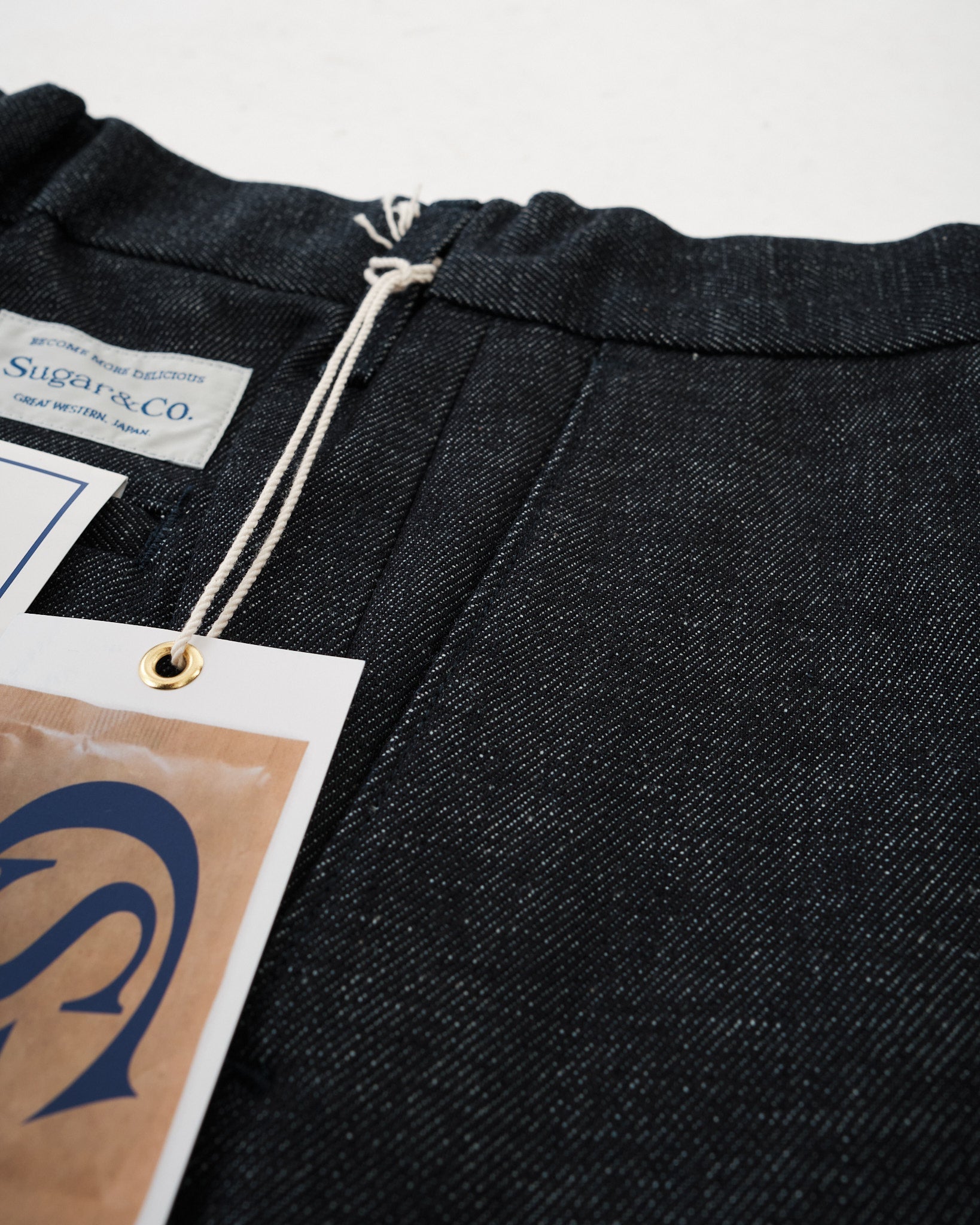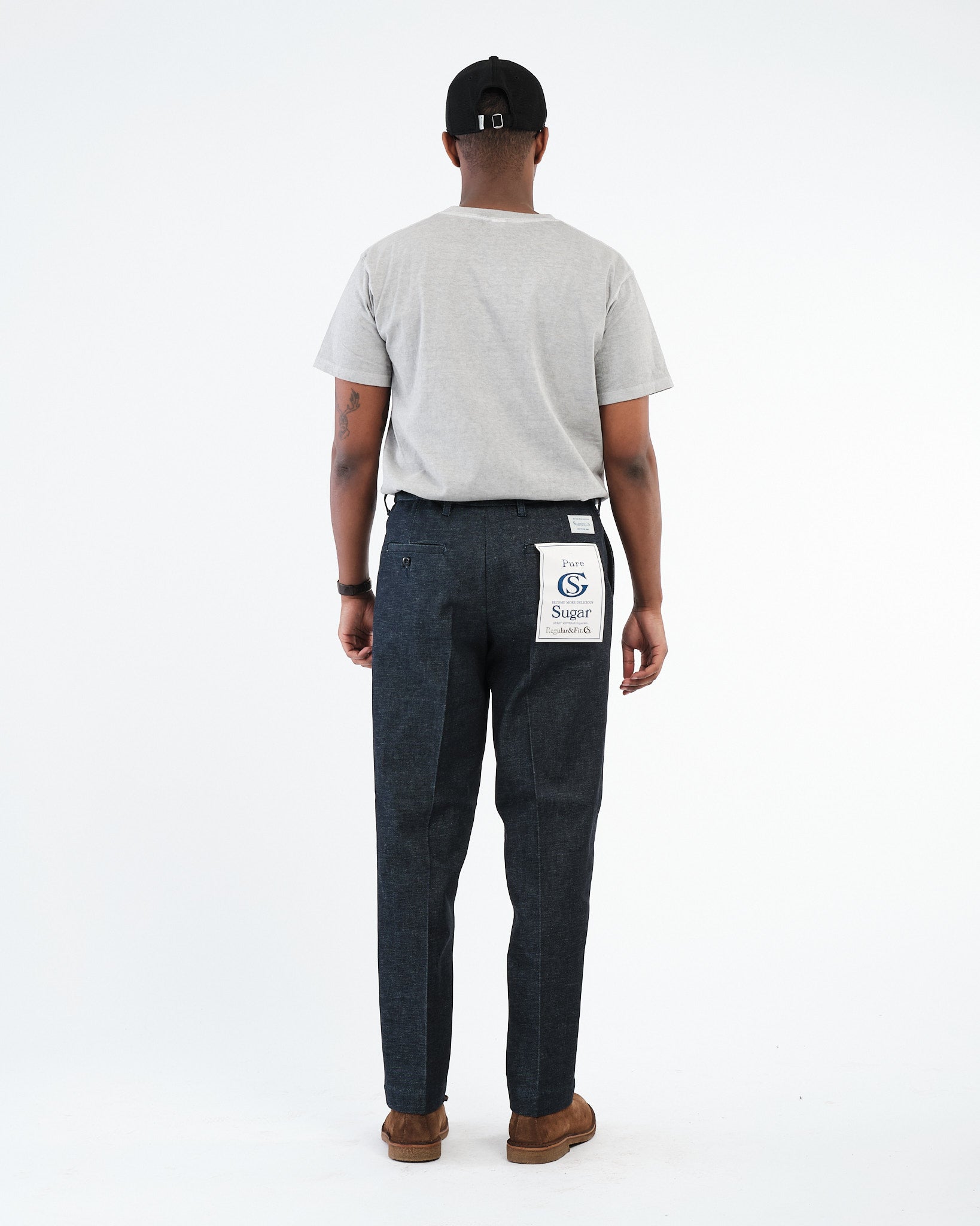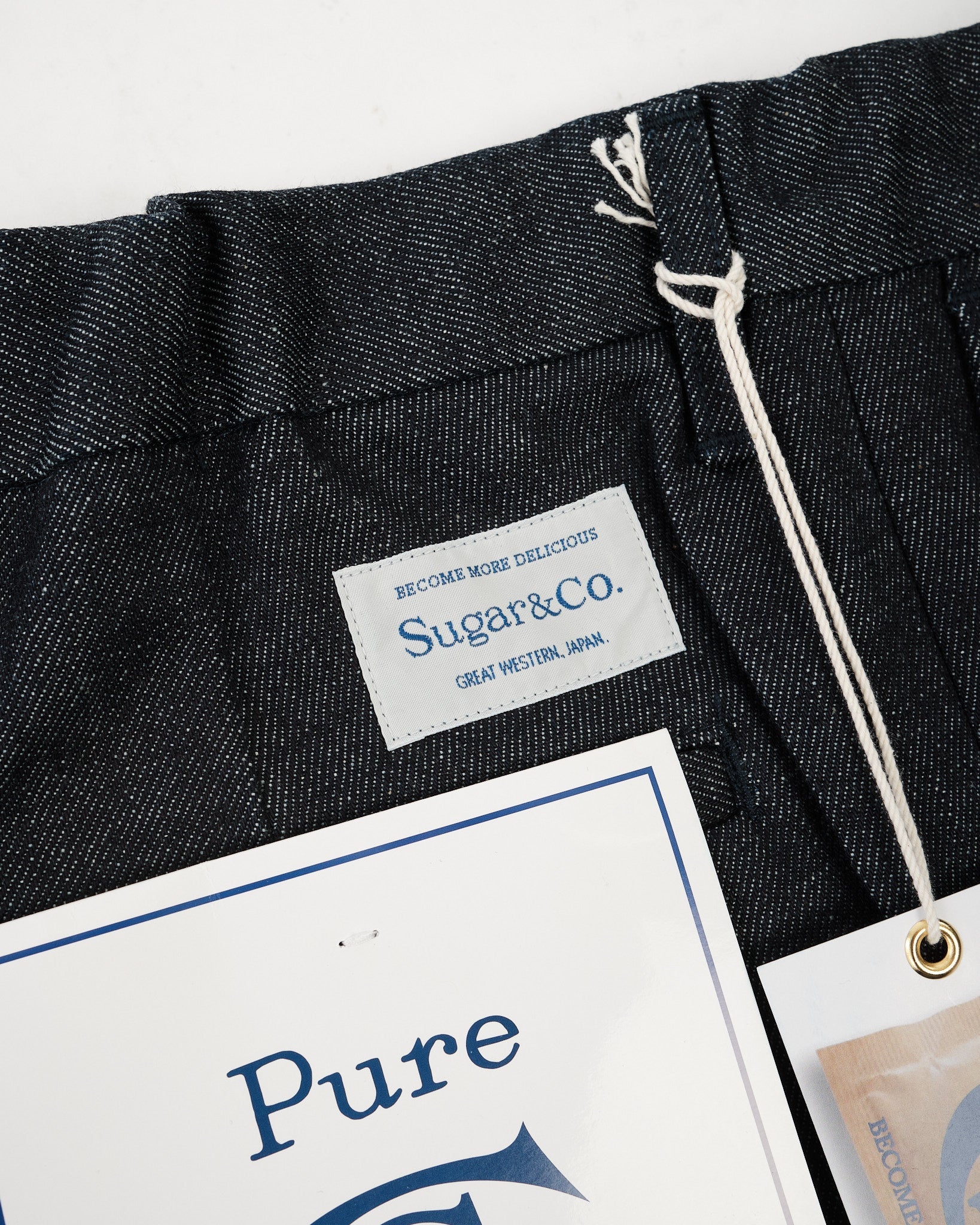 Præsenterer SUGAR & CO. DADDY'S PANTS i en rig Indigo nuance. Disse bukser er en flagskibsmodel fra Sugar & Co., der viser mærkets dedikation til kvalitet og tidløst design. Fremstillet i Japan af 100% amerikansk bomuld, tilbyder stoffet en robust, men tør tekstur, der bliver mere behagelig med tiden. Den dybe indigo farve, opnået ved brug af garner med betydelig variation, sikrer unikke falmnings- og ældningsegenskaber, hvilket tillader bukserne at udvikle en personlig patina over tid.