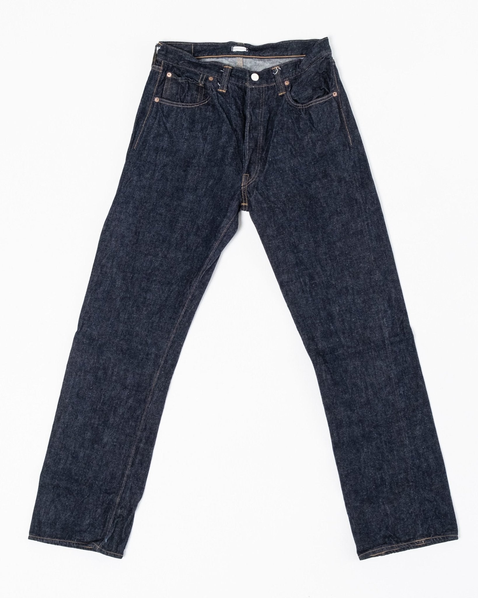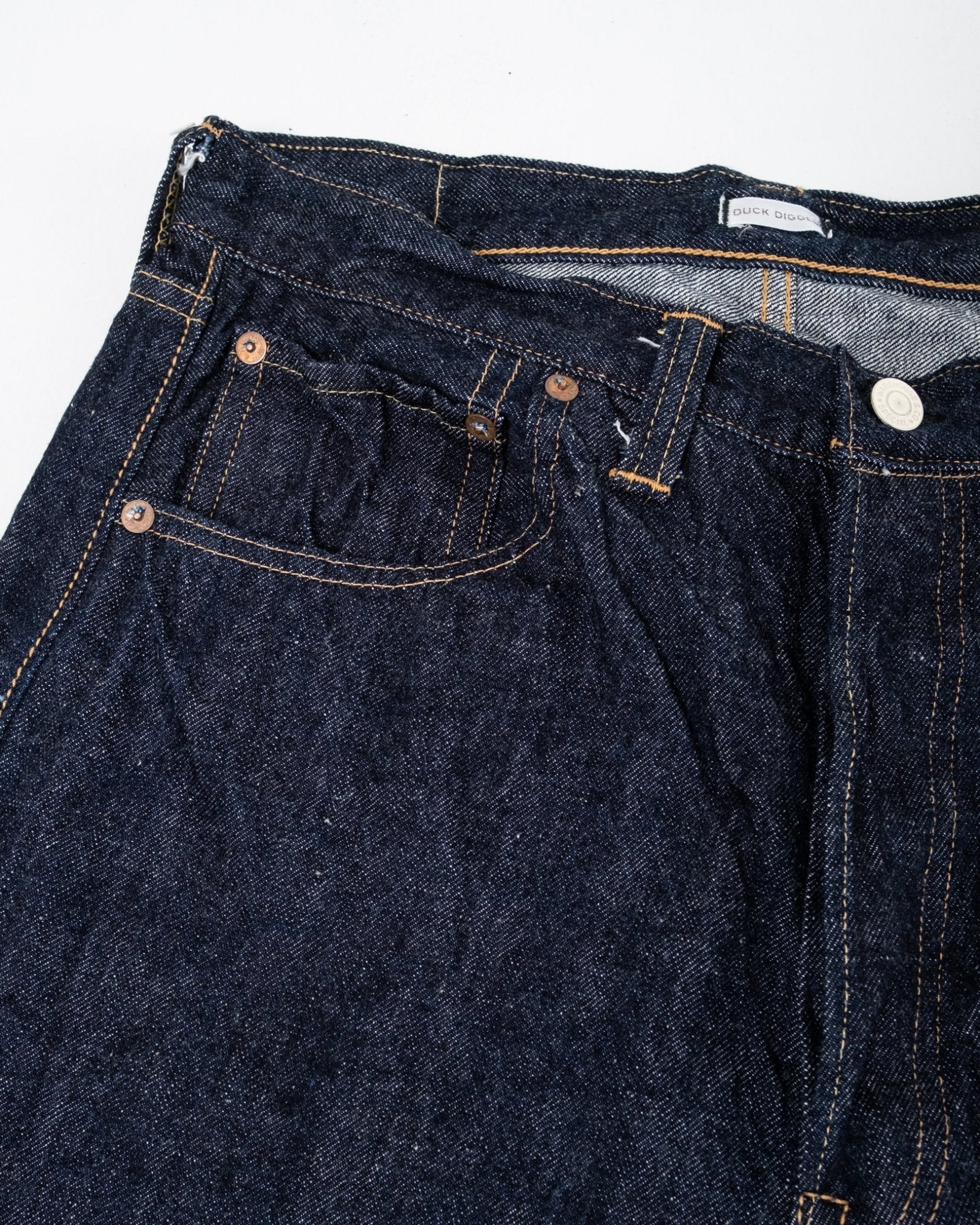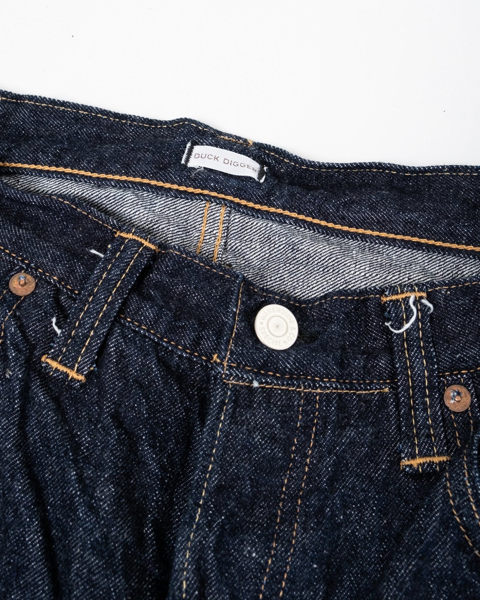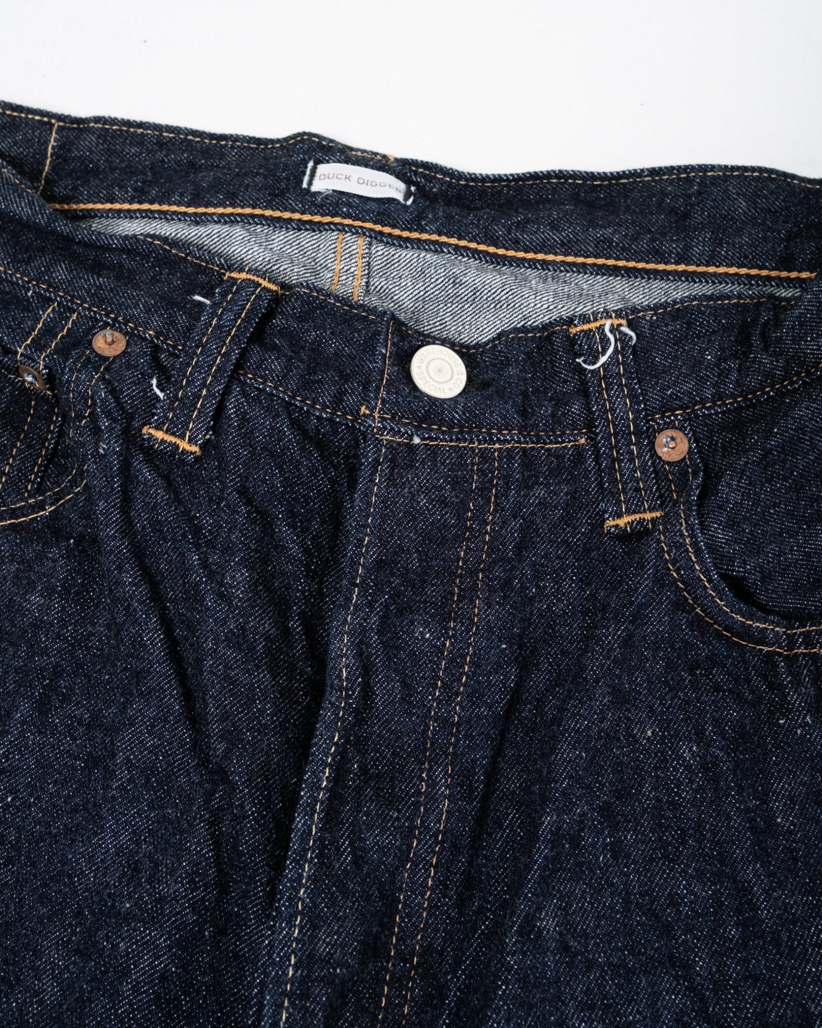 Duck Digger 1001XX One Wash fra Warehouse & Co. Denne jeans er et 1947 snit, med en dyb stigning og en mild tilspidsning. Warehouse syer dem i deres 13,5 oz Banner Denim. Dette lige fit par er baseret på en 1947's model i en bomuldsblanding fra Arizona, Tennessee og Texas, som genskaber den naturlige ujævne garnkarakteristik fra tiden. Uforarbejdet denim, der er vasket én gang for et flot vintage look, plus at det friholder dig for alt besværet med krympning. Fremstillet i Japan.