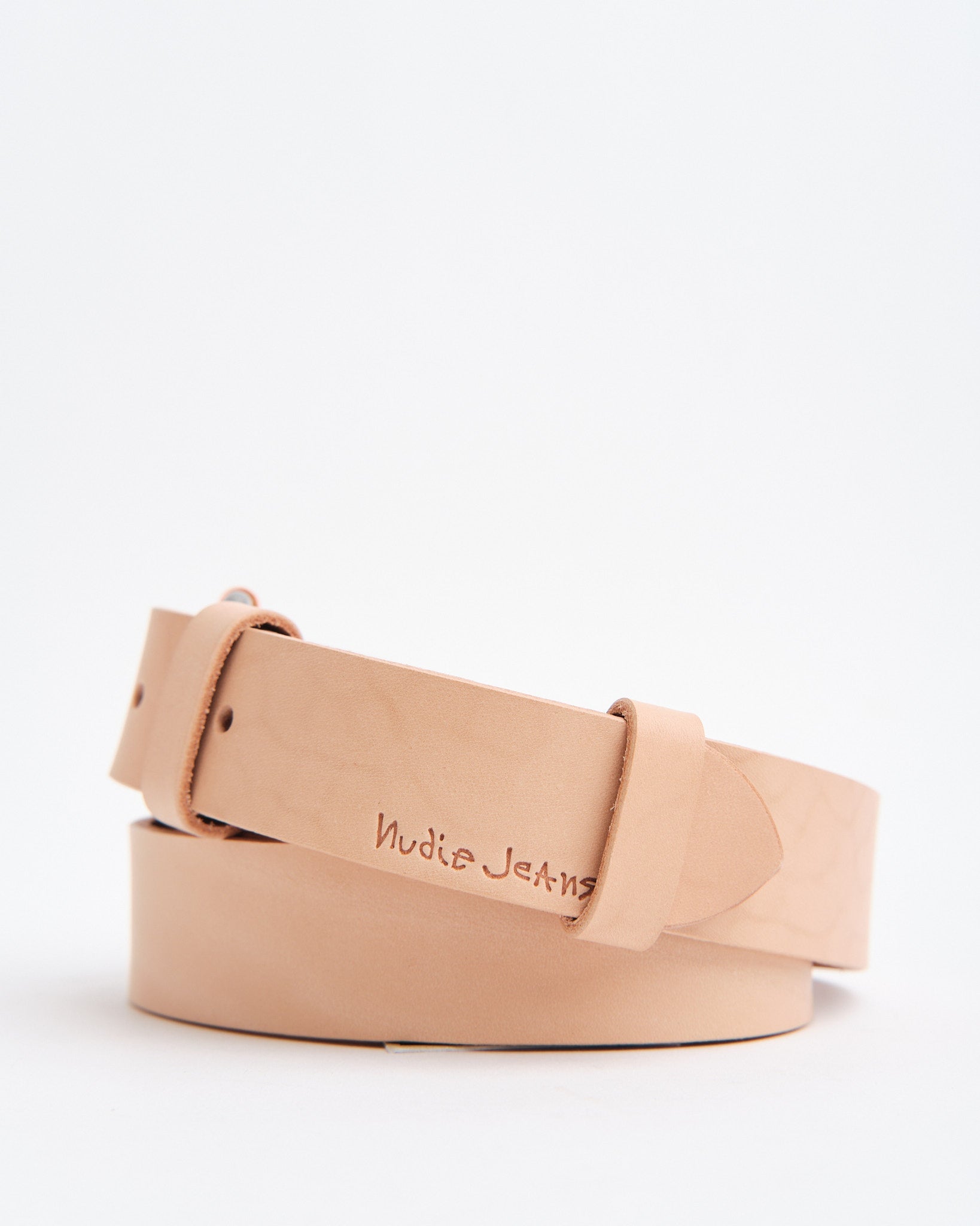 Dwayne læderbælte naturlig fra Nudie Jeans Co. Skåret fra et vegetabilsk garvet fuldkornslæder, der vil ældes smukt. To løkker, metal spænde og Nudie Jeans præget logo. 100% læder og 28 mm bredde. Størrelser er i cm. Fremstillet i Polen.