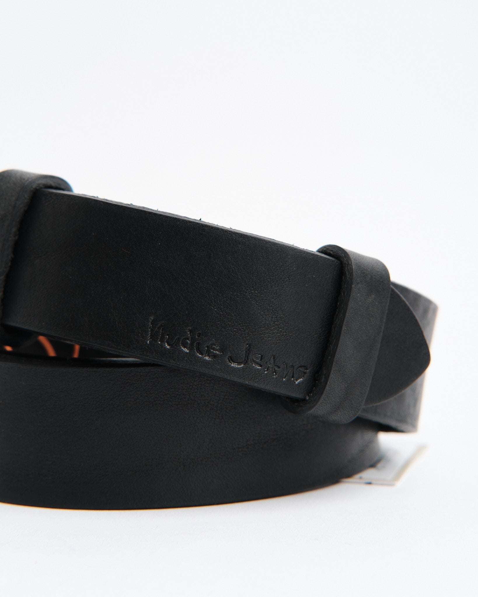 Dwayne Læderbælte Sort fra Nudie Jeans Co. Skåret fra et vegetabilsk garvet fuldkornslæder, der vil ældes smukt. To løkker, metal spænde og Nudie Jeans præget logo. 100% læder og 28 mm bredde. Størrelser er i cm. Fremstillet i Polen.