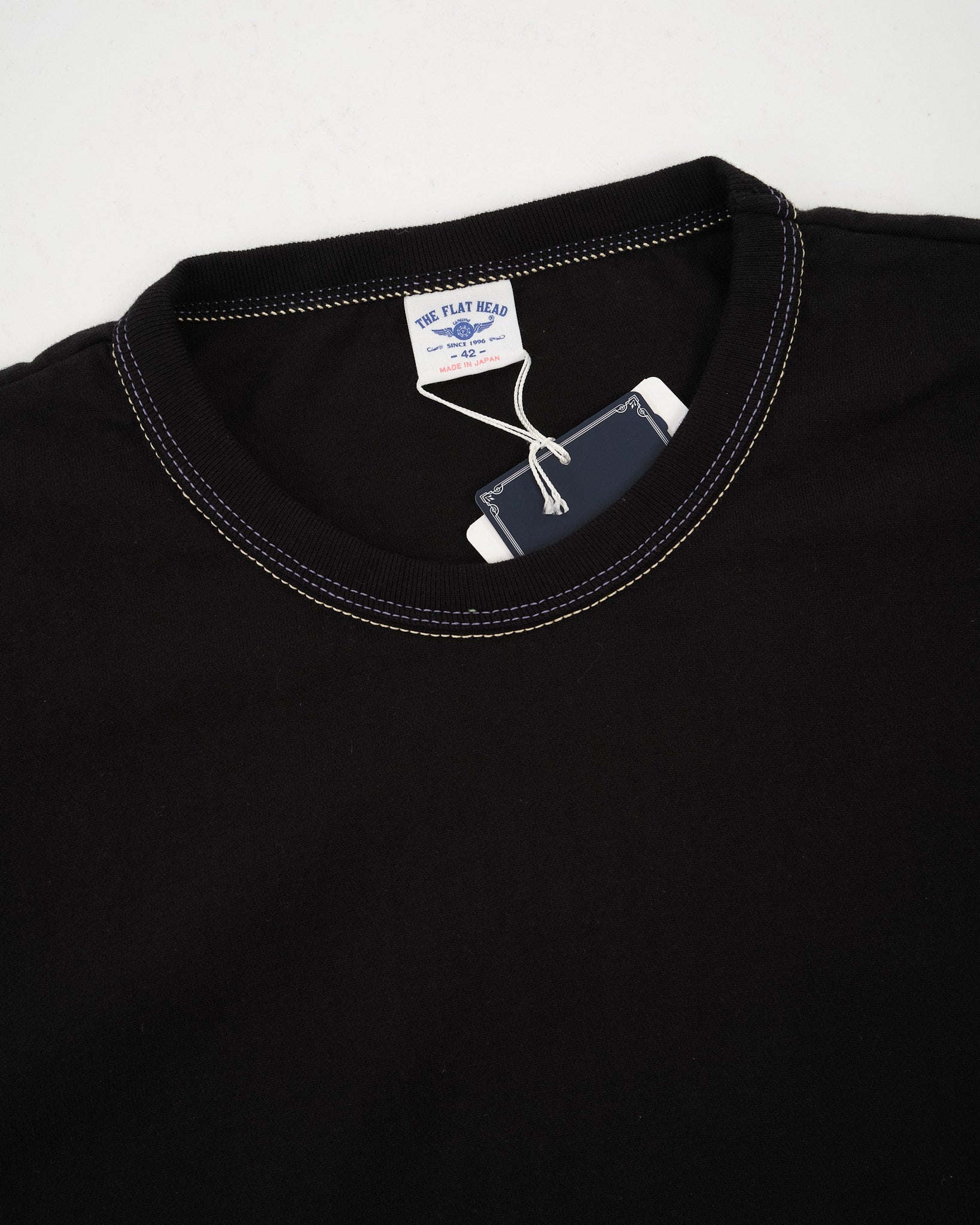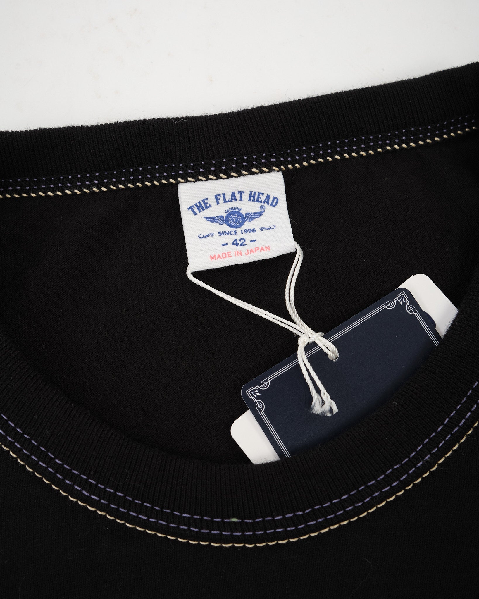 Hver del er vasket én gang, hvilket giver den en blød fornemmelse fra første brug samtidig med at bevare dens rige sorte farve. Lavet i Japan, eksemplificerer denne T-shirt Flat Heads dedikation til førsteklasses materialer og eksperttrykteknikker, leverer modigt design med overlegen håndværk.