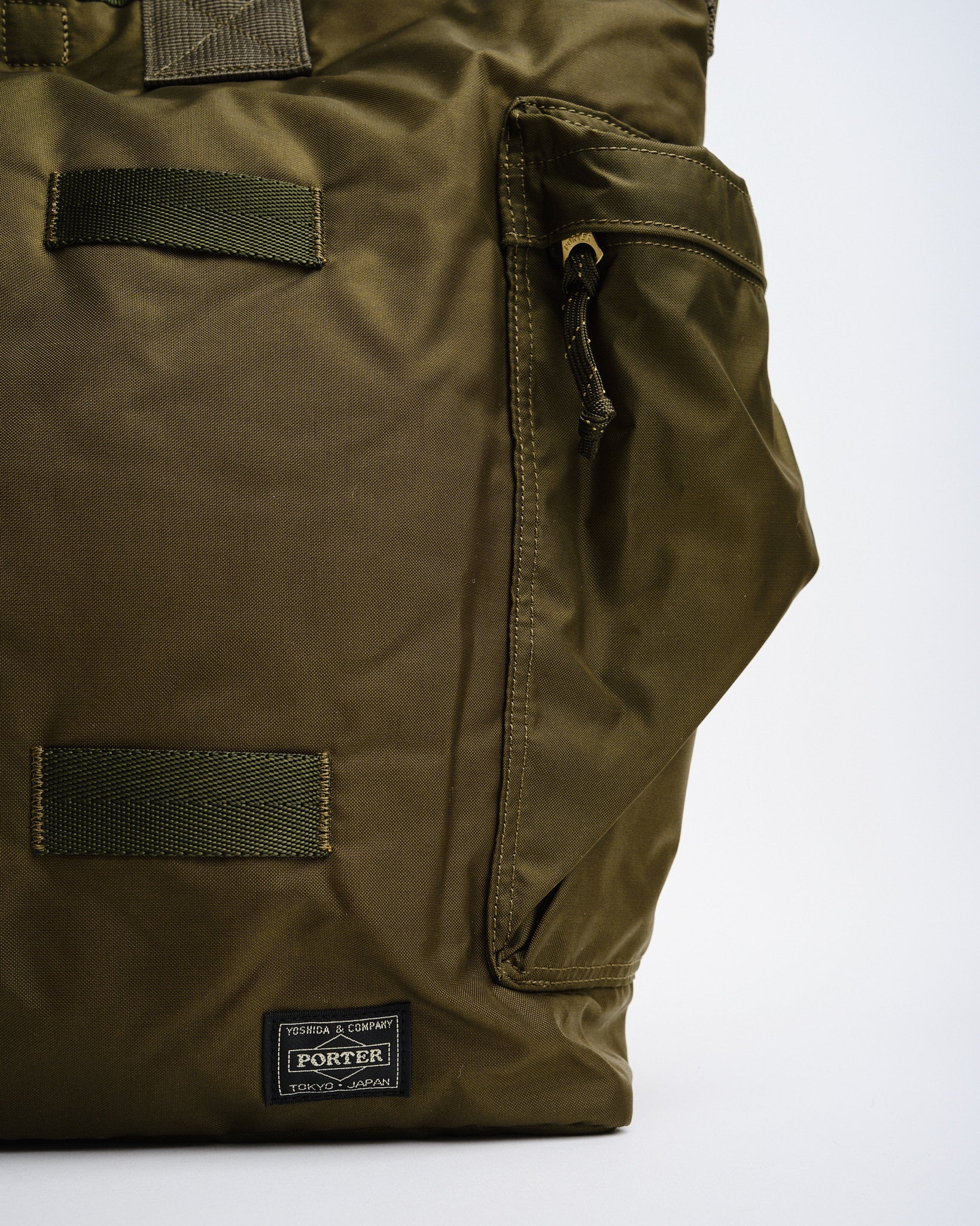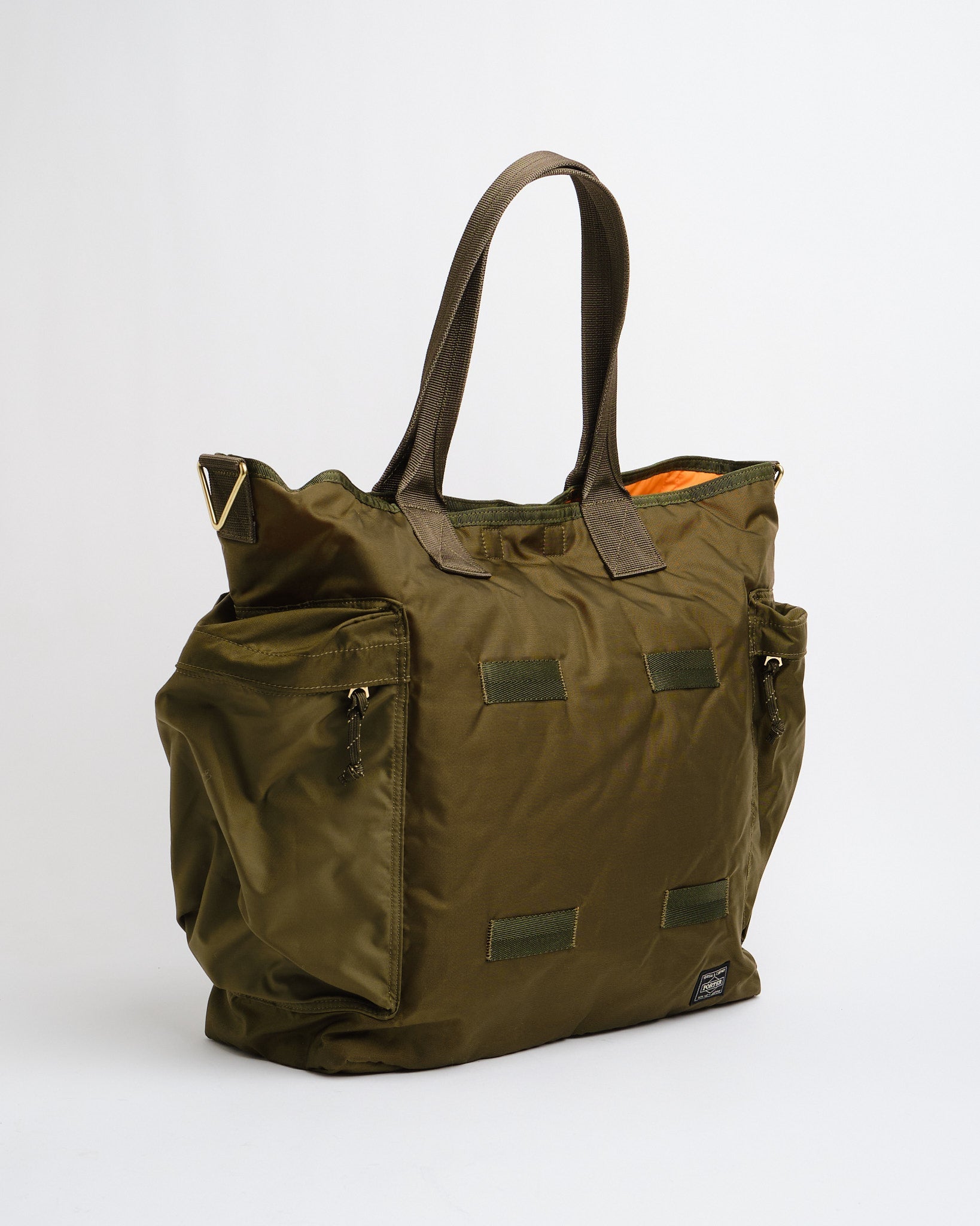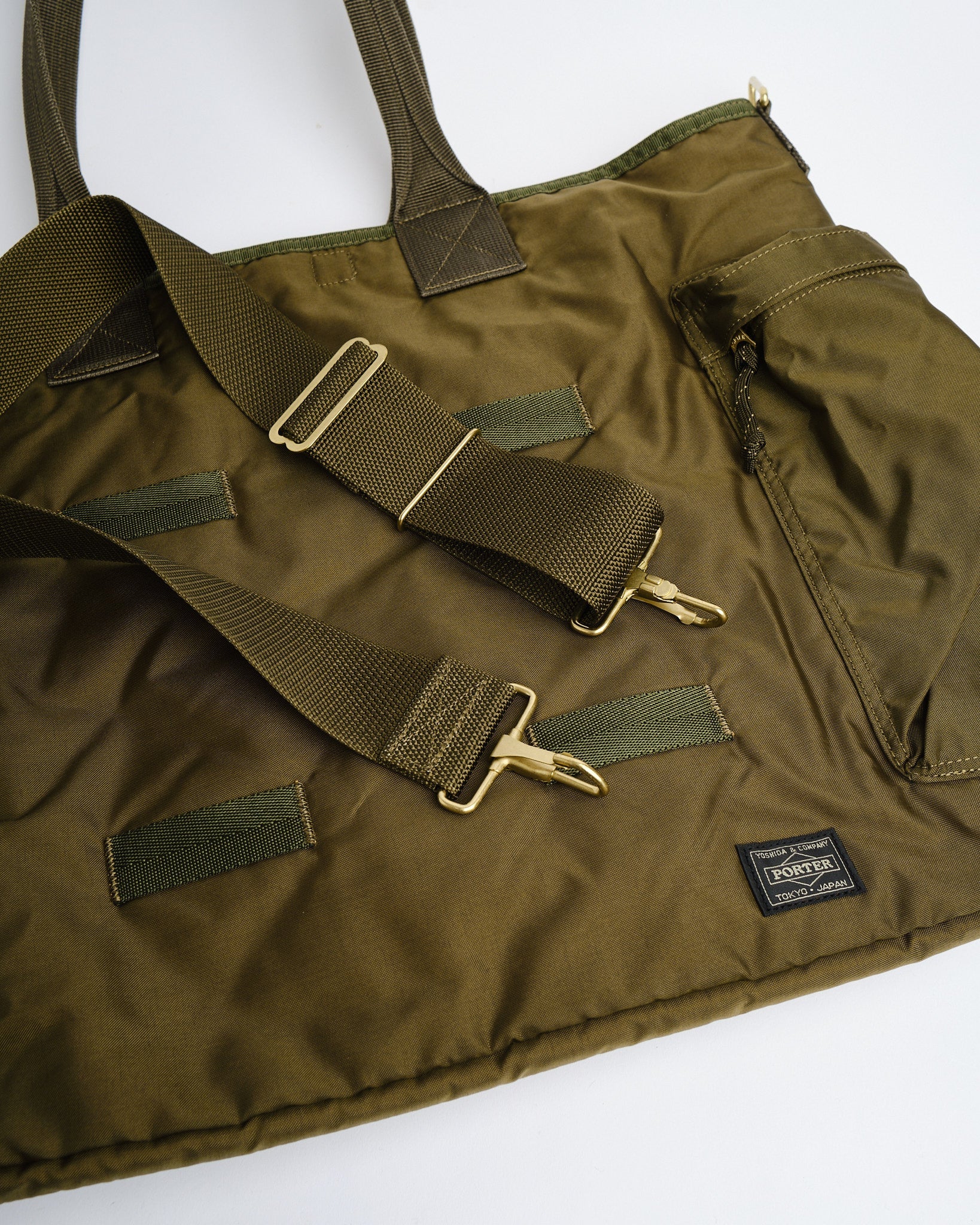 Den PORTER BY YOSHIDA Force 2-Way Tote Bag er en del af PORTER FORCE serien, inspireret af militær æstetik og de tilfældige farveforskelle, der findes i militærgoder. Et fremtrædende træk er den subtile farvevariation mellem stoffet på frontlommen og taskens hovedkrop, hvilket skaber indtrykket af at bruge forskellige stofpartier. Denne serie fejrer de uregelmæssige farveskemaer, der naturligt opstår i militært tøj og tilbehør.