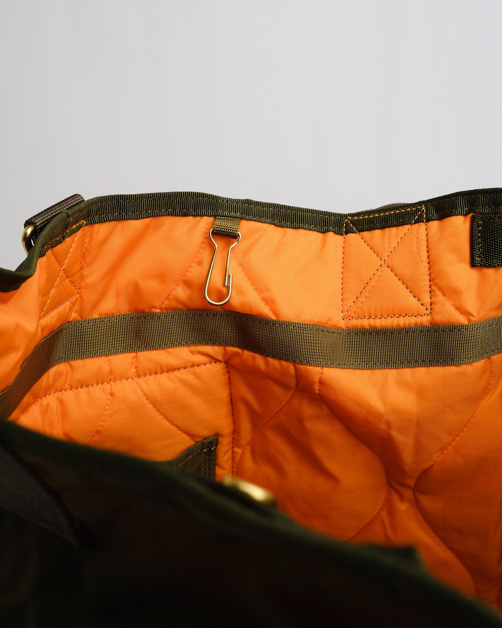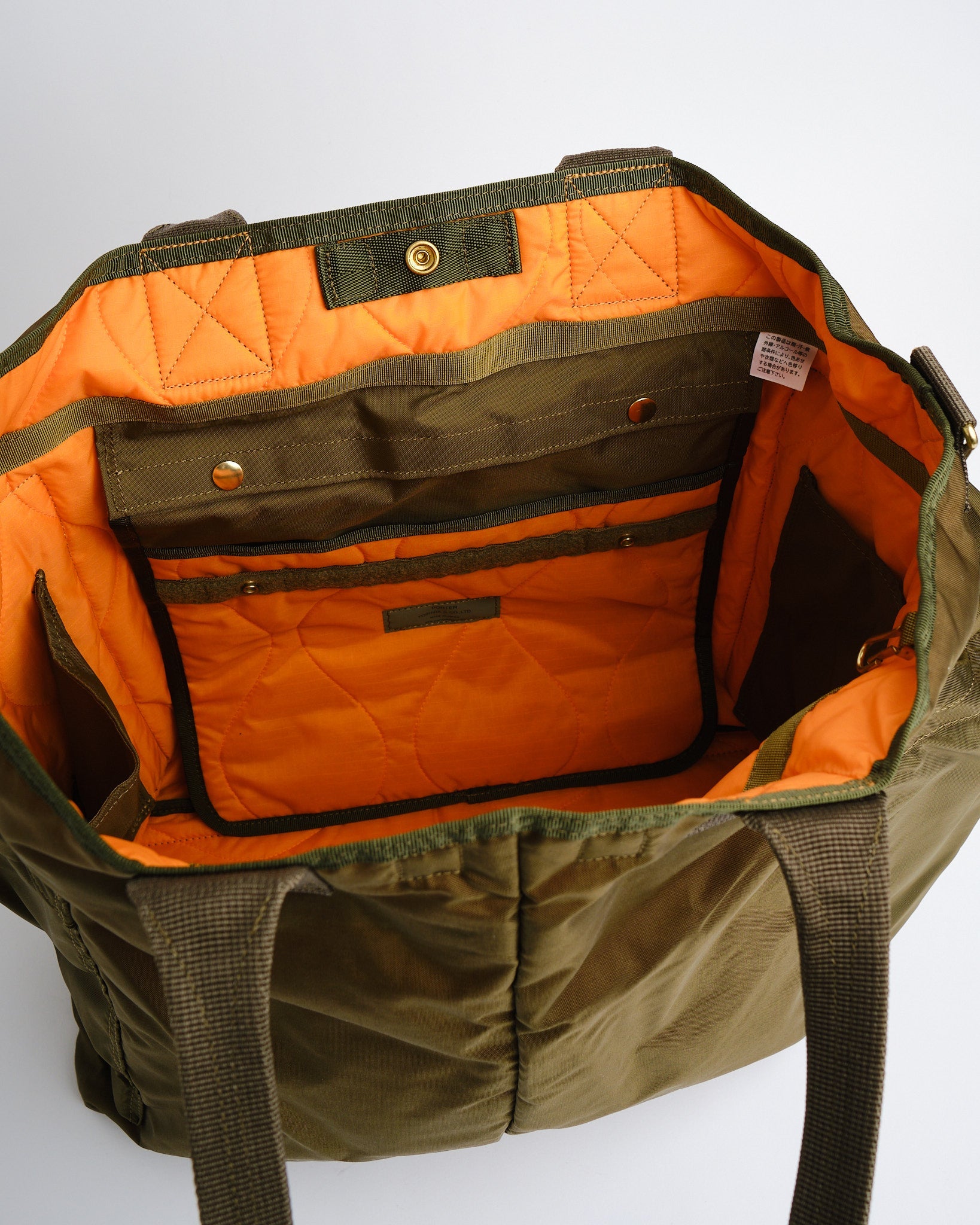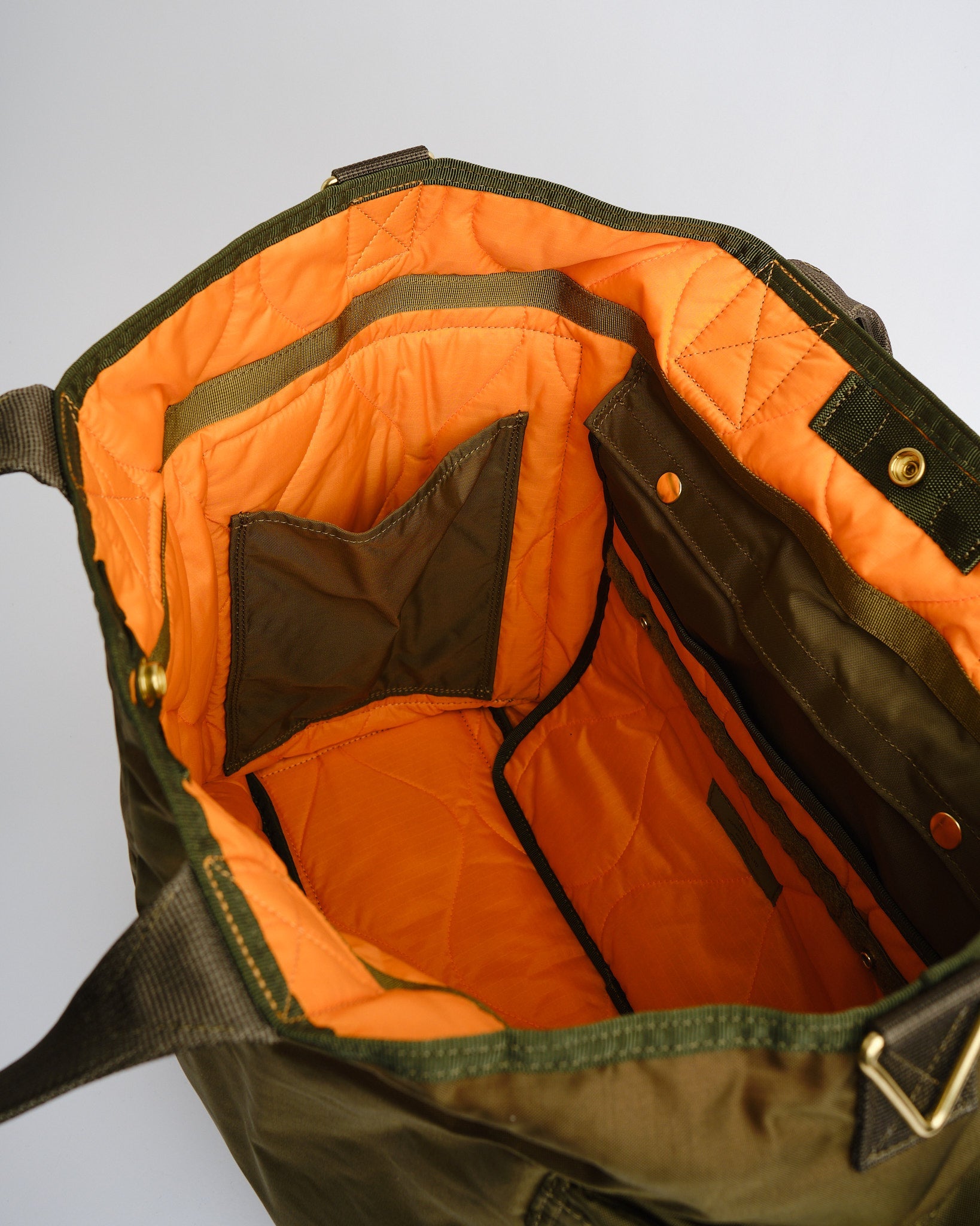 Den PORTER BY YOSHIDA Force 2-Way Tote Bag er en del af PORTER FORCE serien, inspireret af militær æstetik og de tilfældige farveforskelle, der findes i militærgoder. Et fremtrædende træk er den subtile farvevariation mellem stoffet på frontlommen og taskens hovedkrop, hvilket skaber indtrykket af at bruge forskellige stofpartier. Denne serie fejrer de uregelmæssige farveskemaer, der naturligt opstår i militært tøj og tilbehør.