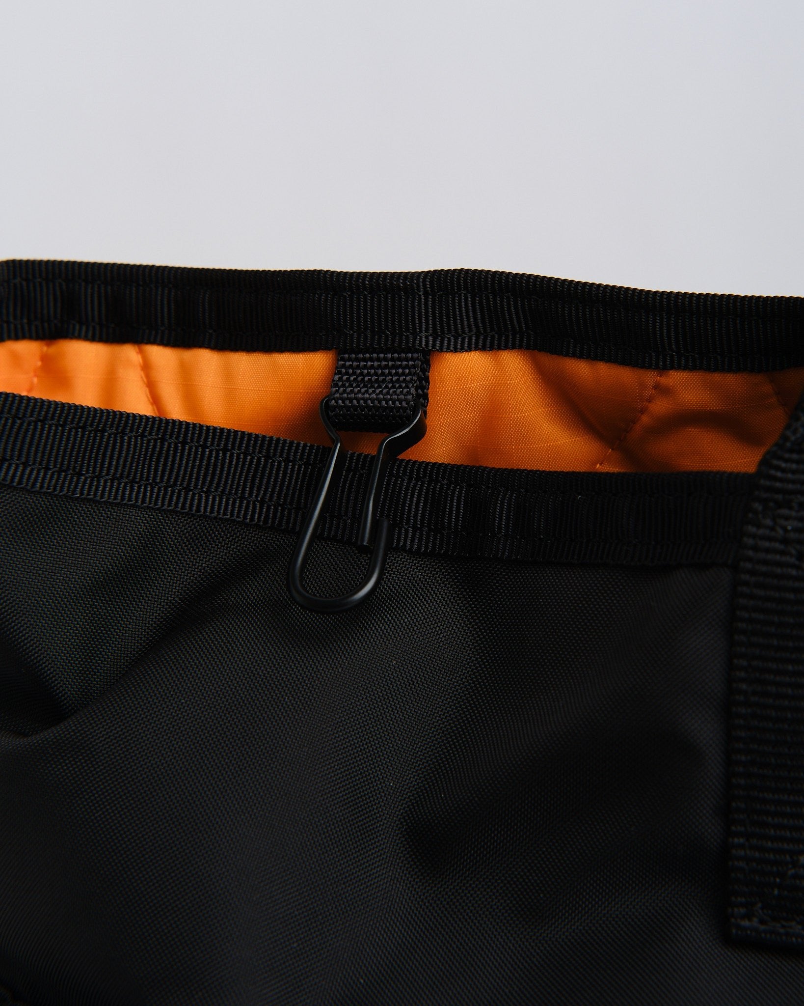 Lavet af industrielt stof vævet med 210 denier 6 nylon stærk tråd, som oprindeligt blev brugt til gummibåde, tilbyder denne taske ekstraordinær holdbarhed. Interiøret er foret med nødfarve orange, inspireret af militærjakker, og har quiltet ripstop nylon for øget styrke.