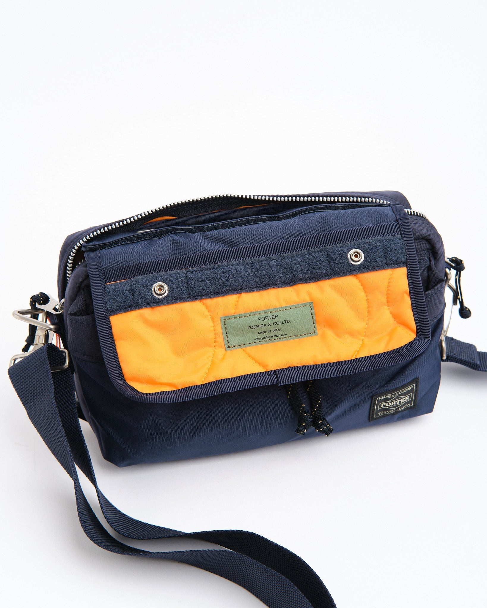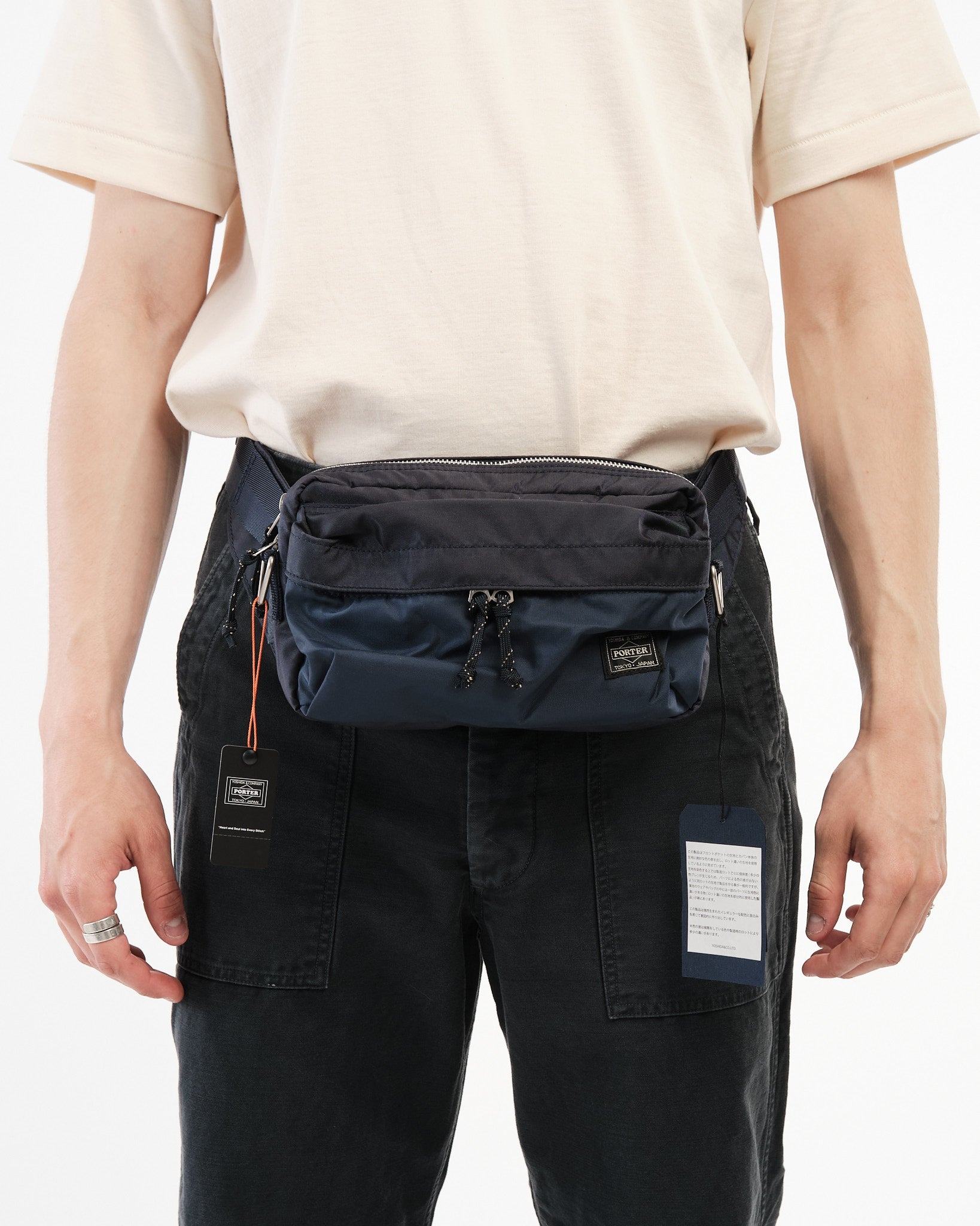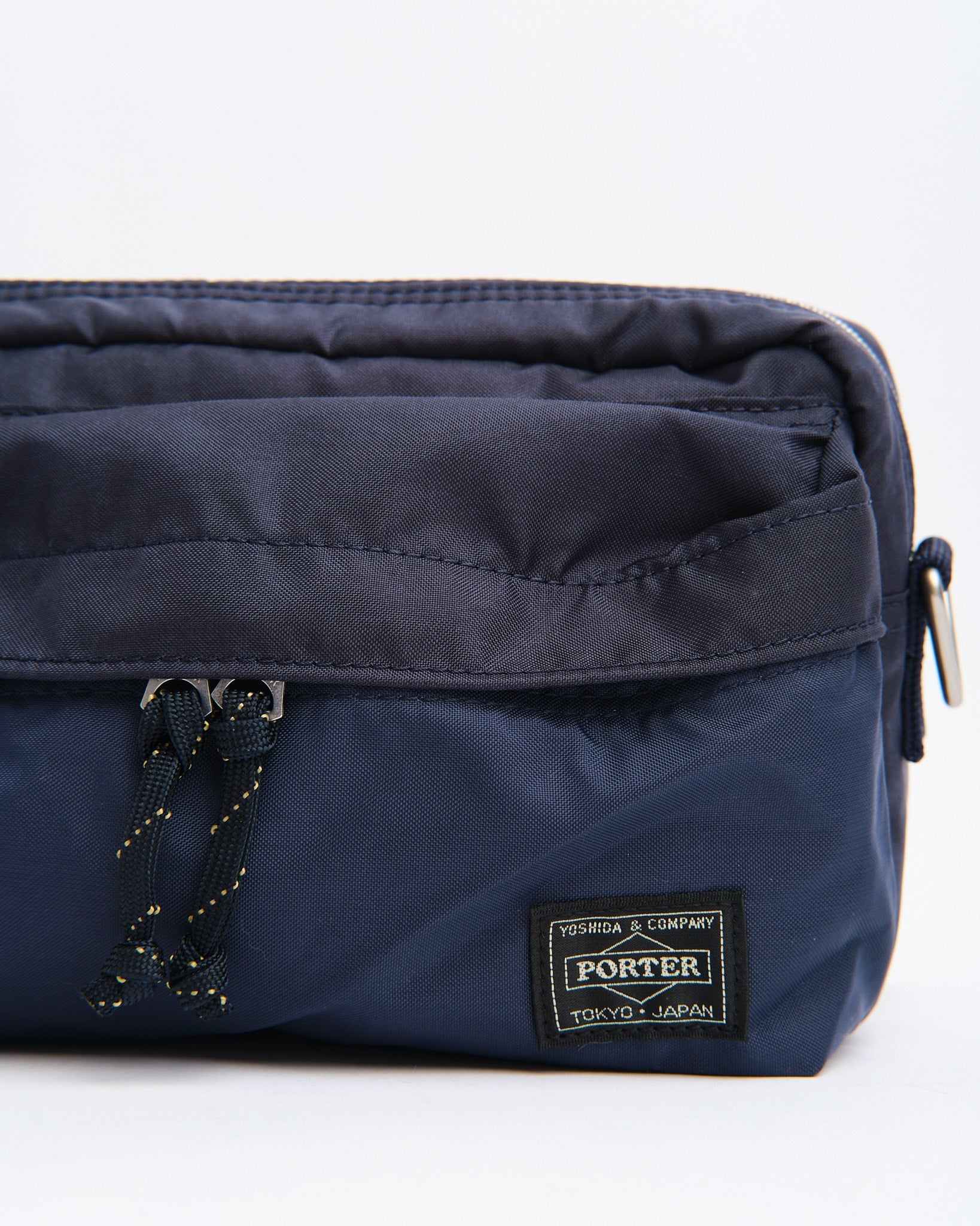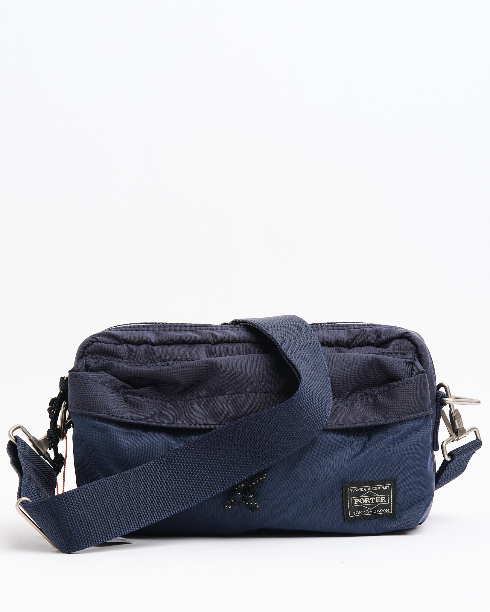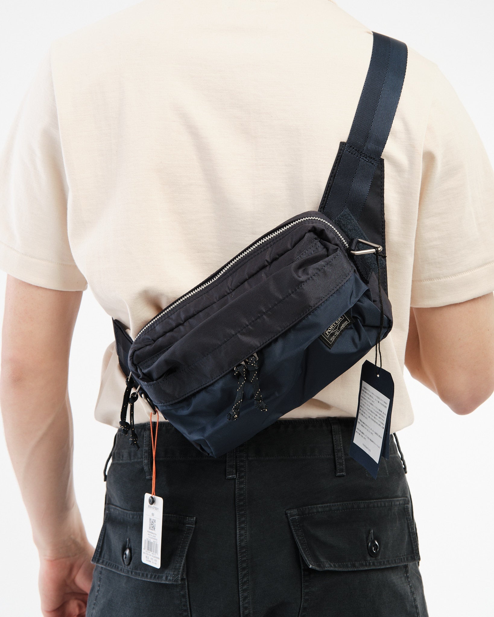 Den PORTER BY YOSHIDA Force 2-Way Waist Bag er en del af PORTER FORCE-serien, inspireret af militær æstetik og de tilfældige farveforskelle, der findes i militært udstyr. Et kendetegn ved dette design er den subtile farvevariation mellem stoffet på frontlommen og hovedkroppen af tasken, hvilket får det til at virke som om, forskellige stofpartier er brugt. Denne serie omfavner de uregelmæssige farveskemaer, der naturligt opstår i militært tøj og tilbehør.