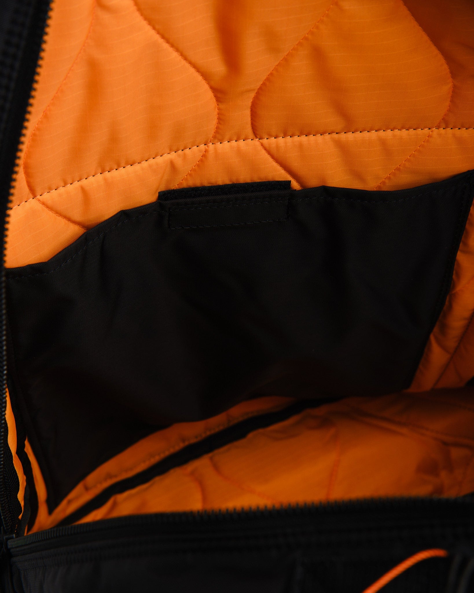 Det ydre materiale af Force Daypack er lavet af et højholdbart industrielt stof, vævet med 210 denier 6 nylon stærk tråd, oprindeligt anvendt i gummibåde og designet til at være modstandsdygtig over for farvning. Dette robuste materiale sikrer, at tasken er både hård og alsidig. For øget autenticitet har taskens indre nødfarven orange, inspireret af foringen i militærjakker, og quiltet ripstop nylon for holdbarhed.