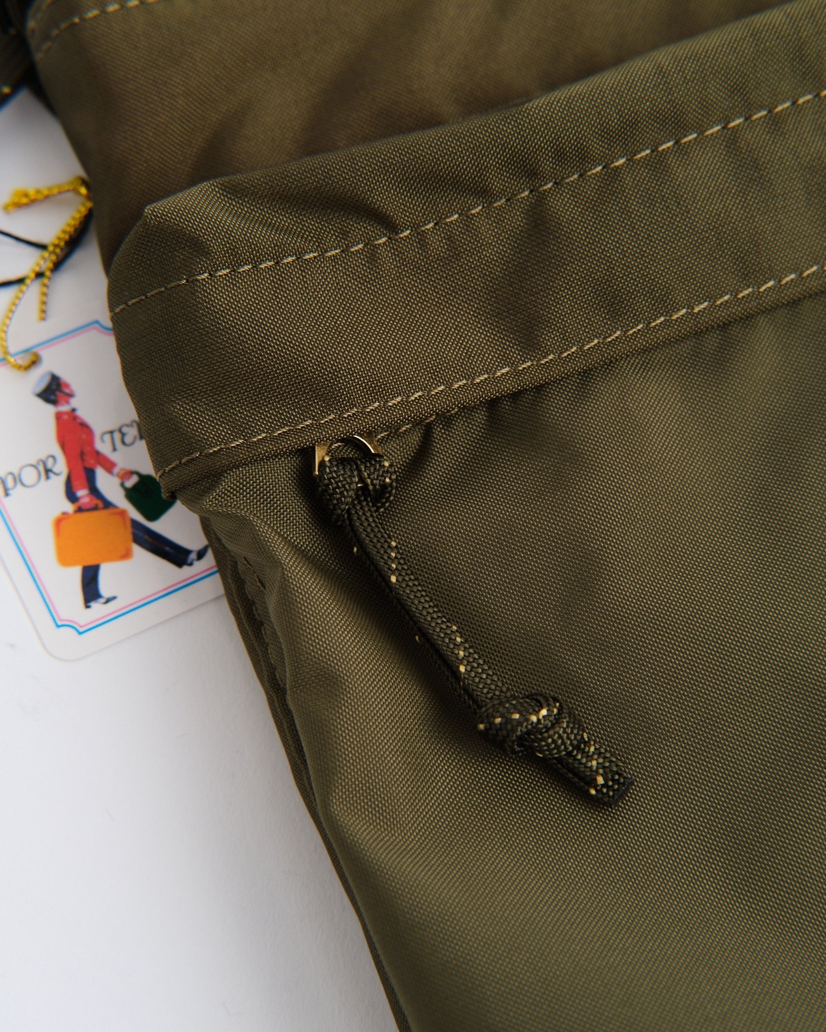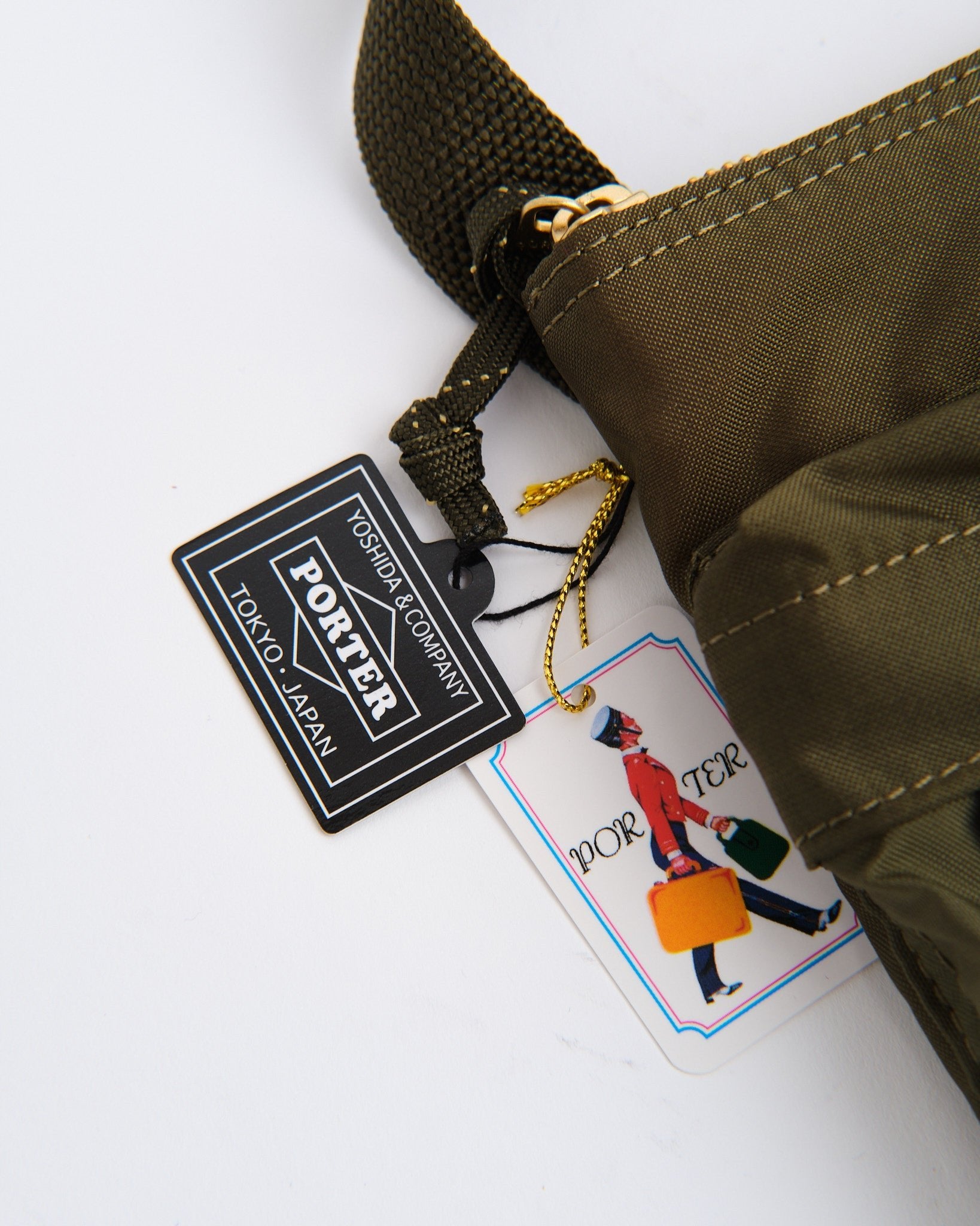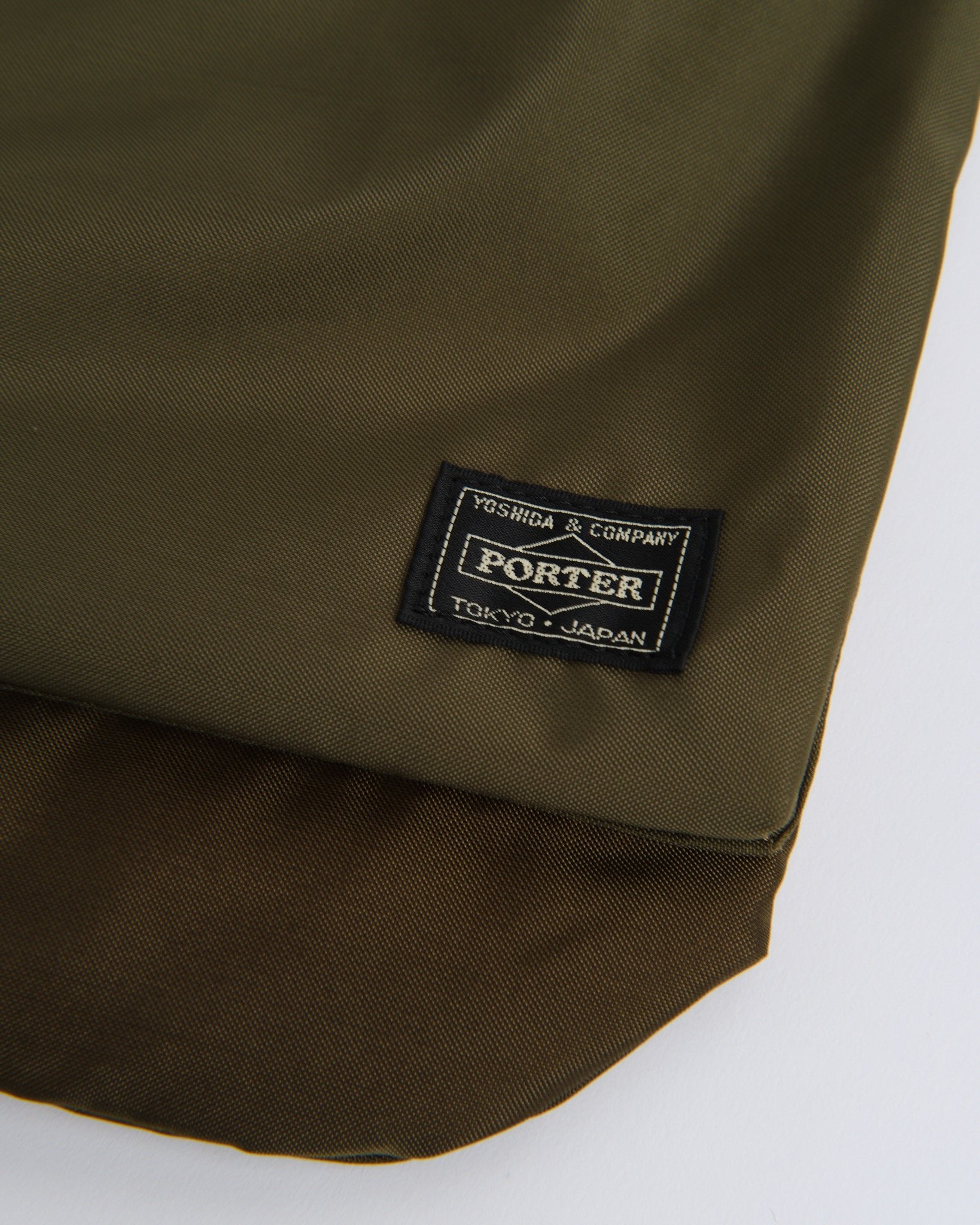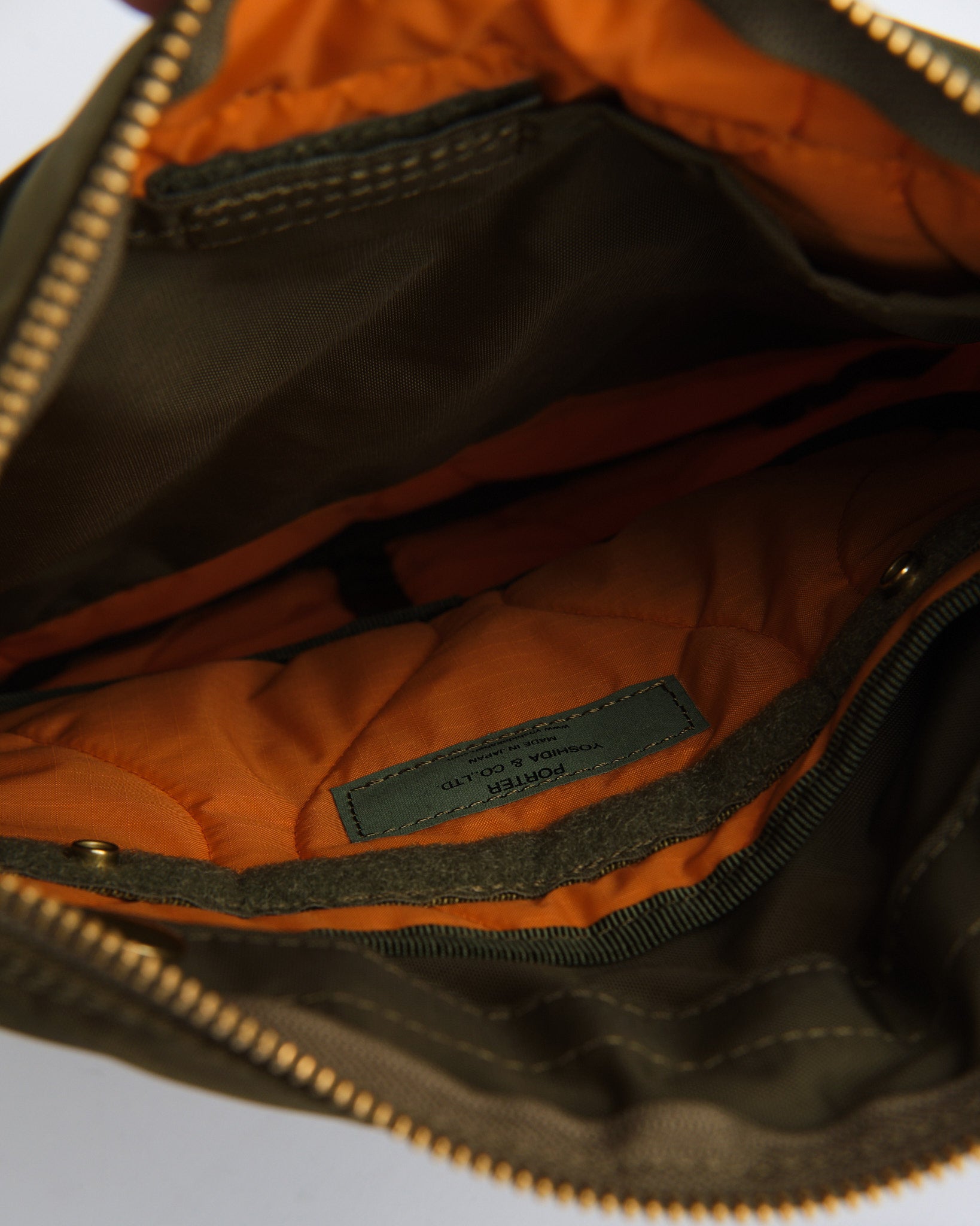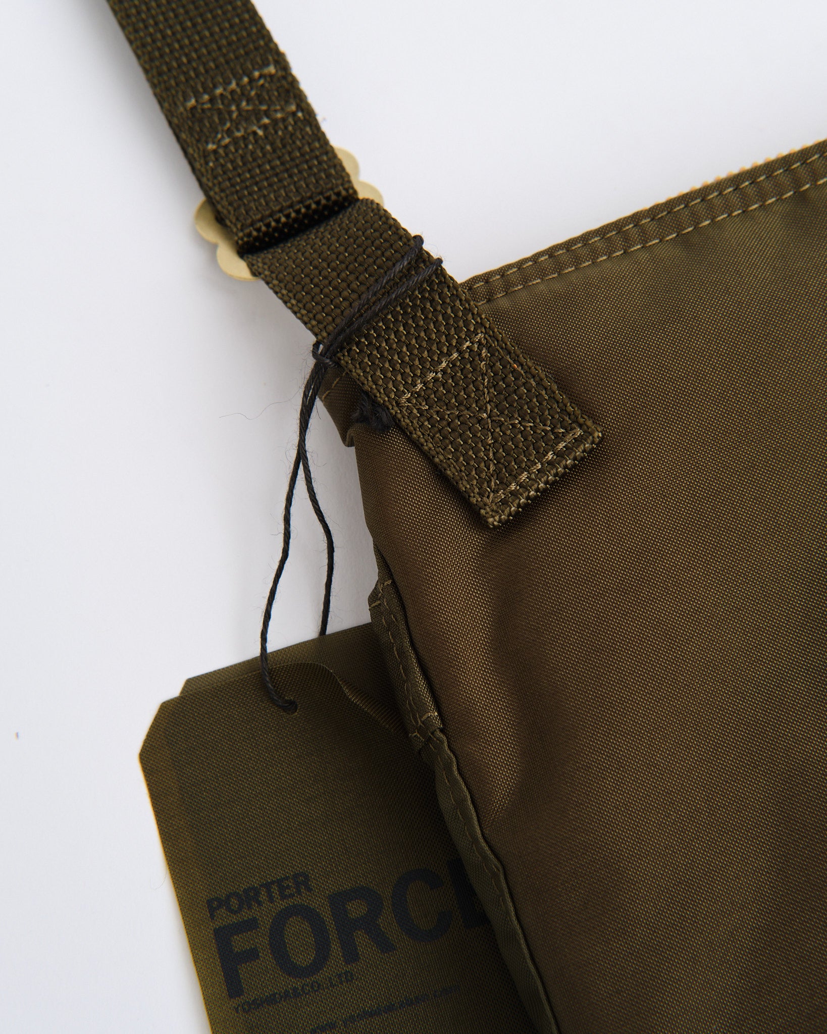 Præsentation af Olive Drab Skuldertaske fra PORTER af Yoshida's "FORCE Series." Med sit militærinspirerede design og unikke tilfældige farveforskelle er denne taske den perfekte kombination af stil og funktion.