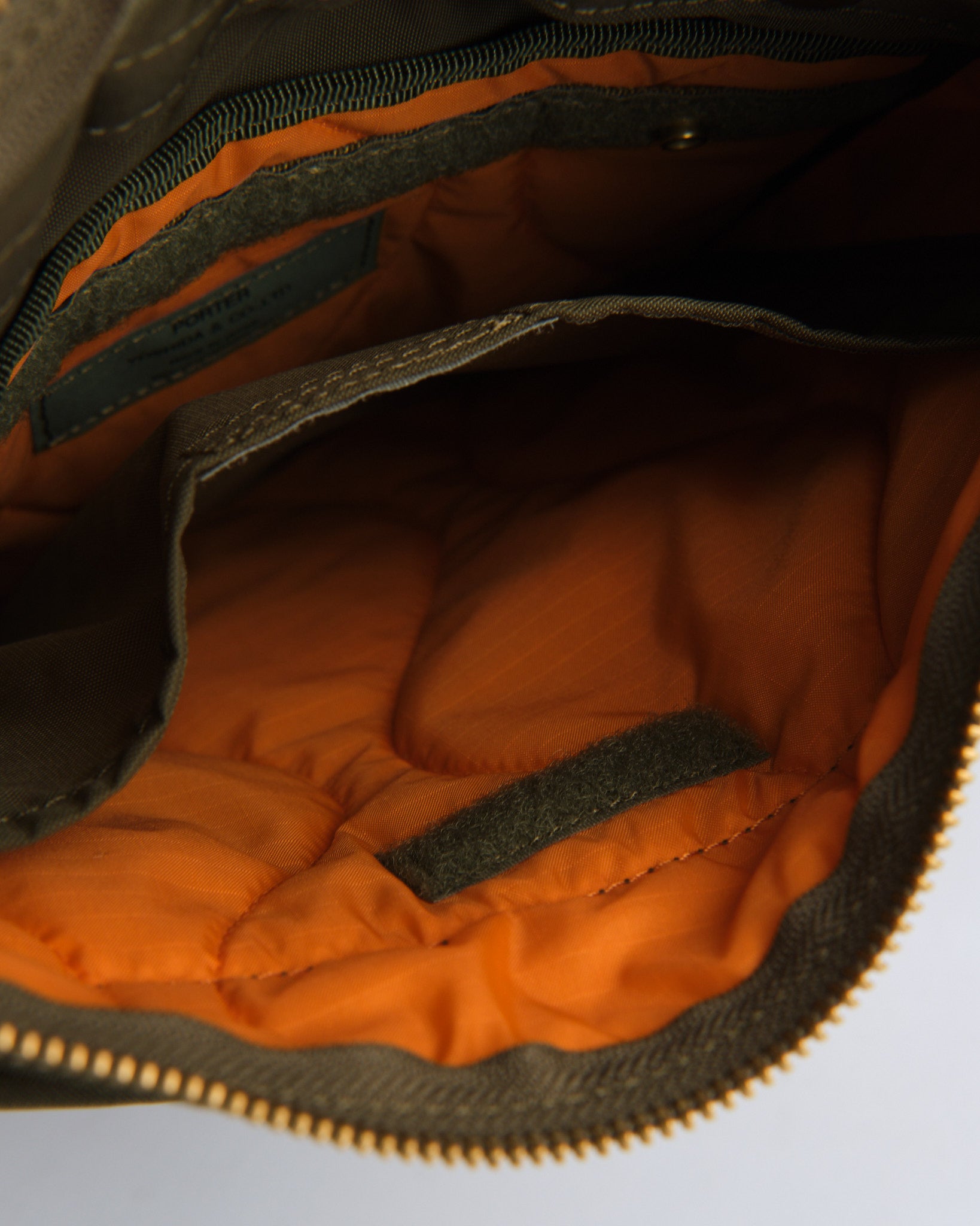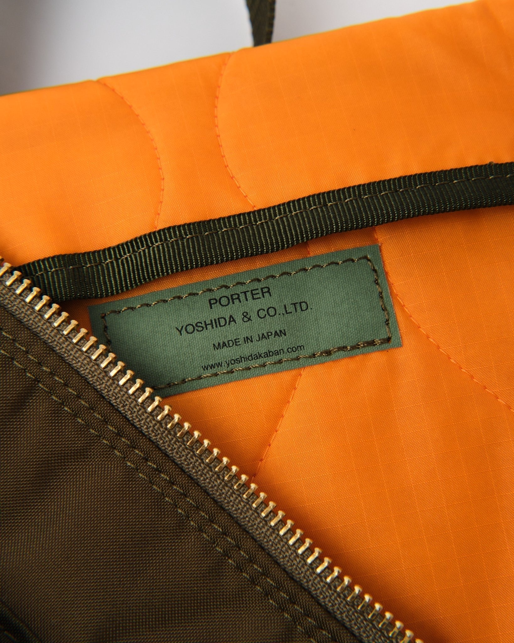 Tasken har quiltet ripstop nylon i orange (nødfarve), hvilket tilføjer et pop af farve og et ekstra lag af holdbarhed. Med enestående japansk håndværk og opmærksomhed på detaljen i hver syning, er denne taske sikker på at imponere.