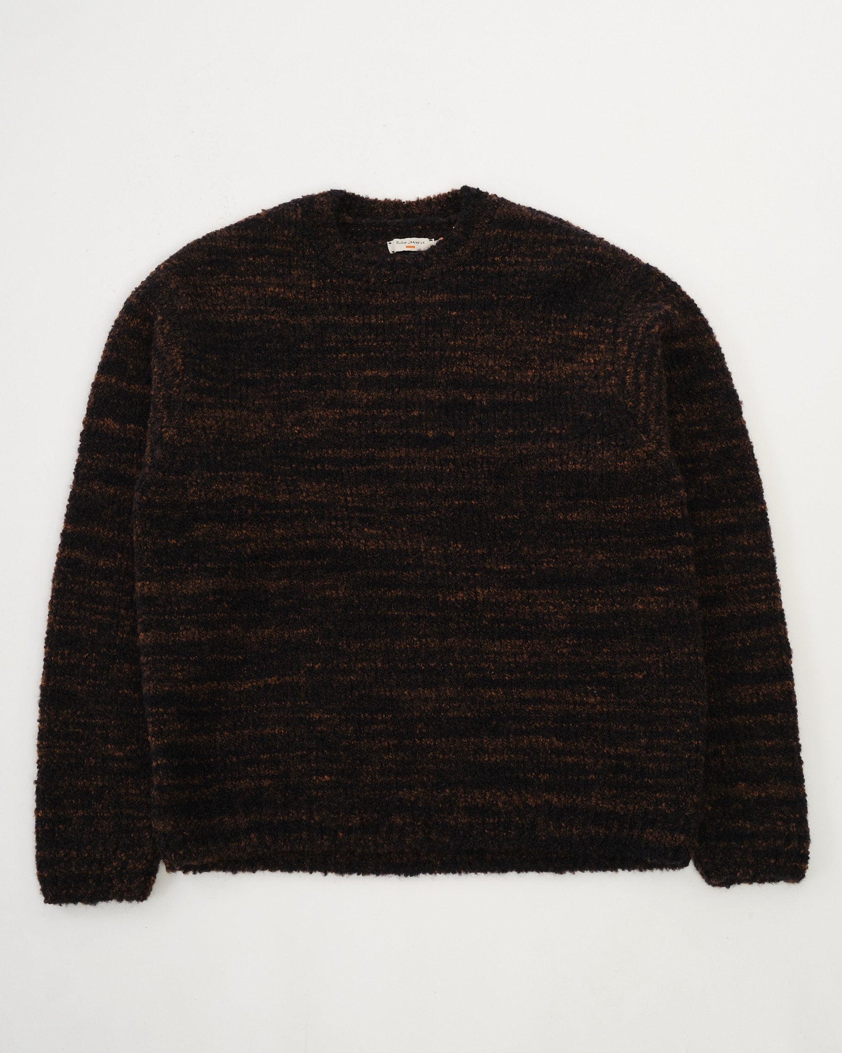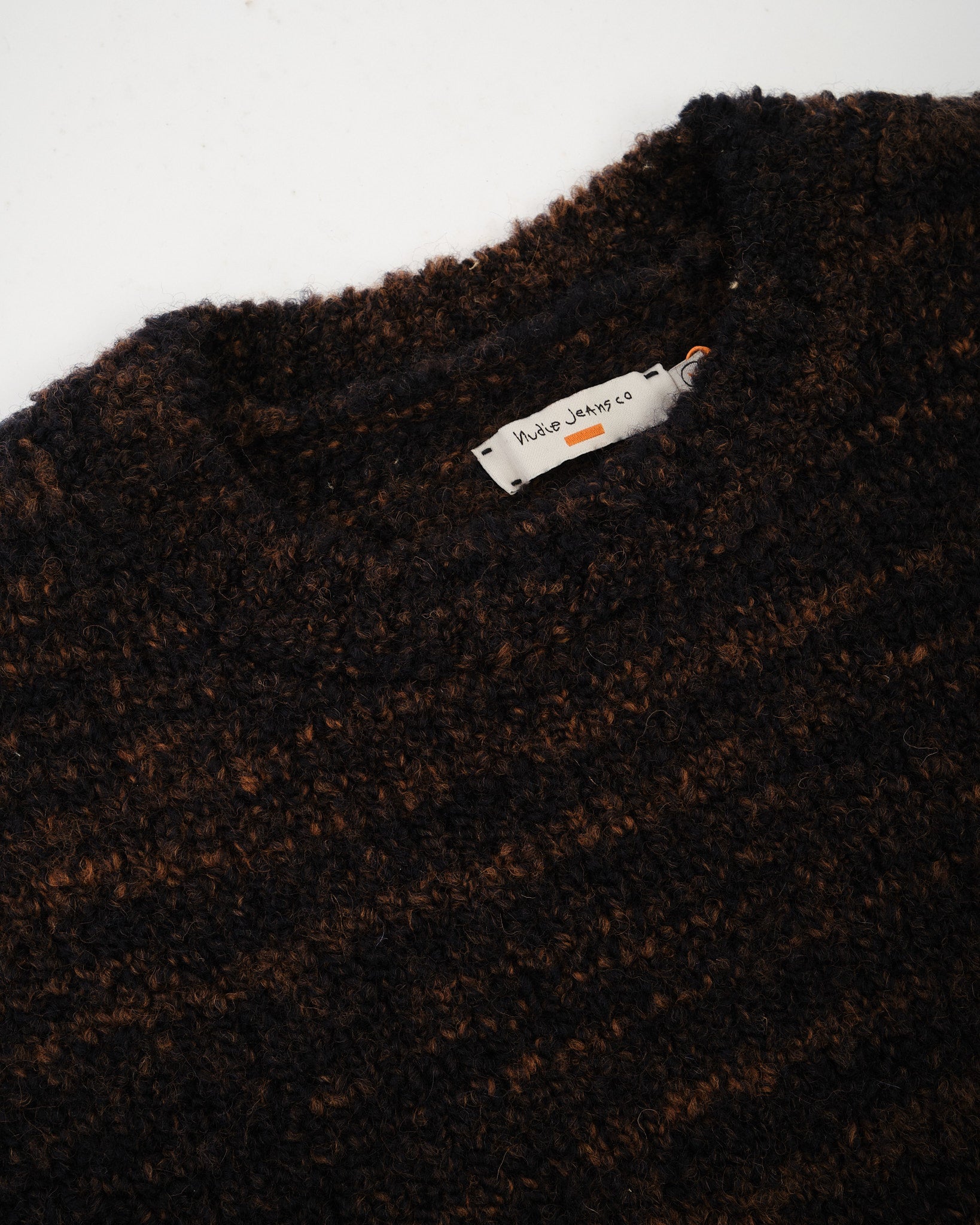 The NUDIE JEANS CO. GURRA BOUCLE SWEATER NAVY/ORANGE er en letvægts crew neck sweater med en unikt tekstureret, uldent strik. Fremstillet ved brug af uregelmæssigt, slubgarn, den blander dyb marineblå med rustorange, hvilket skaber en rigt speckled bouclé effekt, der tilføjer dybde og karakter til stoffet.