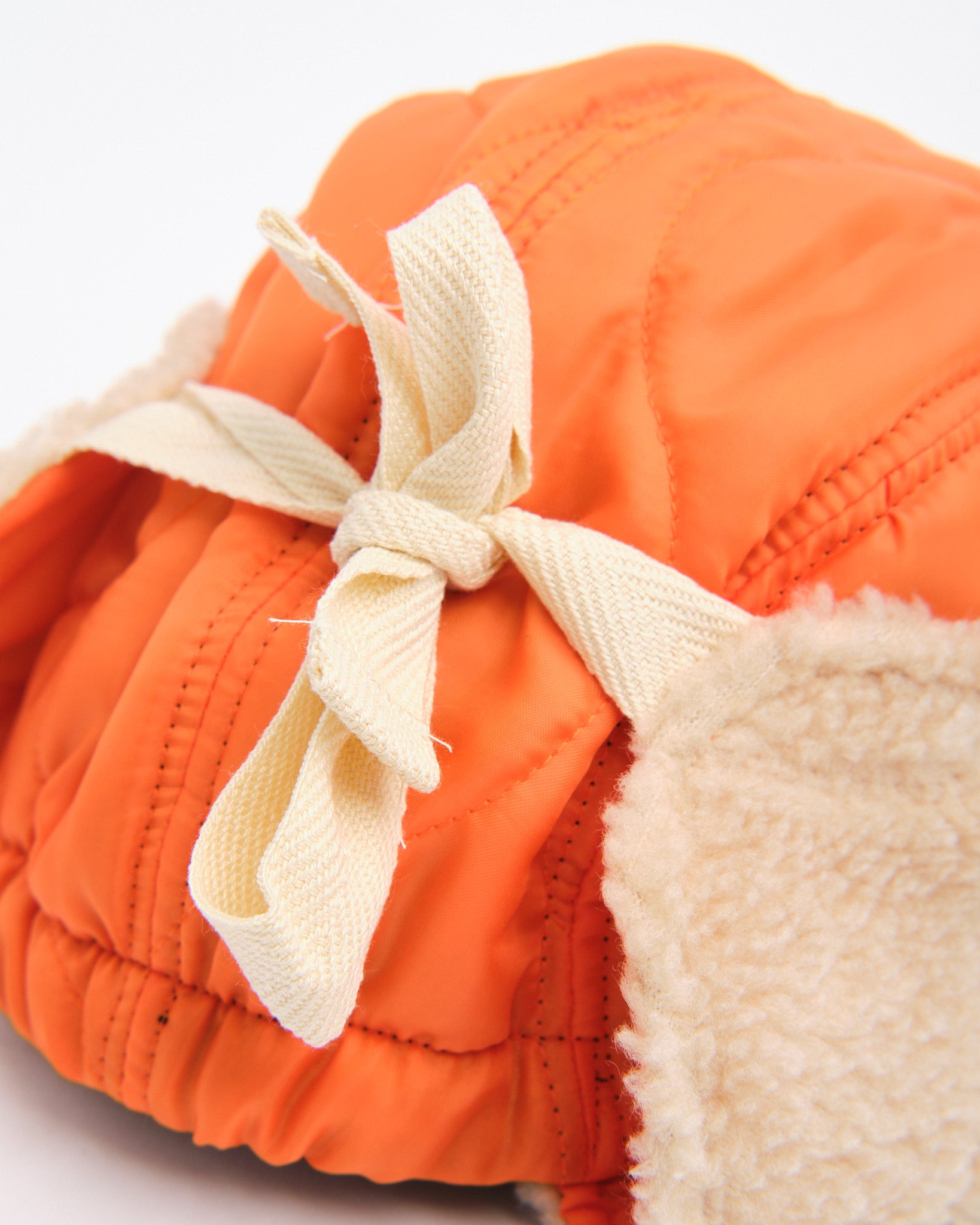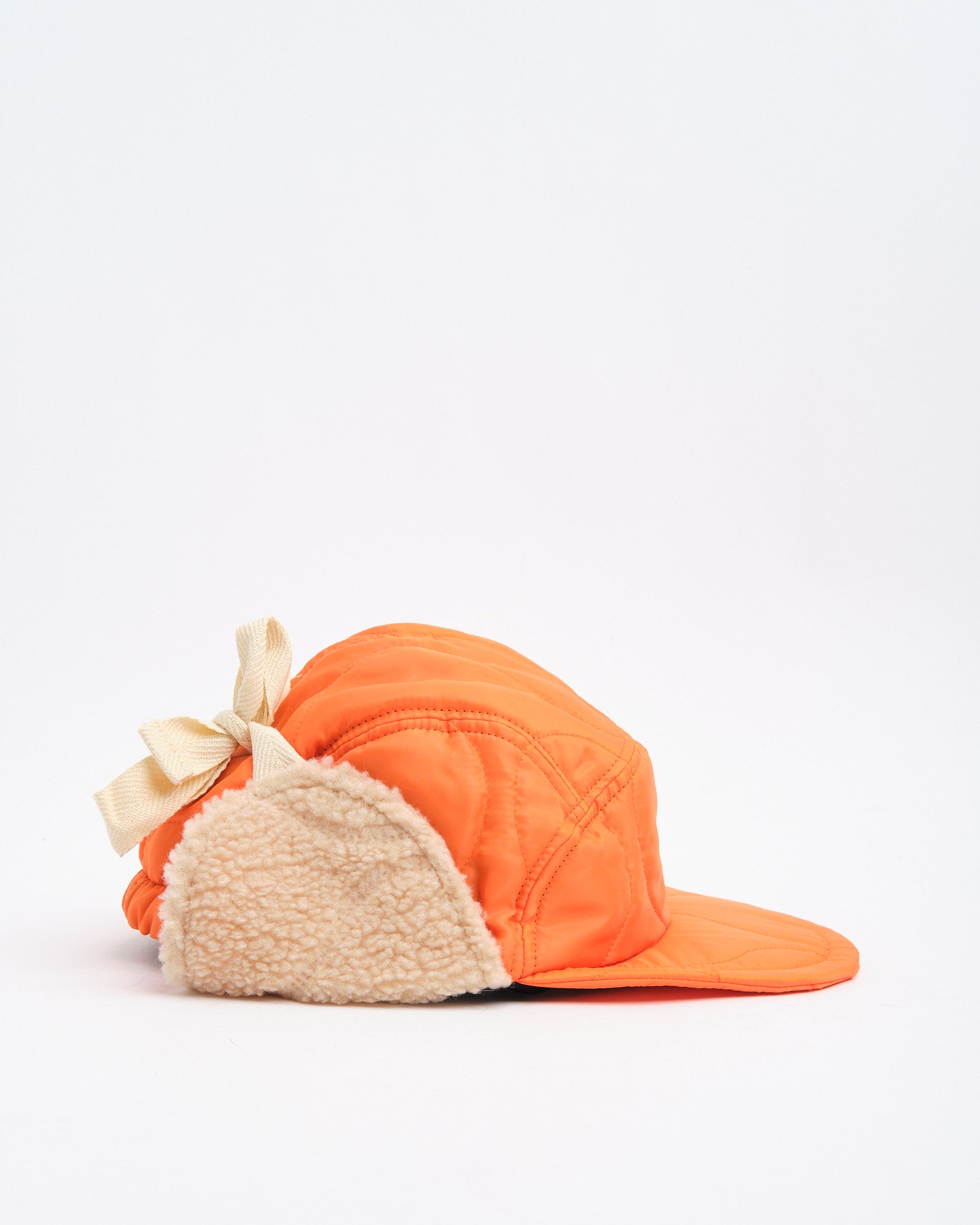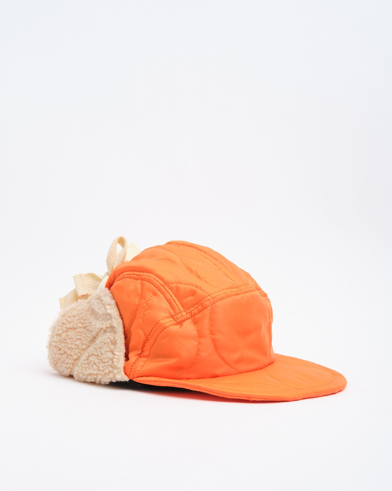Halfmoon Cap med ører i orange fra Found Feather forener militær funktionalitet med dristig styling. Fremstillet i Japan af quiltet nylon med en let polyesterfyld, den har plys boa fleece ørepaneler og en blød EVA skumskygge for varme og komfort uden vægt. Det fire-panelers design giver struktur, mens fuld ryg-elastik og bomulds flade snørrebånd giver den en sikker, tilpasbar pasform. Afsluttet med håndstemplet detalje, bomuld twill foring og et QR-kodet plejeetiket, er denne kasket lige dele nyttegods og udtryksfuld.