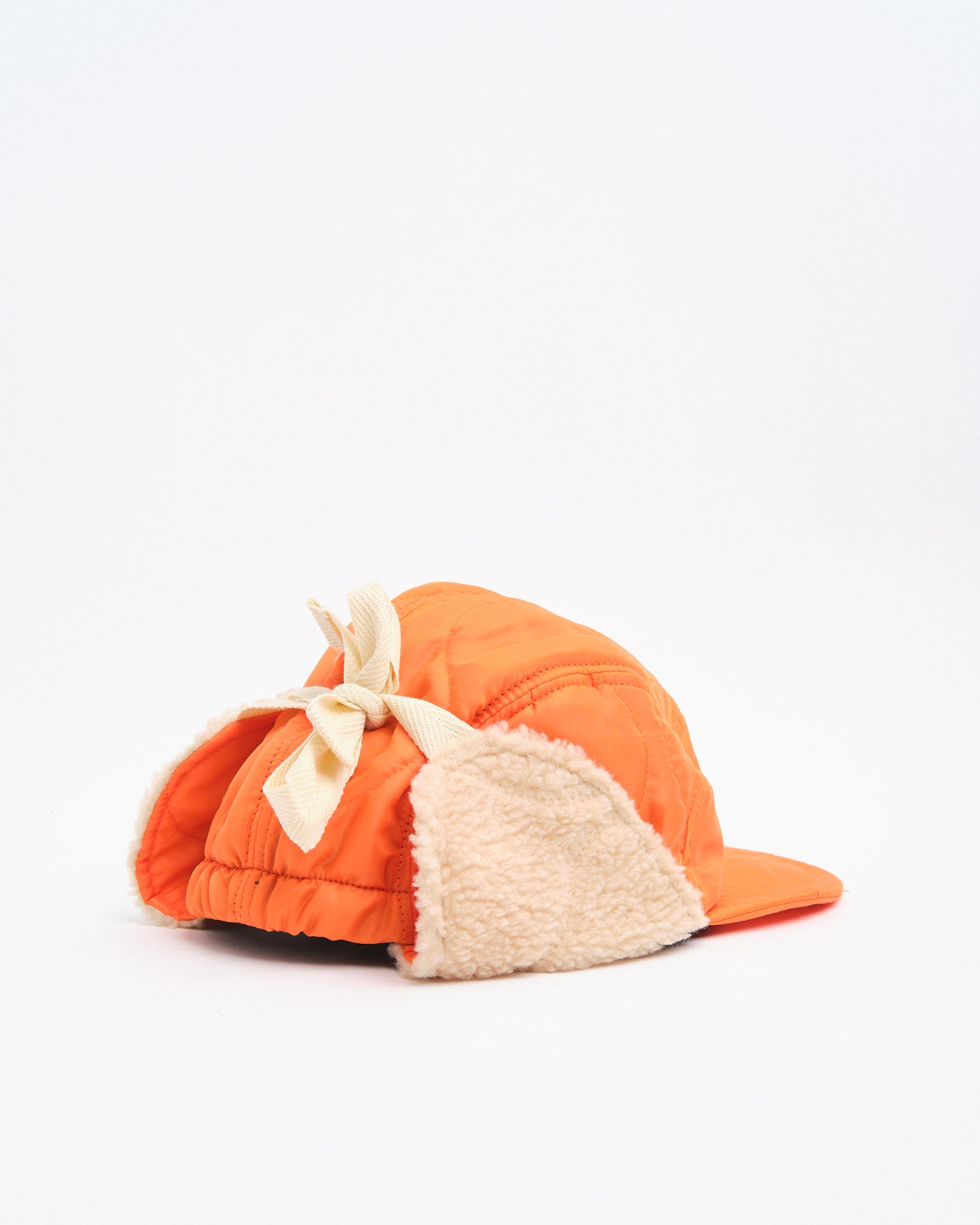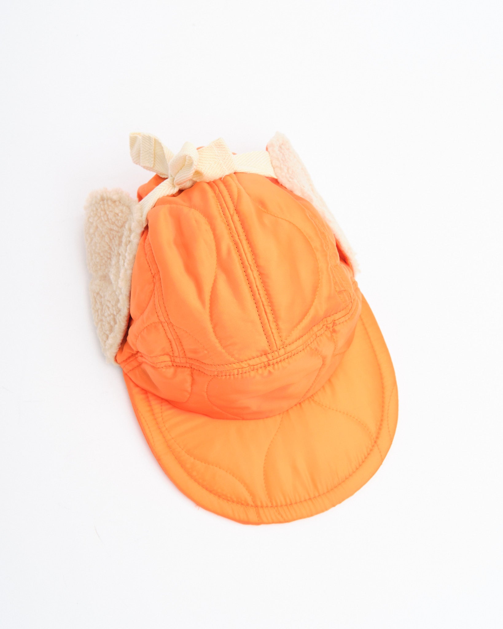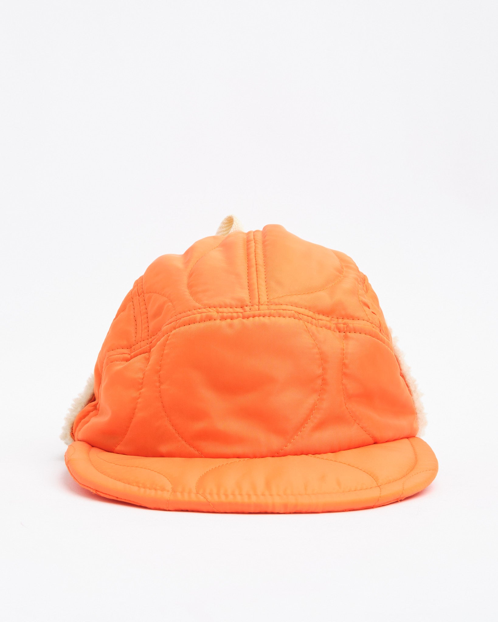 Halfmoon Cap med ører i orange fra Found Feather forener militær funktionalitet med dristig styling. Fremstillet i Japan af quiltet nylon med en let polyesterfyld, den har plys boa fleece ørepaneler og en blød EVA skumskygge for varme og komfort uden vægt. Det fire-panelers design giver struktur, mens fuld ryg-elastik og bomulds flade snørrebånd giver den en sikker, tilpasbar pasform. Afsluttet med håndstemplet detalje, bomuld twill foring og et QR-kodet plejeetiket, er denne kasket lige dele nyttegods og udtryksfuld.