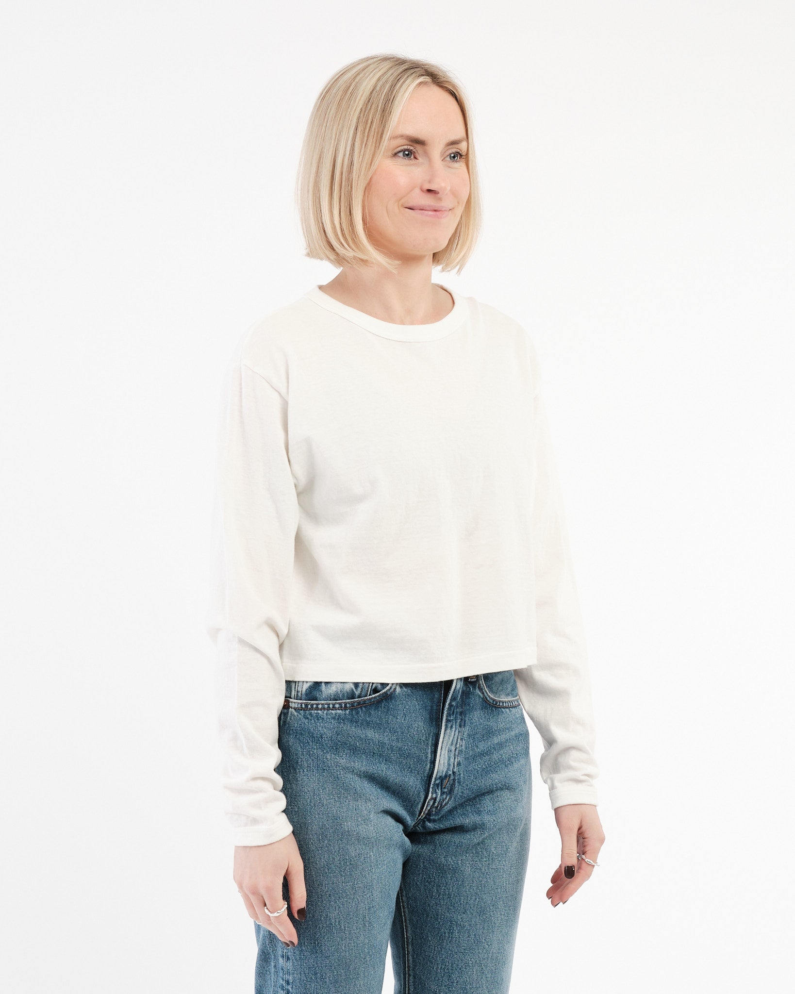 Hi'aka LS T-Shirt Off White fra Sunray Spirit. Sunray T-shirts har et traditionelt fit inspireret af følelsen fra 50'erne. Afslappet, cropped længde med et regulært fit. Kraven, rib-designet og stofferne er også traditionelle. 260 g. Lavet i Japan. Hi'aka LS er en langærmet version af den klassiske T-shirt, ny for efterår/vinter 2022.