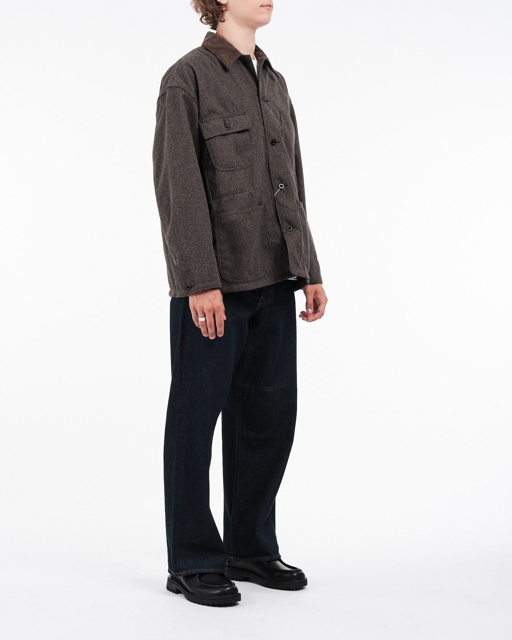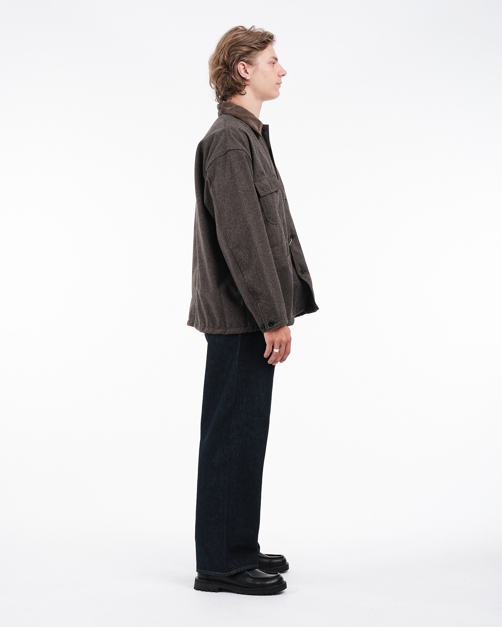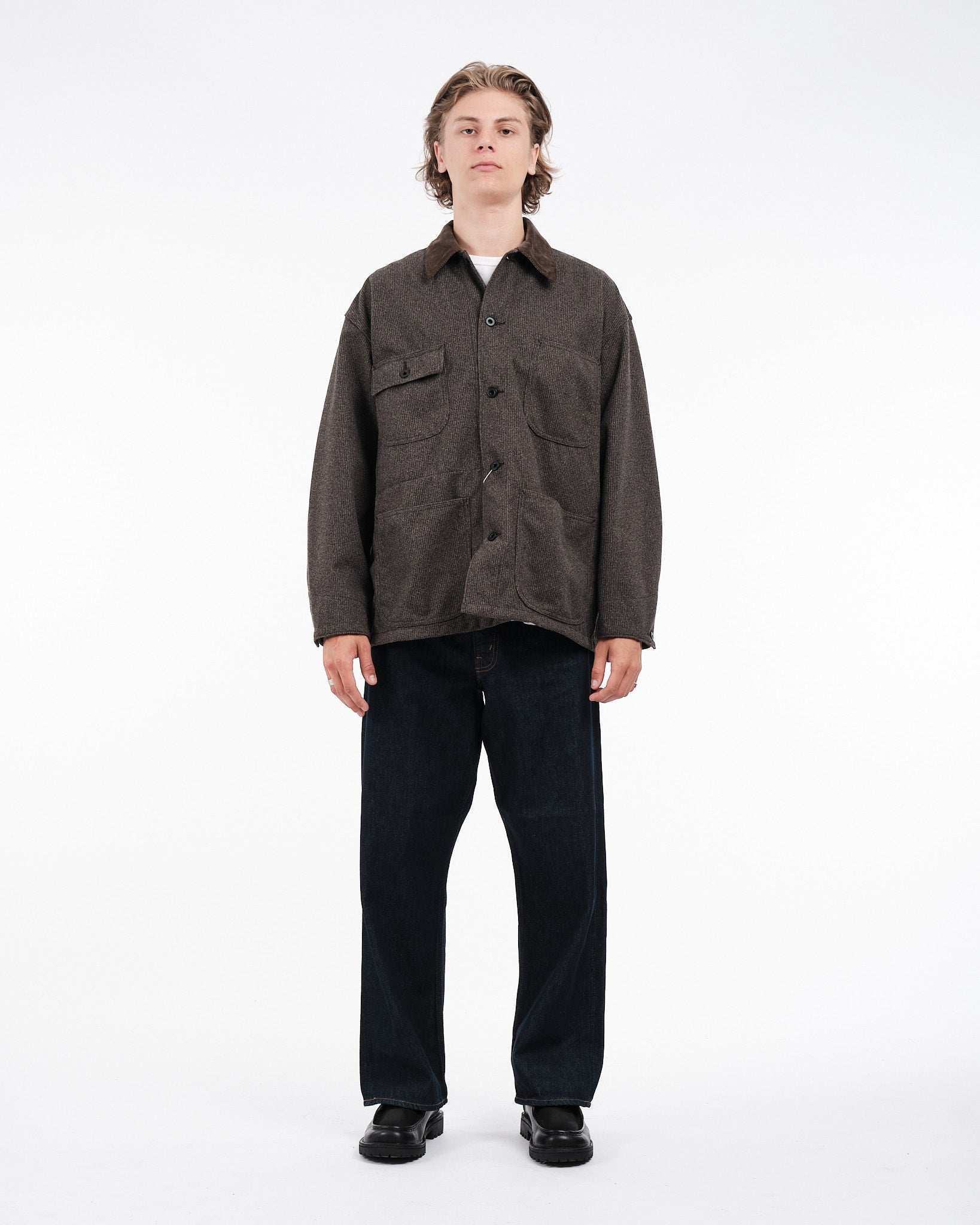 Tjek Orslow HOUNDSTOOTH RELAX FIT COVERALL ud i Brown Hounds Tooth. Denne kedeldragt kombinerer et hundetandsmønster med en fløjlskrave, og blander klassiske og moderne elementer. Fremstillet hovedsageligt af polyester, der ligner uld, tilbyder den både holdbarhed og let vedligeholdelse. Perfekt til dem, der elsker det tidløse look af arbejdstøj, men foretrækker komforten og bekvemmeligheden ved moderne materialer.