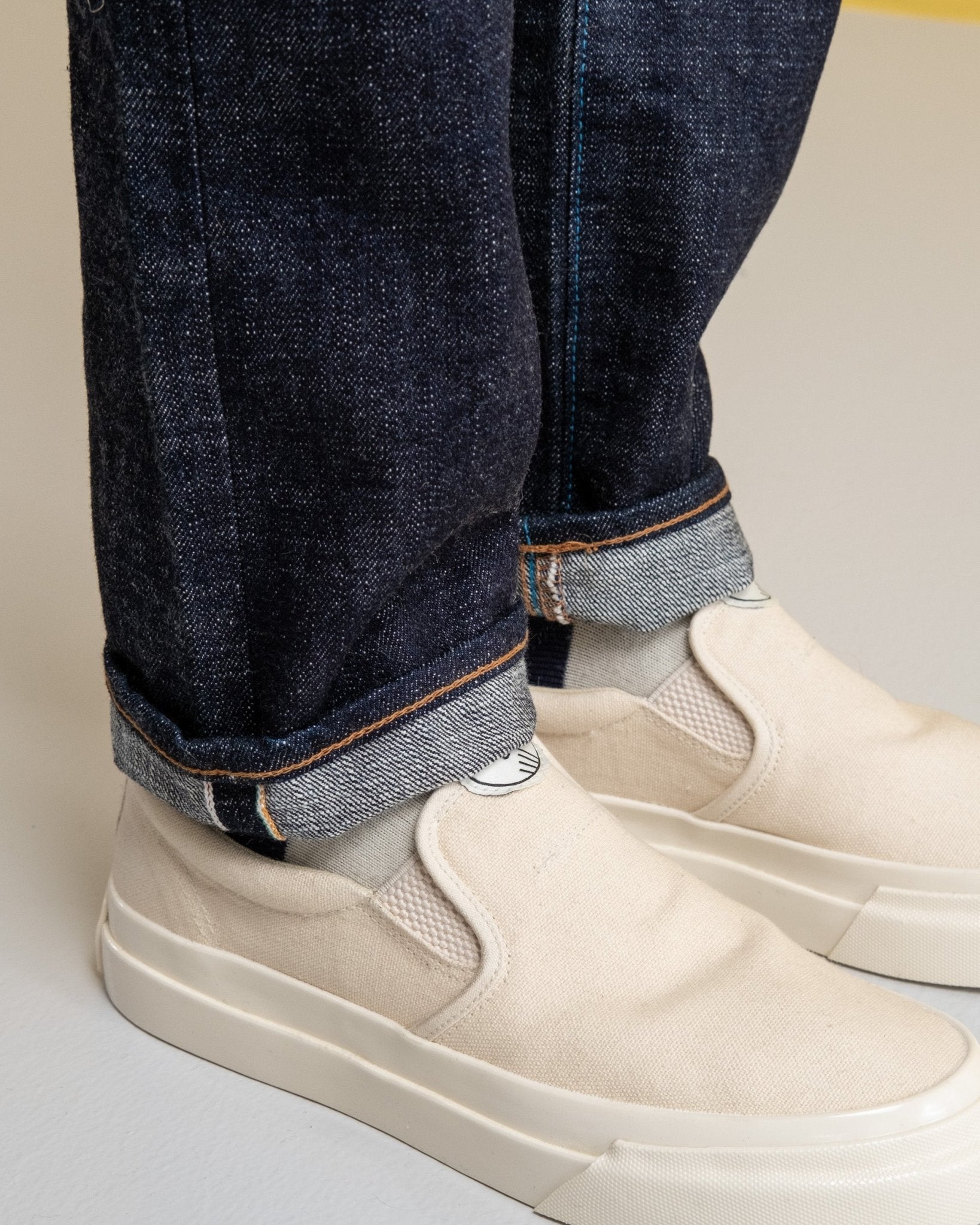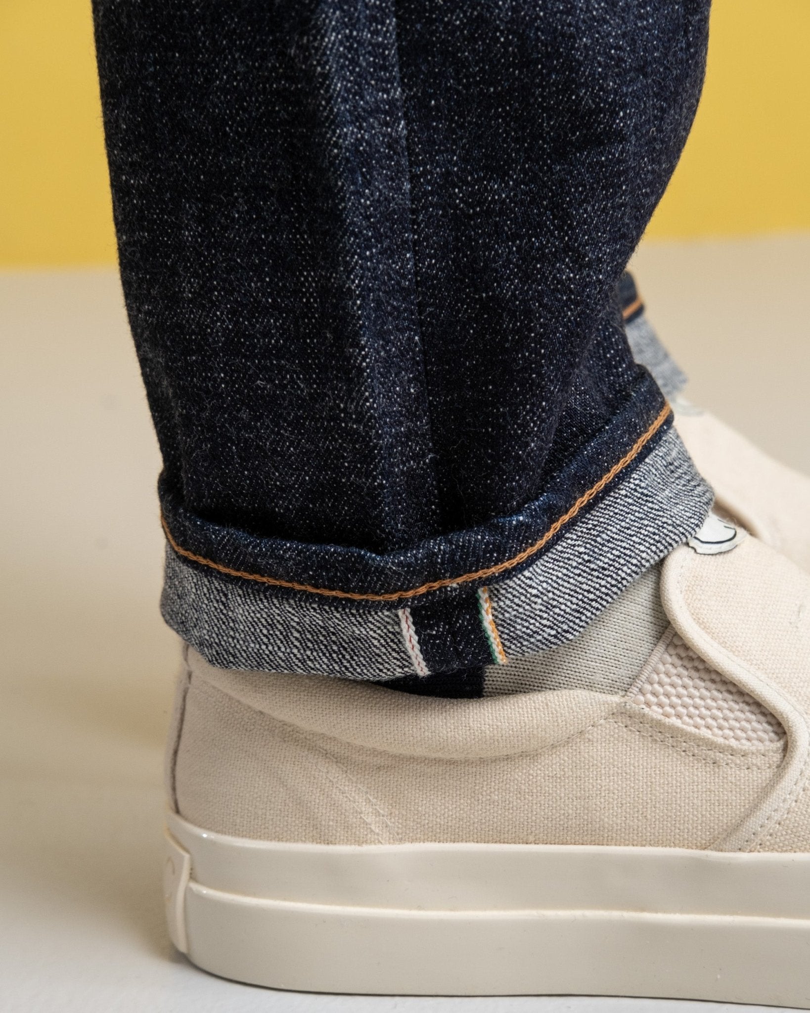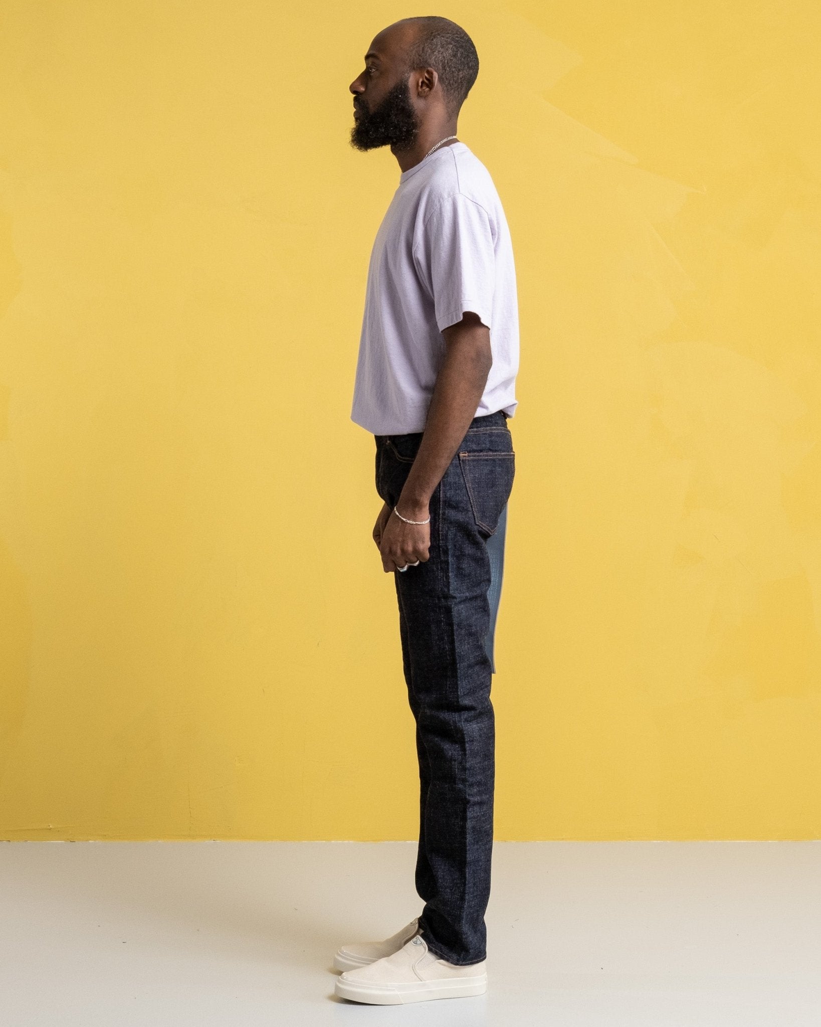 J366 Circle 16.5 Oz Straight Jeans fra Japan Blue Jeans. Den ligger et sted mellem slim og afslappet. Den har lidt plads omkring lårene og en fin tilspidsning fra knæet og ned. Det tunge-ounce vintage selvage denim er lavet af naturlig bomuld fra Cote d'Ivoire. Ved at sy det med et svagt tryk i en maskine, ender det færdige produkt som et håndlavet denim. Materialet er lidt råt i starten, men det vil gradvist blive glattere ved at have det på i et stykke tid.Lavet i Japan.