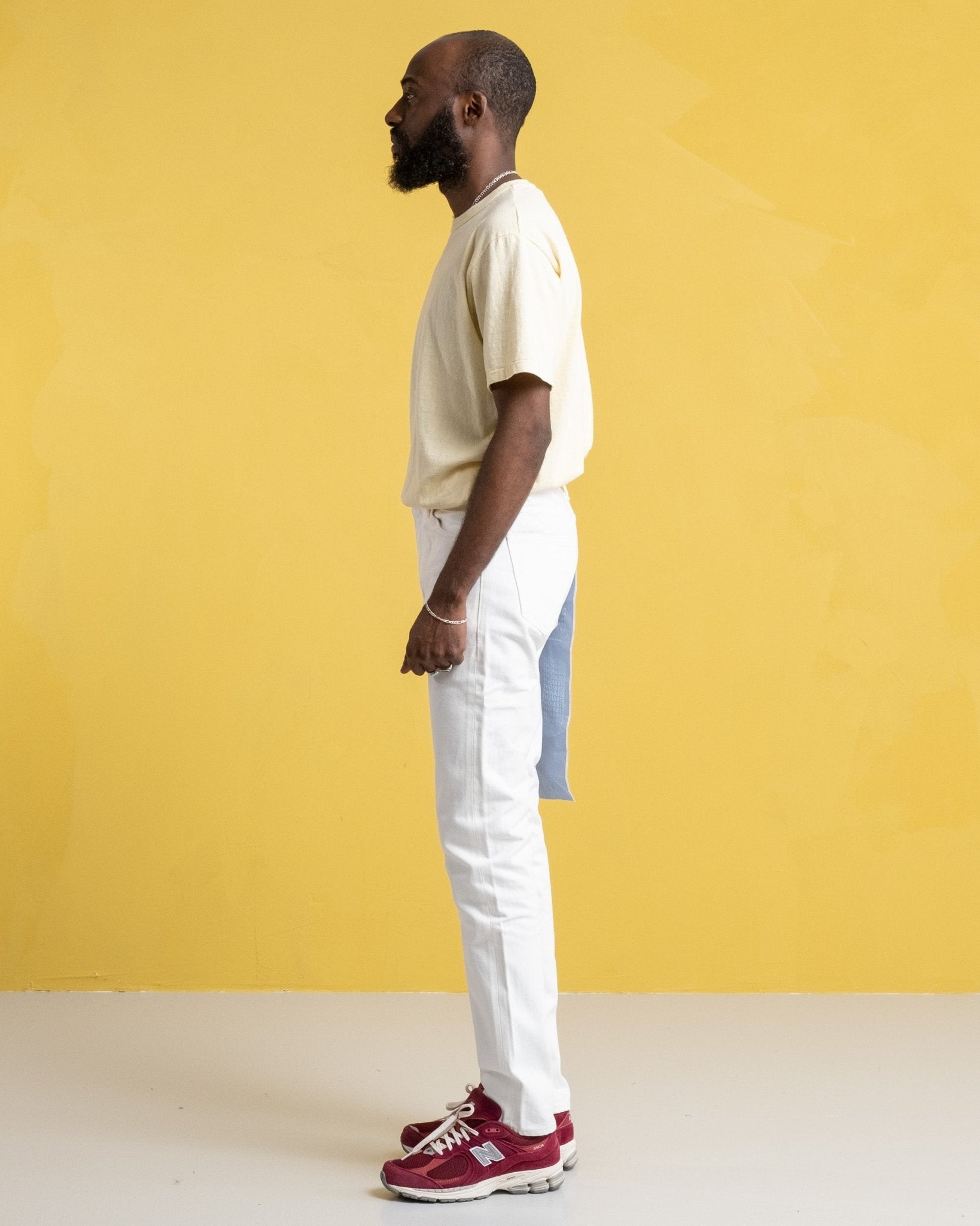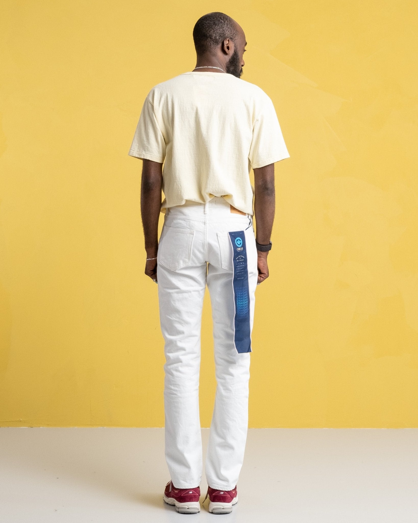 J370 Circle 14 Oz Straight White Jeans fra Japan Blue Jeans. Den ligger et sted mellem slim og afslappet. Den har lidt plads omkring lårene og en fin tilspidsning fra knæet og ned. Det tunge-ounce vintage selvage denim er lavet af naturlig bomuld fra Cote d'Ivoire. Ved at sy det med et svagt tryk i en maskine, ender det færdige produkt som et håndlavet denim. Materialet er glattere og super behageligt fra starten. Lavet i Japan.