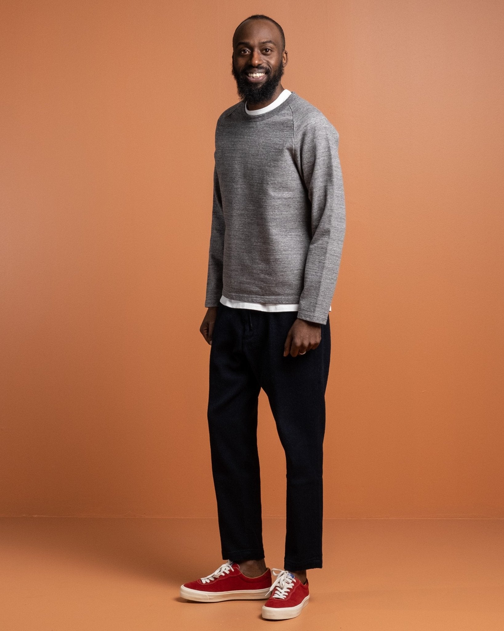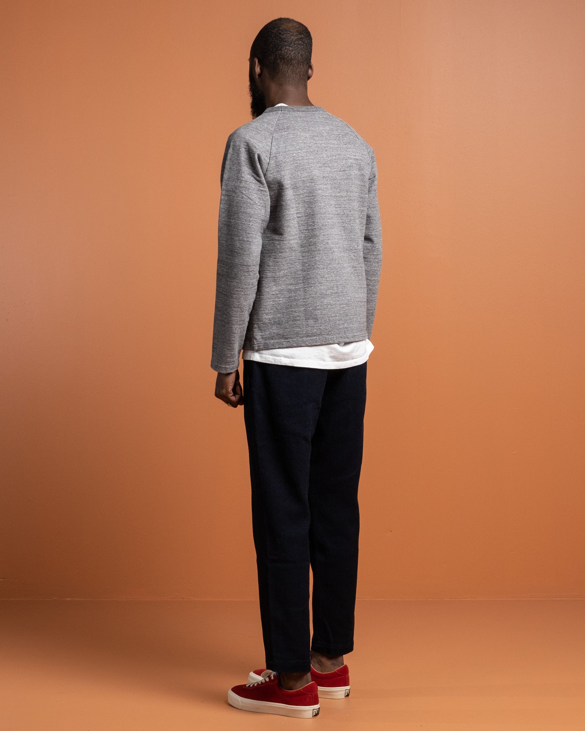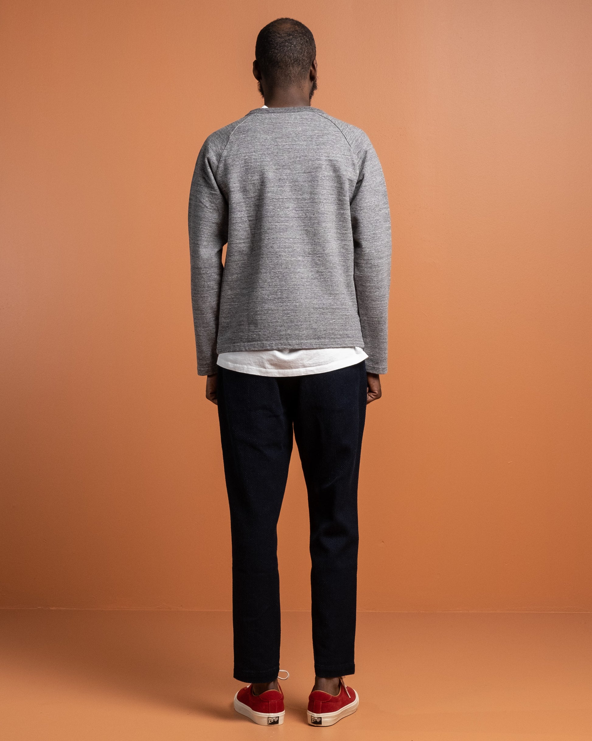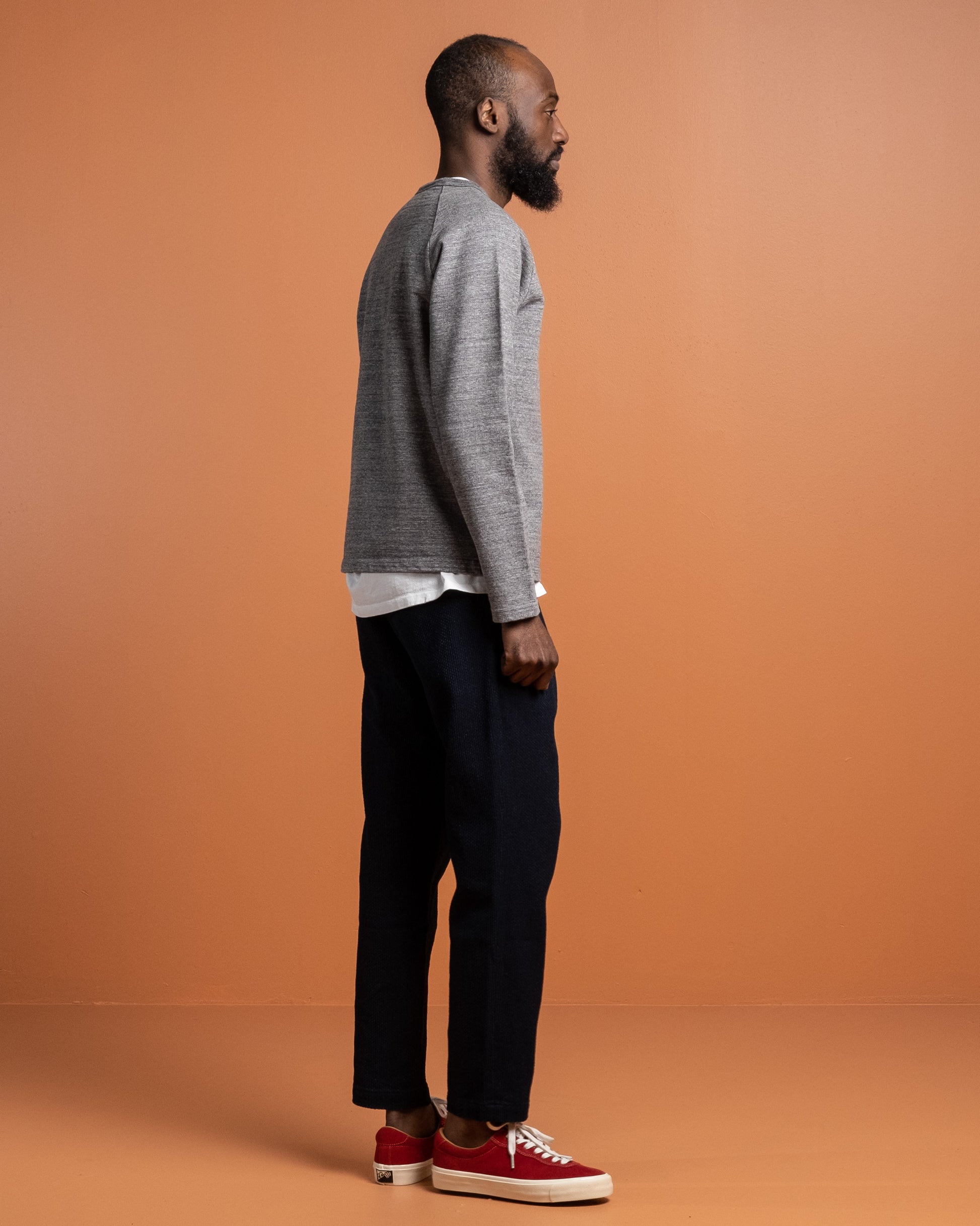 J6740J01 16.5 Oz Inlay Langærmet T-shirt i Charcoal fra Japan Blue Jeans. Skabt ved brug af vintage og komplekse strikketeknikker. Dejligt 16,5 oz bomuldsstof med vintage stil raglanærmer. Fremstillet i Japan.