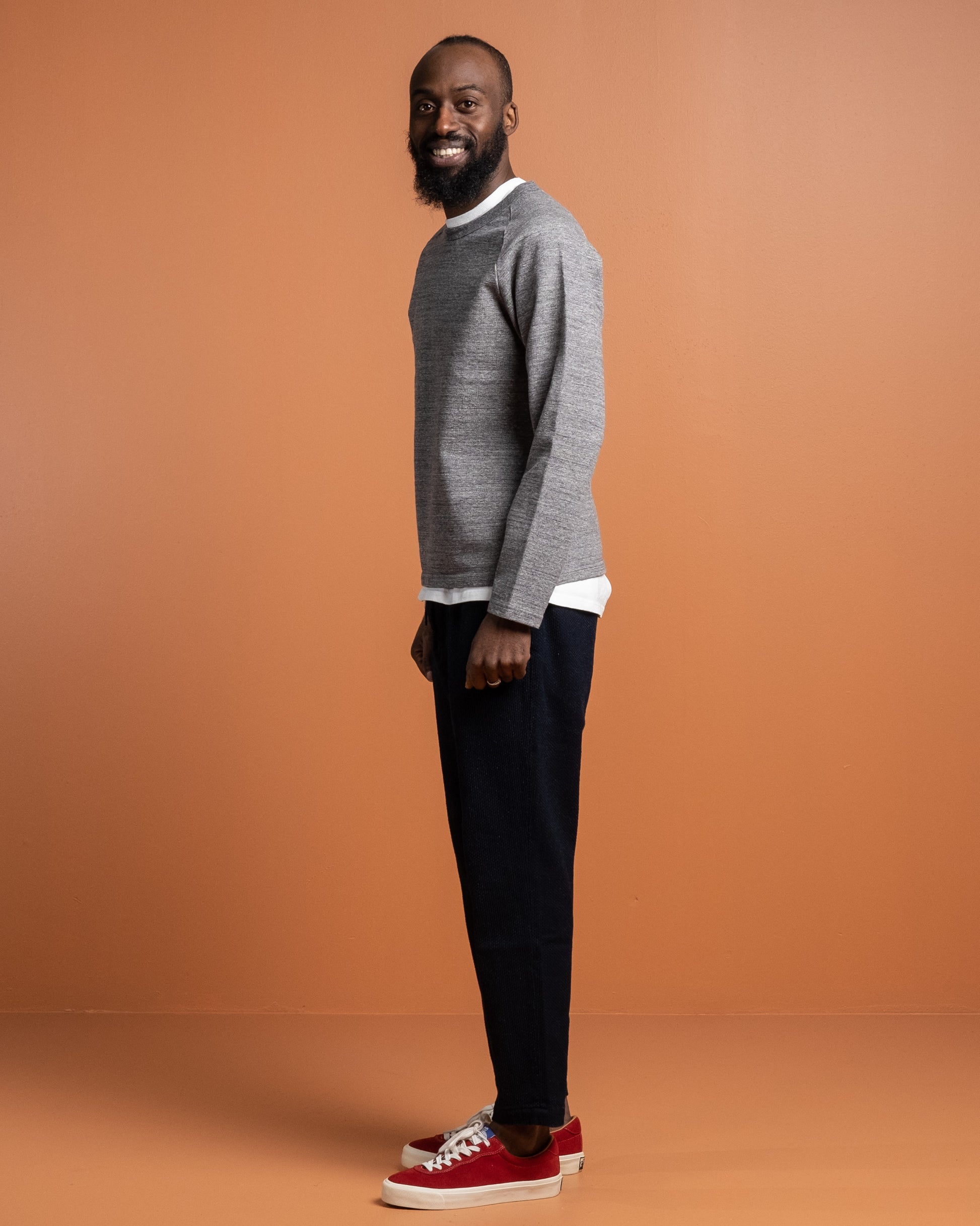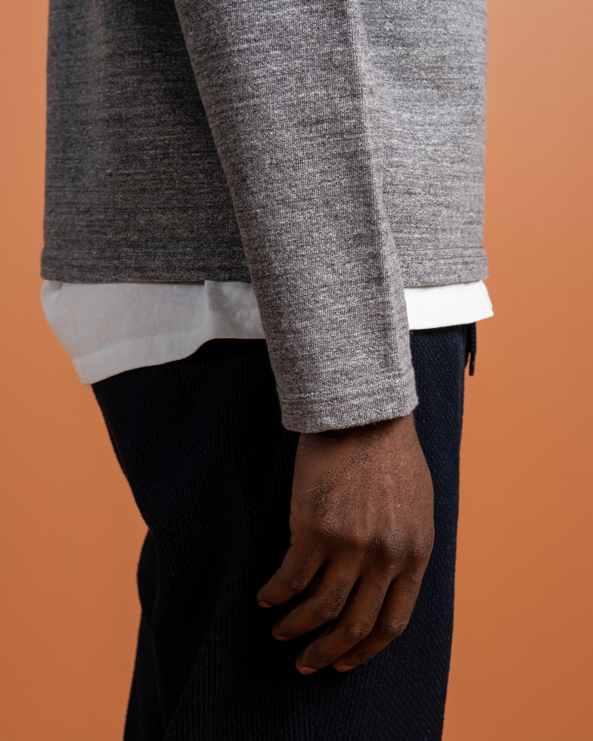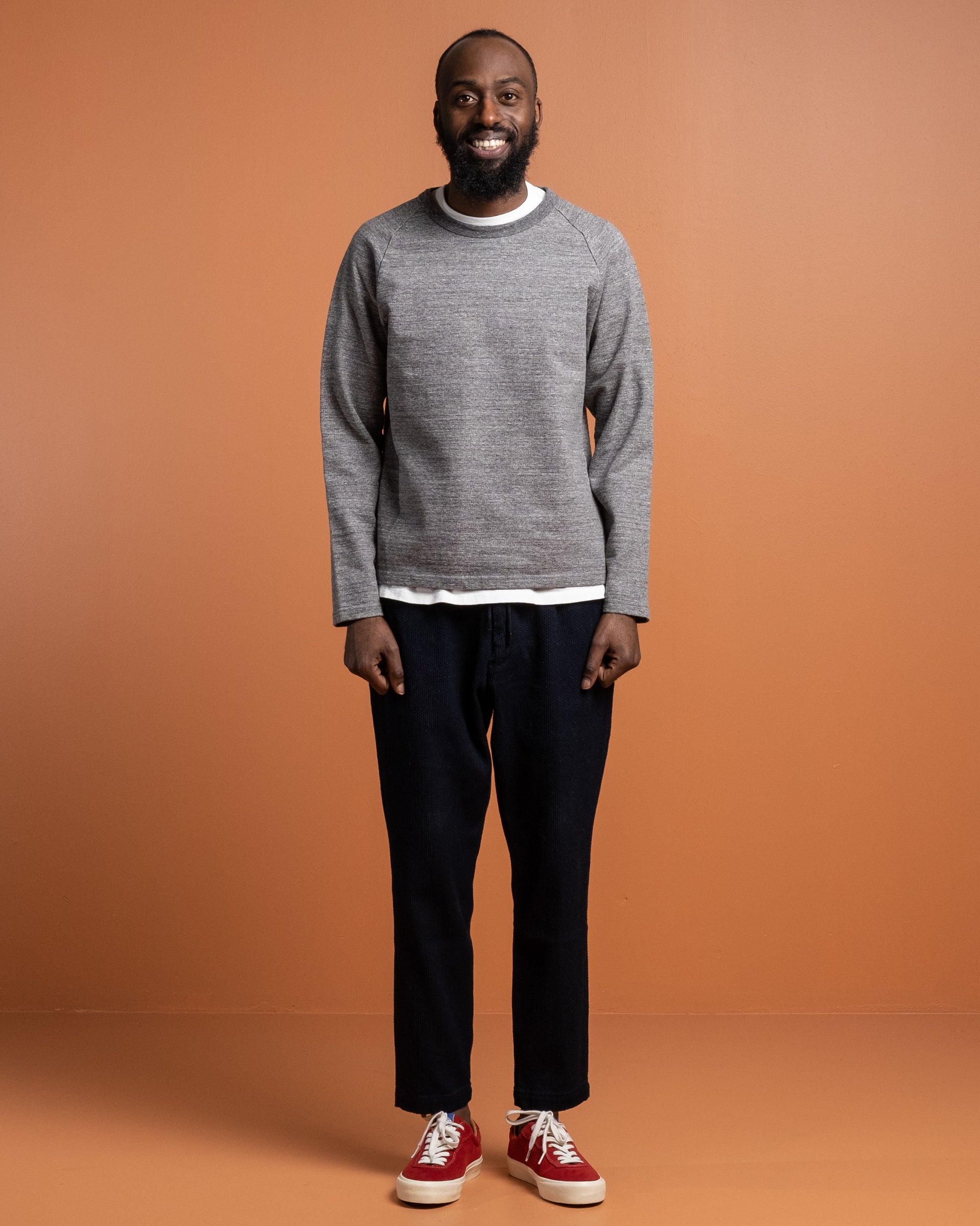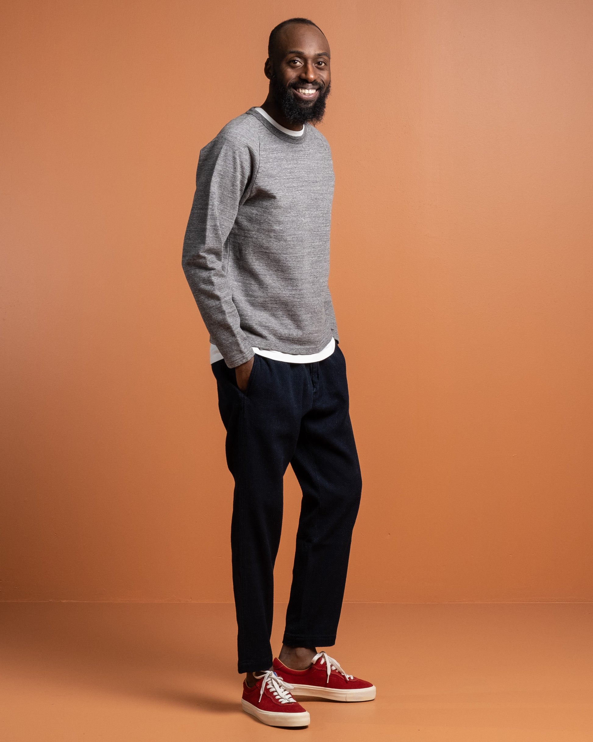 J6740J01 16.5 Oz Inlay Langærmet T-shirt i Charcoal fra Japan Blue Jeans. Skabt ved brug af vintage og komplekse strikketeknikker. Dejligt 16,5 oz bomuldsstof med vintage stil raglanærmer. Fremstillet i Japan.