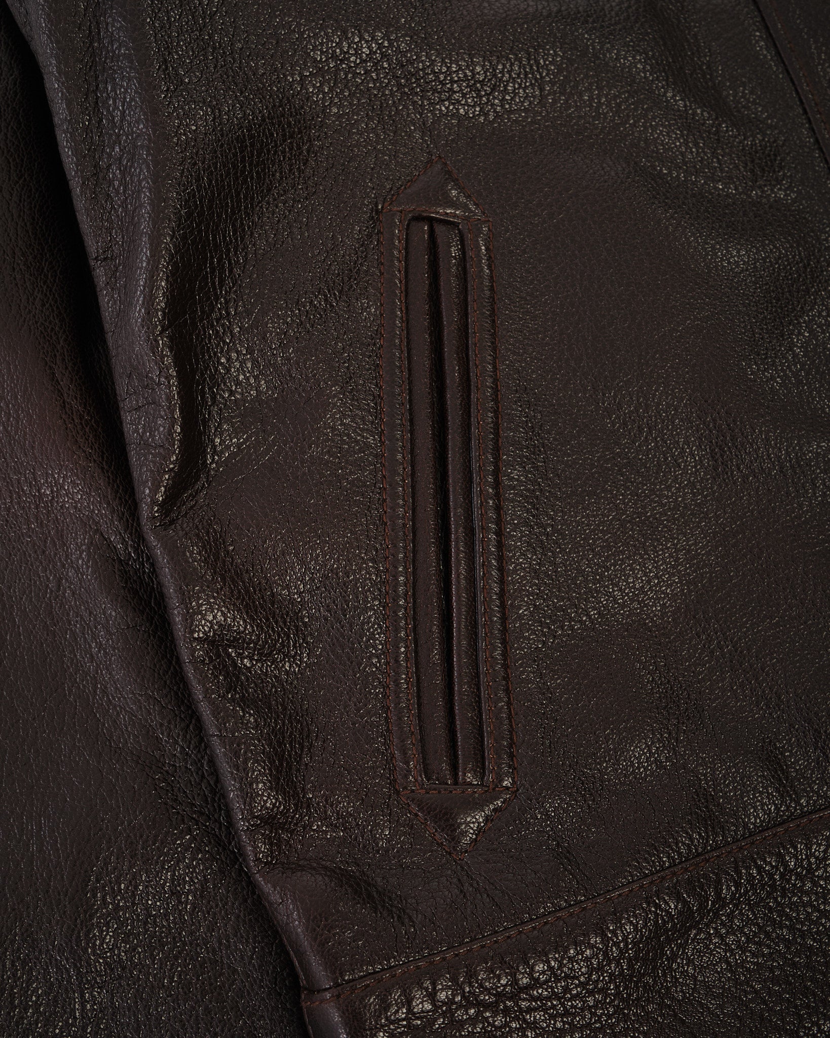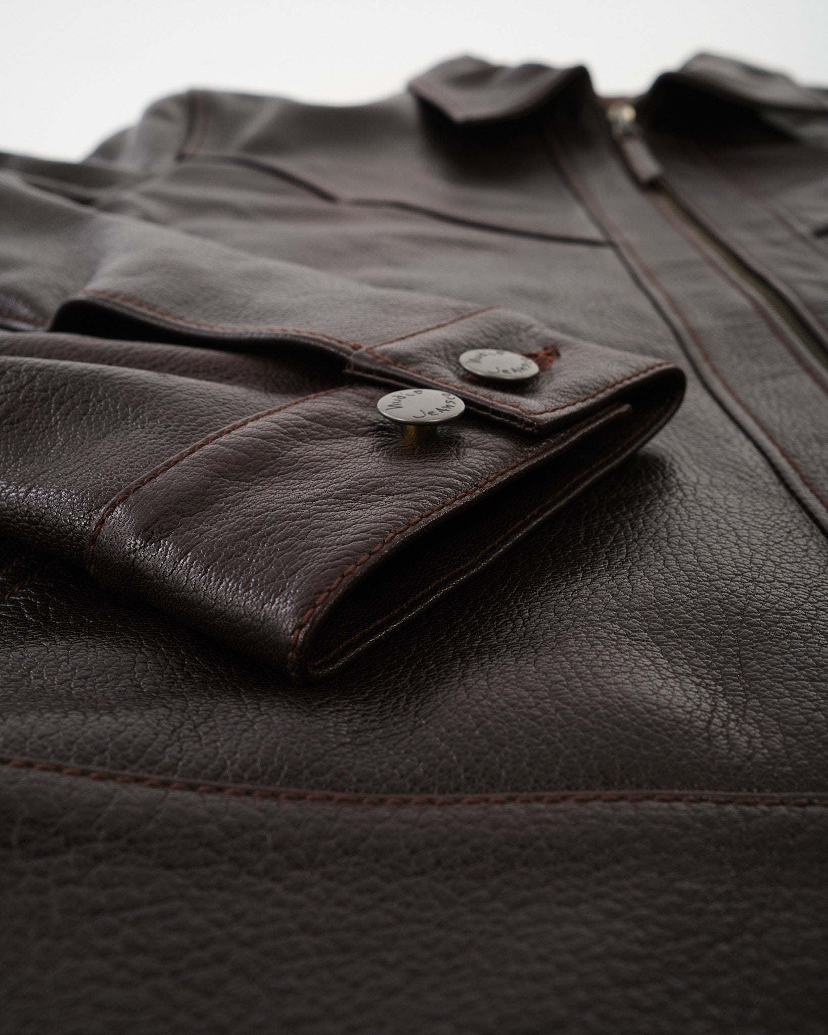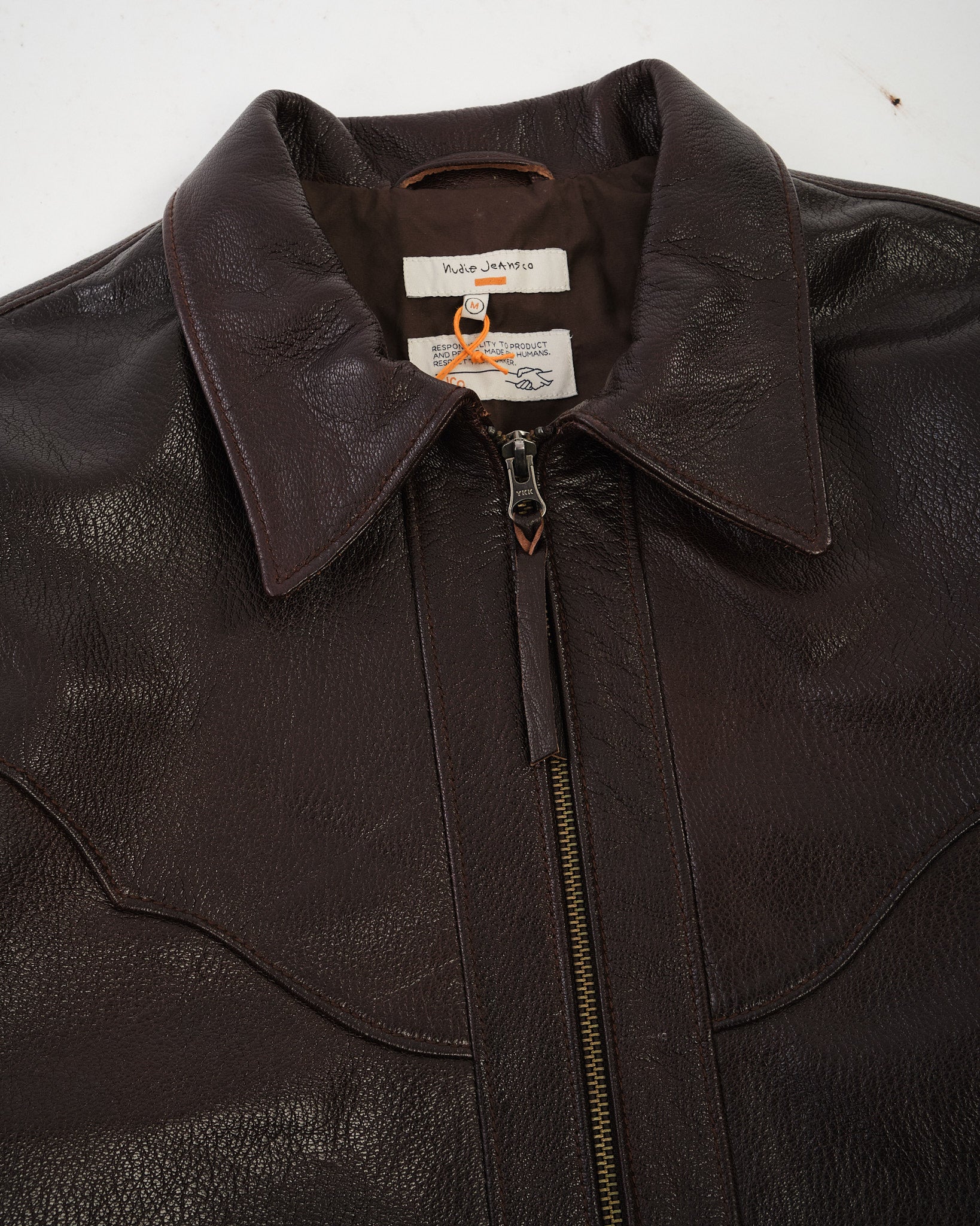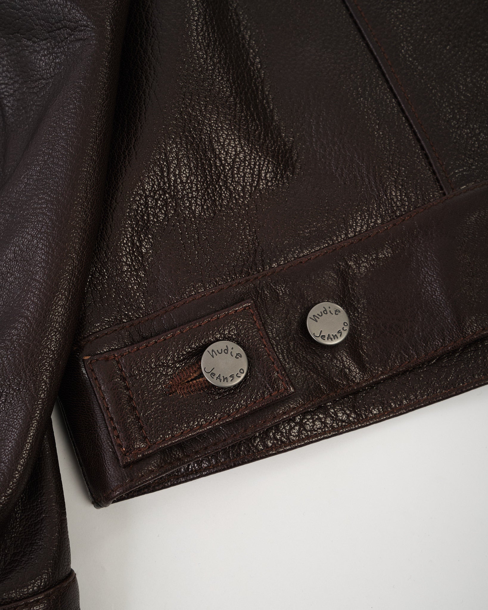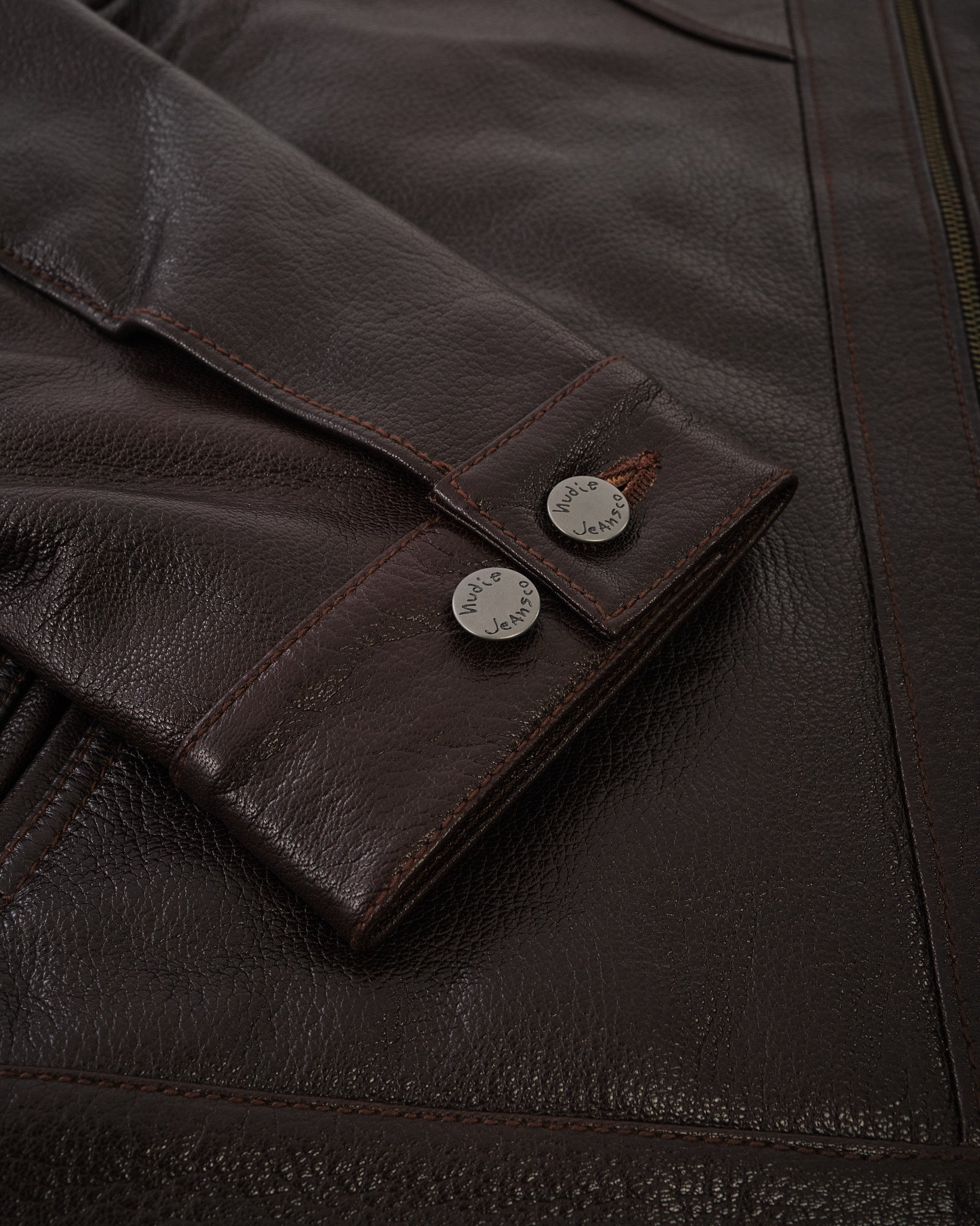 Den NUDIE JEANS CO. JOPPE WESTERN LEATHER JACKET BROWN er en tidløs, lige snittet læderjakke, fremstillet af blødt, semi-vegetabilsk garvet gedelæder. Den dybe chokoladebrune nuance er beriget med en fin glans, der forbedrer læderets rige karakter.