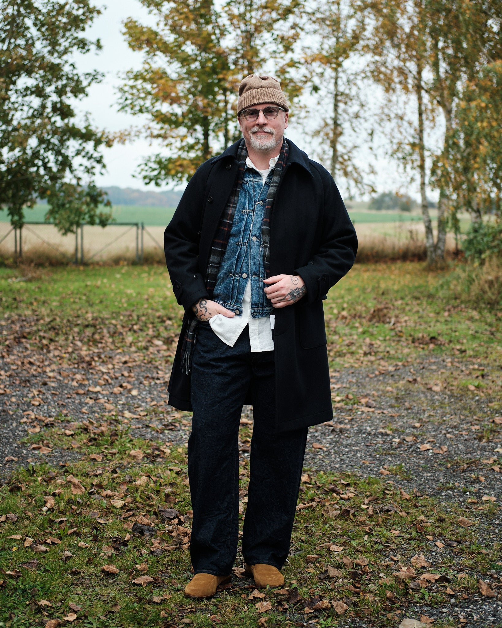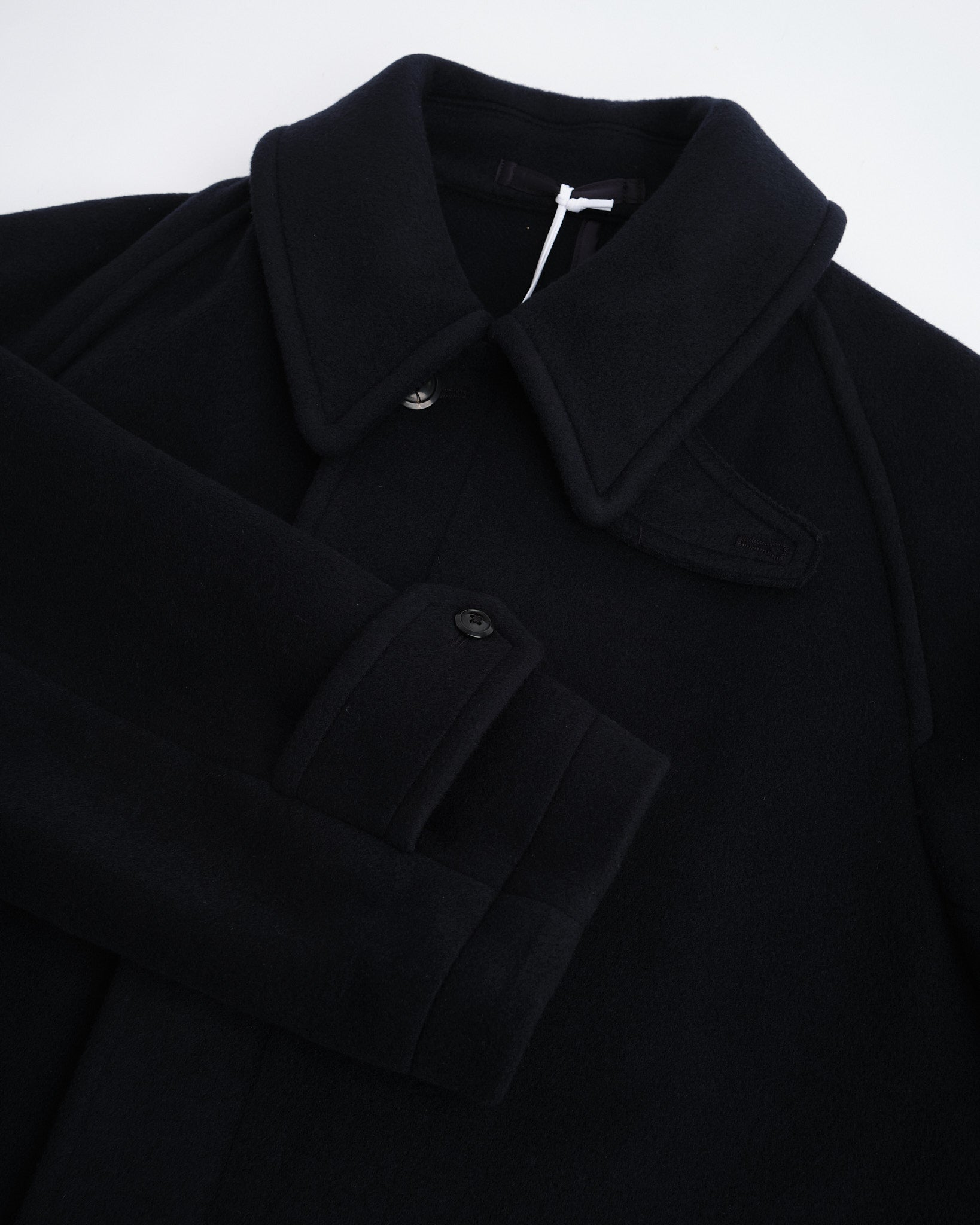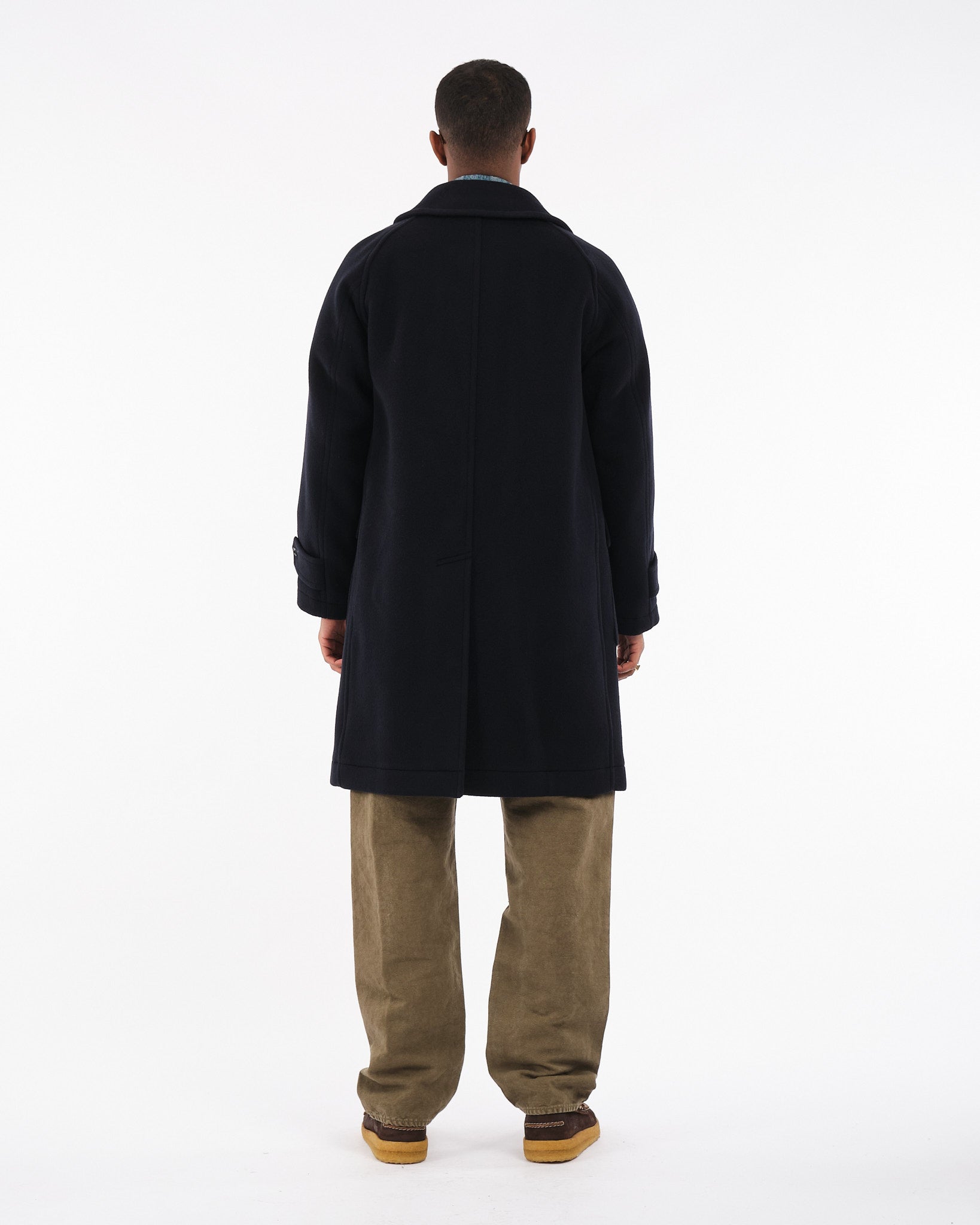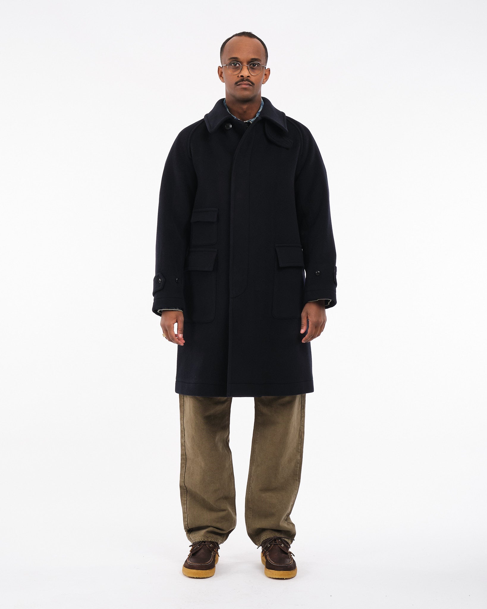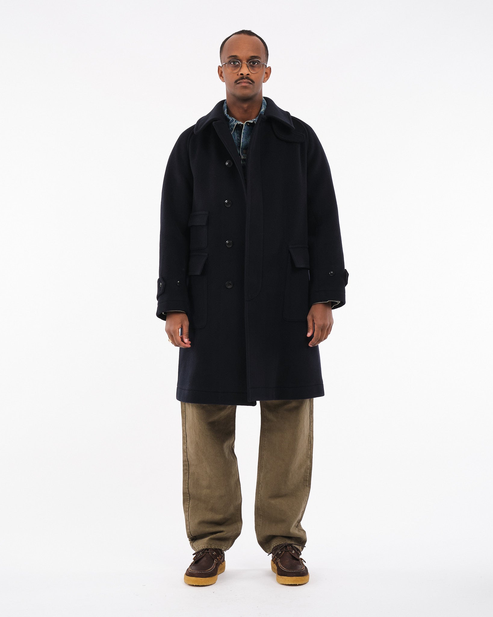 The KAPTAIN SUNSHINE Traveller Coat (KS25FCO03) i Navy er en perfekt kombination af luksus og funktionalitet. Fremstillet af en omvendt dobbeltklædet melton, er denne frakke vævet med ultrafine 16,5-mikron Super140's uldfibre, hvilket giver den ideelle balance mellem fasthed og lethed. Stoffet er farvet med bomuld for at opnå en rig, dyb farve, mens den tætte vævning sikrer, at frakken forbliver blød, skinnende-fyldt og elegant smidig.