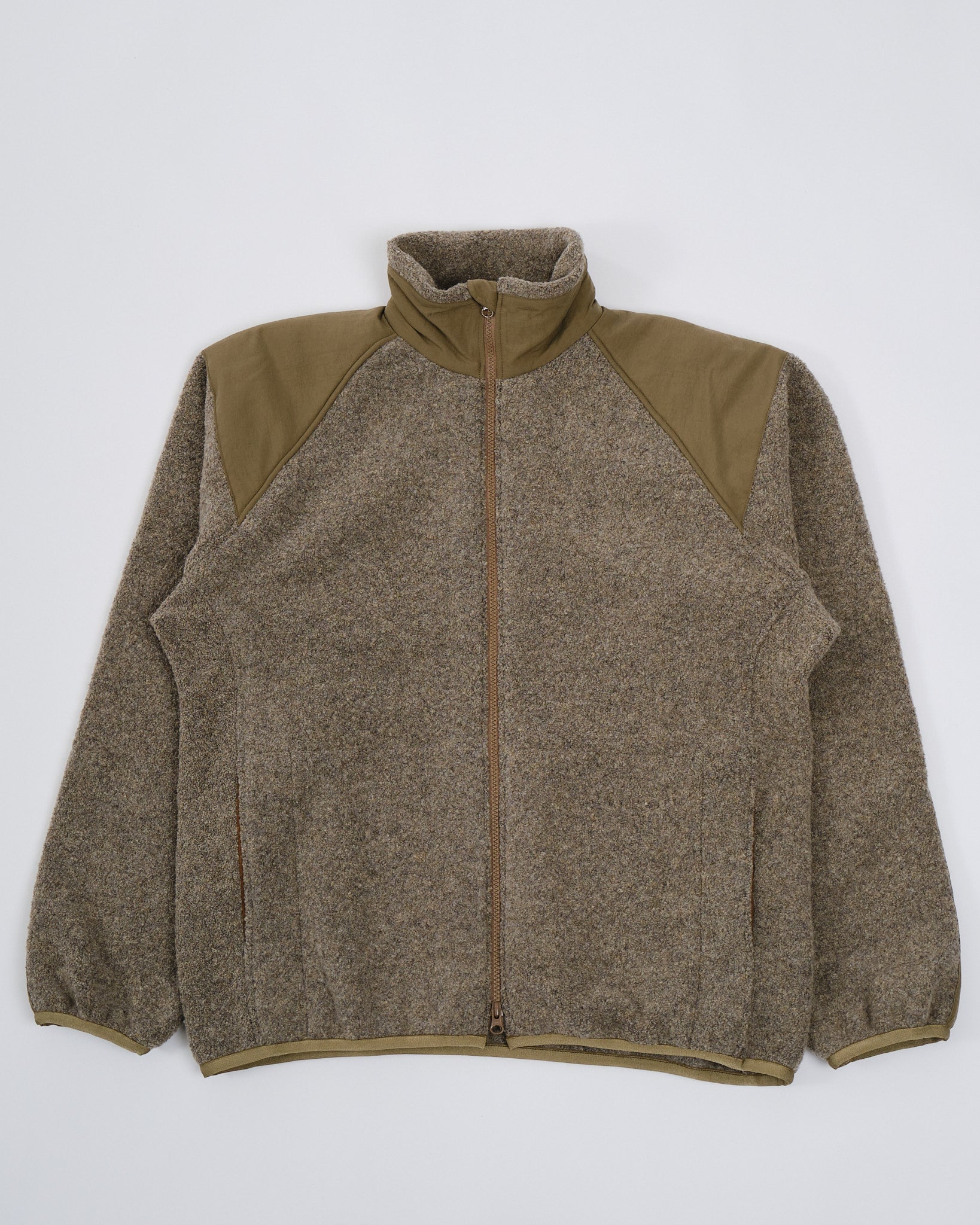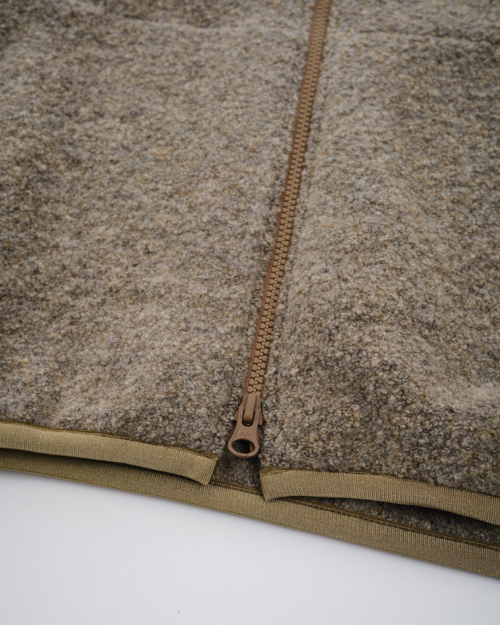 Forkæl dig selv med en nostalgisk følelse med Nanamica Boiled Wool Zip Up Sweater i Coyote. Denne zip-up sweater er omhyggeligt håndlavet i Japan ved hjælp af en unik teknik. Uldgarnene er bevidst løkket på overfladen, derefter strikket og skrumpet for at skabe en tekstur, der bringer minder tilbage om klassisk udendørstøj.