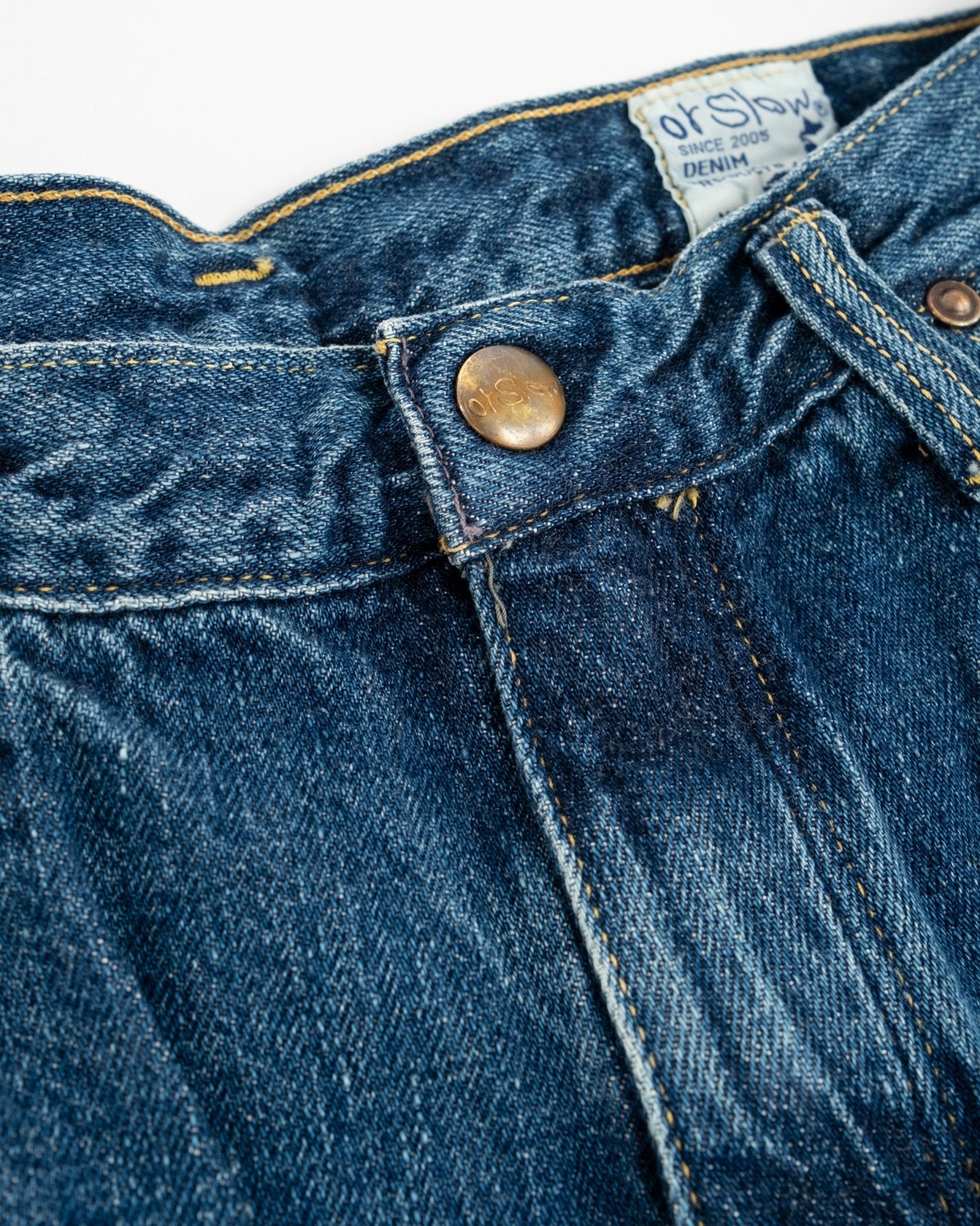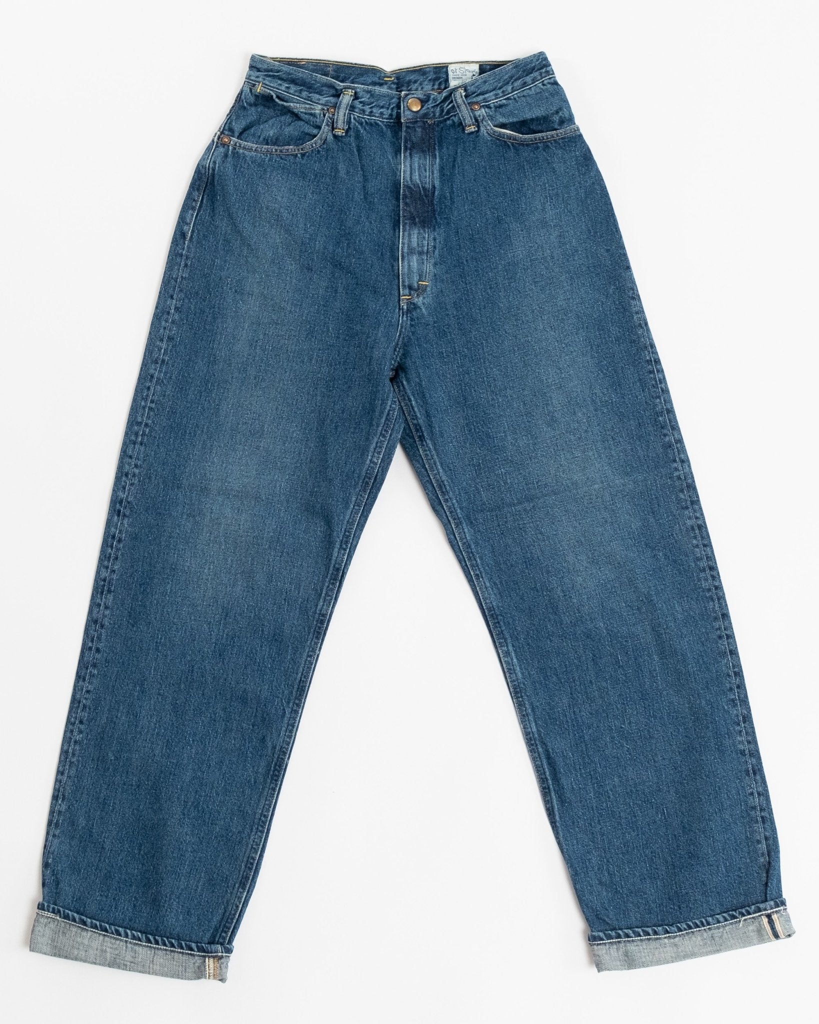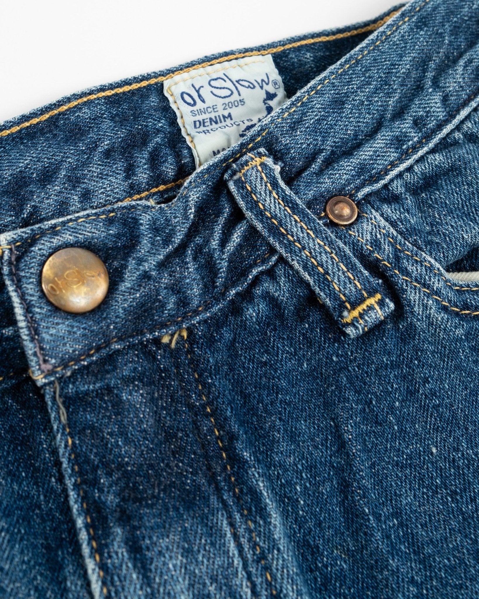 Inspireret af 1950'erne, med høj talje, længere længde, bredere lår og lige ben. Denim fra den tid var designet til at følge kroppens kurver og være behagelig nok til at have på hver dag. Denne form for denim er perfekt for dem, der ofte finder denim for 'stor' i taljen eller for stram om lårene, da de er designet med en let kurve, derfor 'kurvet søm'. Lavet af 13,5 oz denim specialfremstillet for orSlow, og vasket én gang, vil denimstoffet føles blødt fra første brug, og denne vaskeproces fremhæver en smuk blå farve i denimstoffet. Denimstoffet er blevet vasket, så benene vil se en smule snoede ud, typisk for vintage denim, og dette betyder også, at denimstoffet ikke vil krympe. Knapflue. 100% bomuld. Fremstillet i Japan.